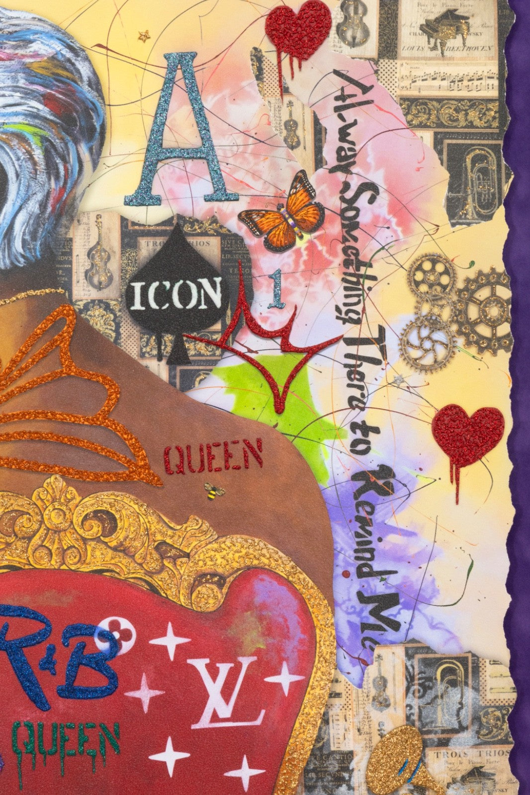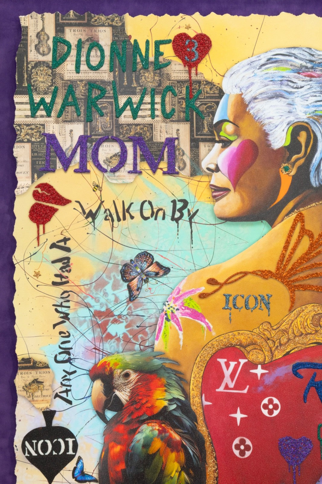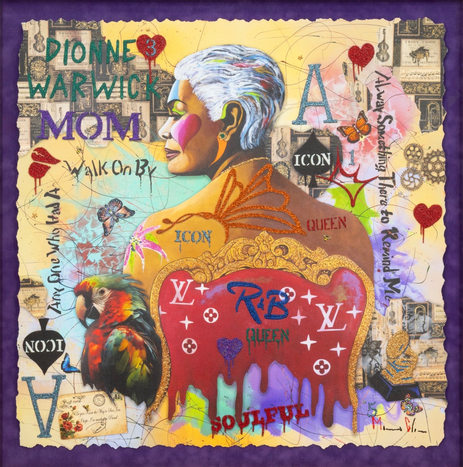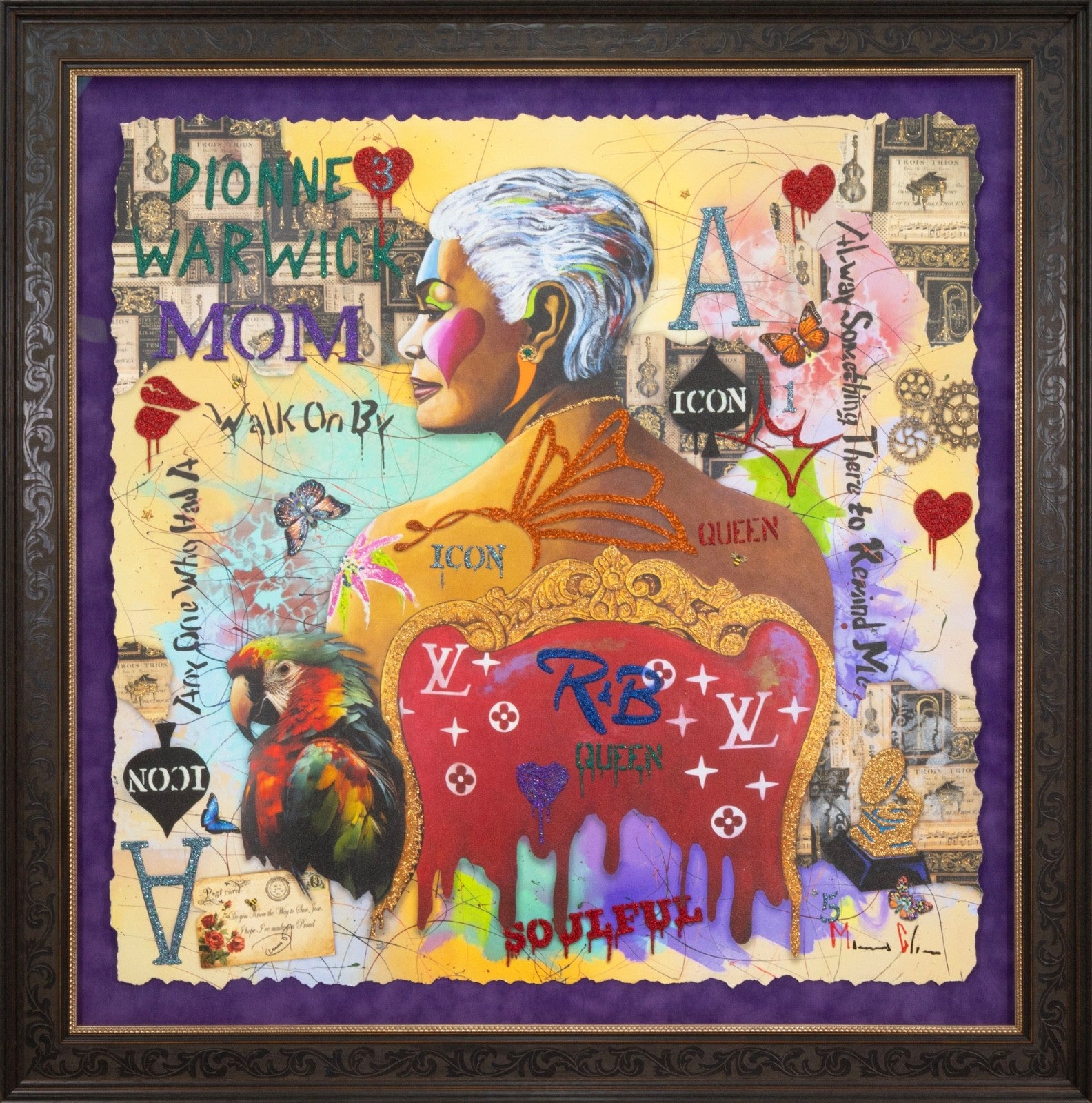 A contemporary giclée on paper with hand-applied "diamond dust" embellishments titled "Always Something There to Reming Me" by Marcus Glenn. Hand signed by the artist lower right, with the signature of Dionne Warwick lower left. "From The Last Album - Duets" series. This artwork depicts a stylized portrait of Dionne Warwick shown in profile. The composition includes layered imagery and text elements such as "Dionne Warwick," "Mom," and "Icon," along with additional motifs including a bird, butterflies, hearts, and decorative forms. The edition of 12 was created to commemorate Dionne Warwick’s birthday, December 12. An opportunity to acquire a collaborative work associated with Marcus Glenn and Dionne Warwick.