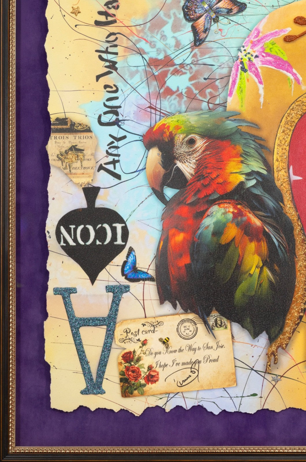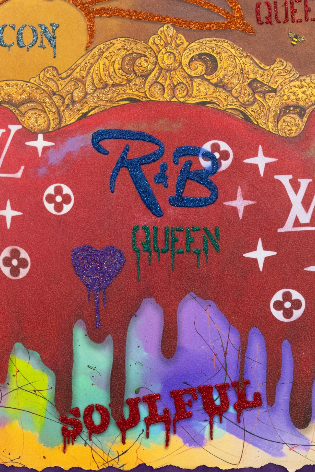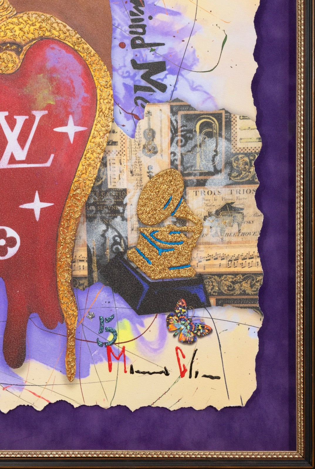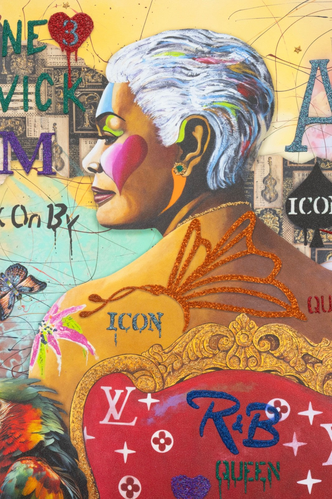 A contemporary giclée on paper with hand-applied "diamond dust" embellishments titled "Always Something There to Reming Me" by Marcus Glenn. Hand signed by the artist lower right, with the signature of Dionne Warwick lower left. "From The Last Album - Duets" series. This artwork depicts a stylized portrait of Dionne Warwick shown in profile. The composition includes layered imagery and text elements such as "Dionne Warwick," "Mom," and "Icon," along with additional motifs including a bird, butterflies, hearts, and decorative forms. The edition of 12 was created to commemorate Dionne Warwick’s birthday, December 12. An opportunity to acquire a collaborative work associated with Marcus Glenn and Dionne Warwick.