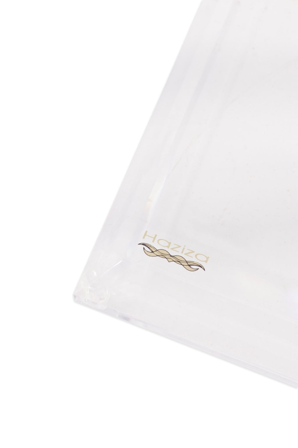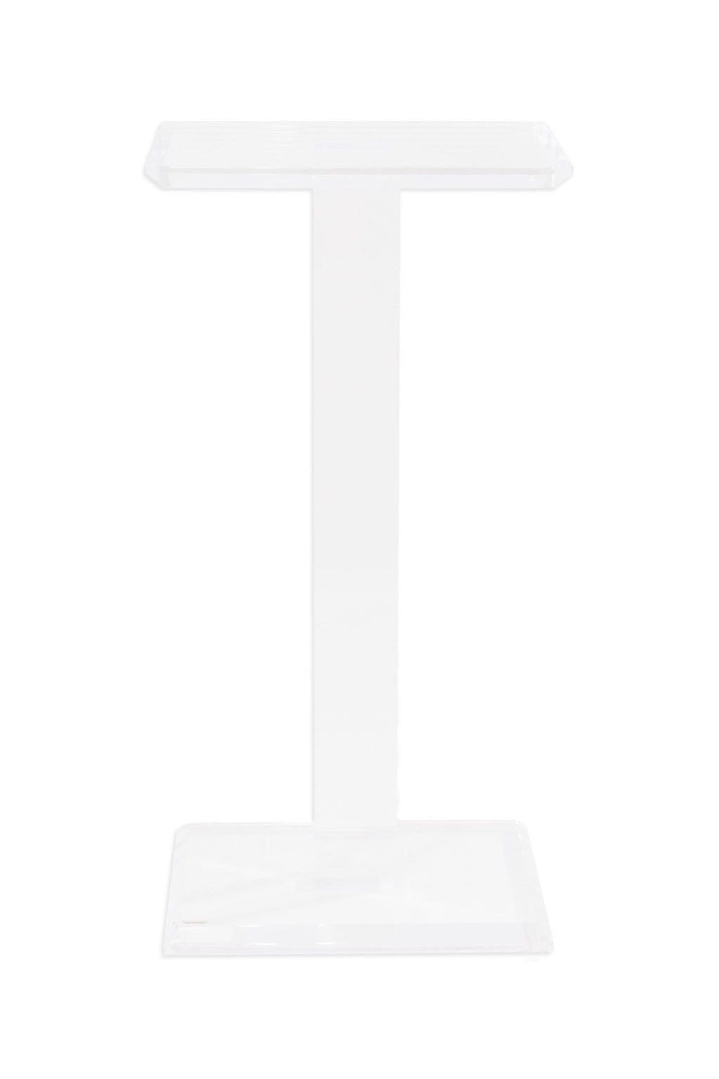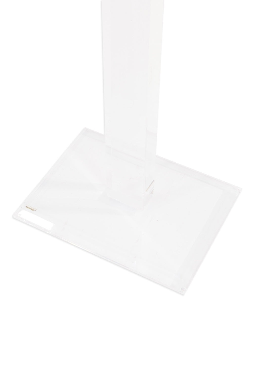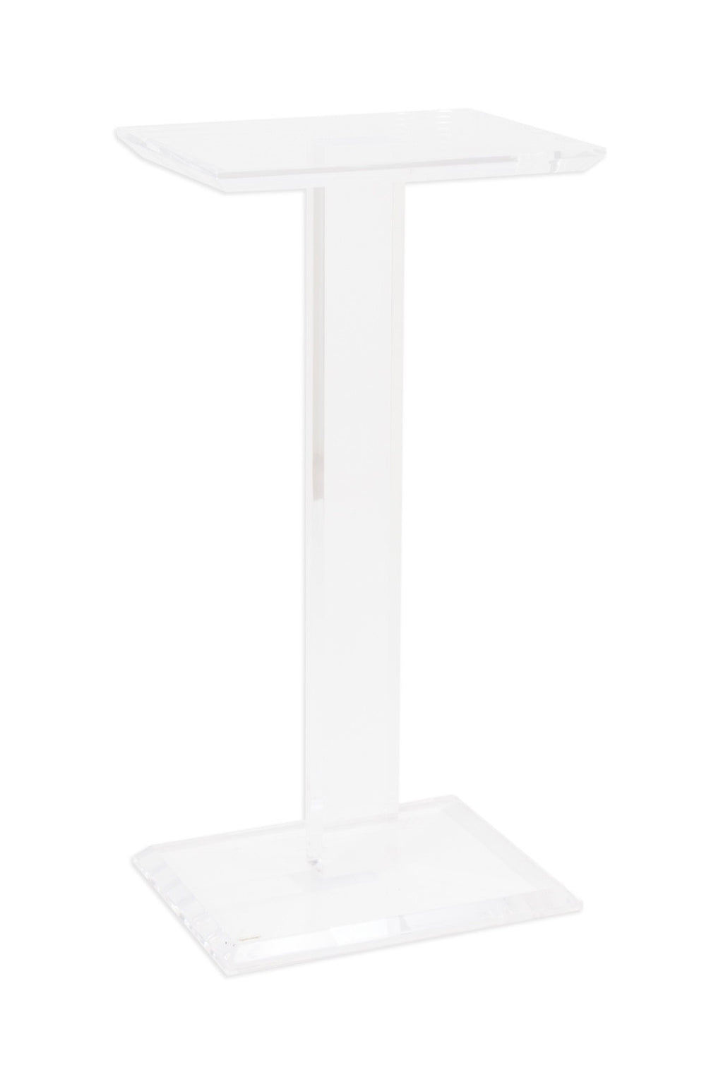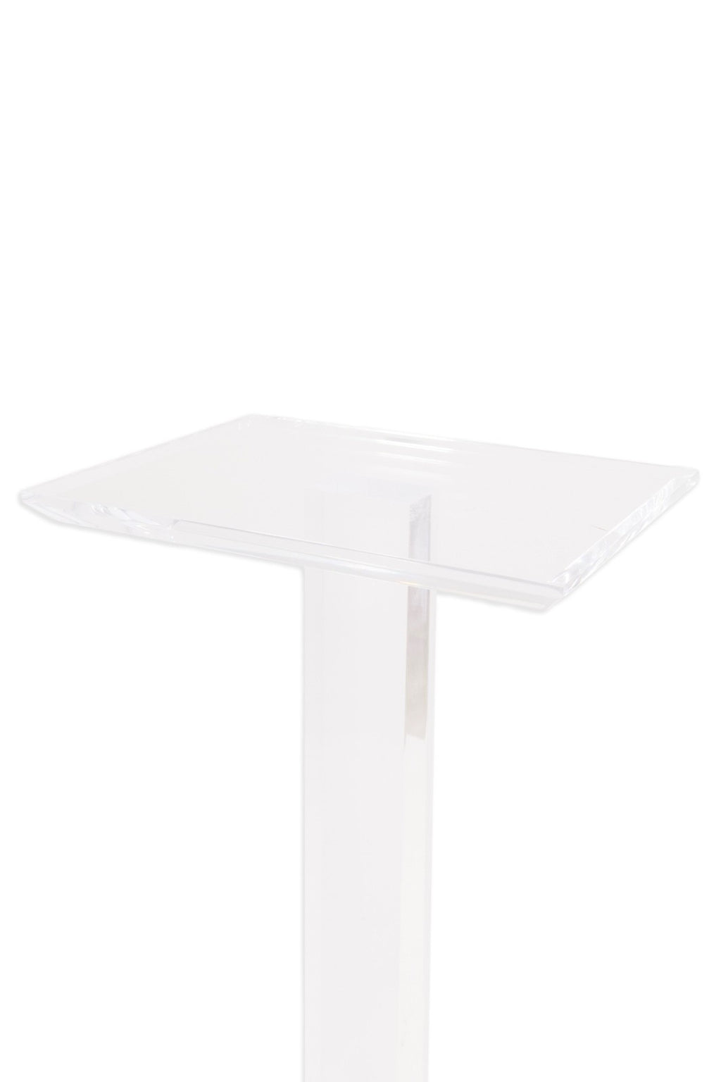 A striking Mid Century Modern pedestal table crafted from clear Lucite, showcasing Haziza’s signature sculptural clarity and modernist appeal. The table features a rectangular top supported by a sleek central column and a solid rectangular base, all seamlessly constructed for a floating, light-filled effect. Its transparent form makes it a versatile piece that blends effortlessly with contemporary or minimalist interiors, serving beautifully as a side table, display stand, or accent pedestal. The table has visible signs of wear that are consistent with its age, The table is 32 inches in height, 16 inches in width and 12 inches in depth.
