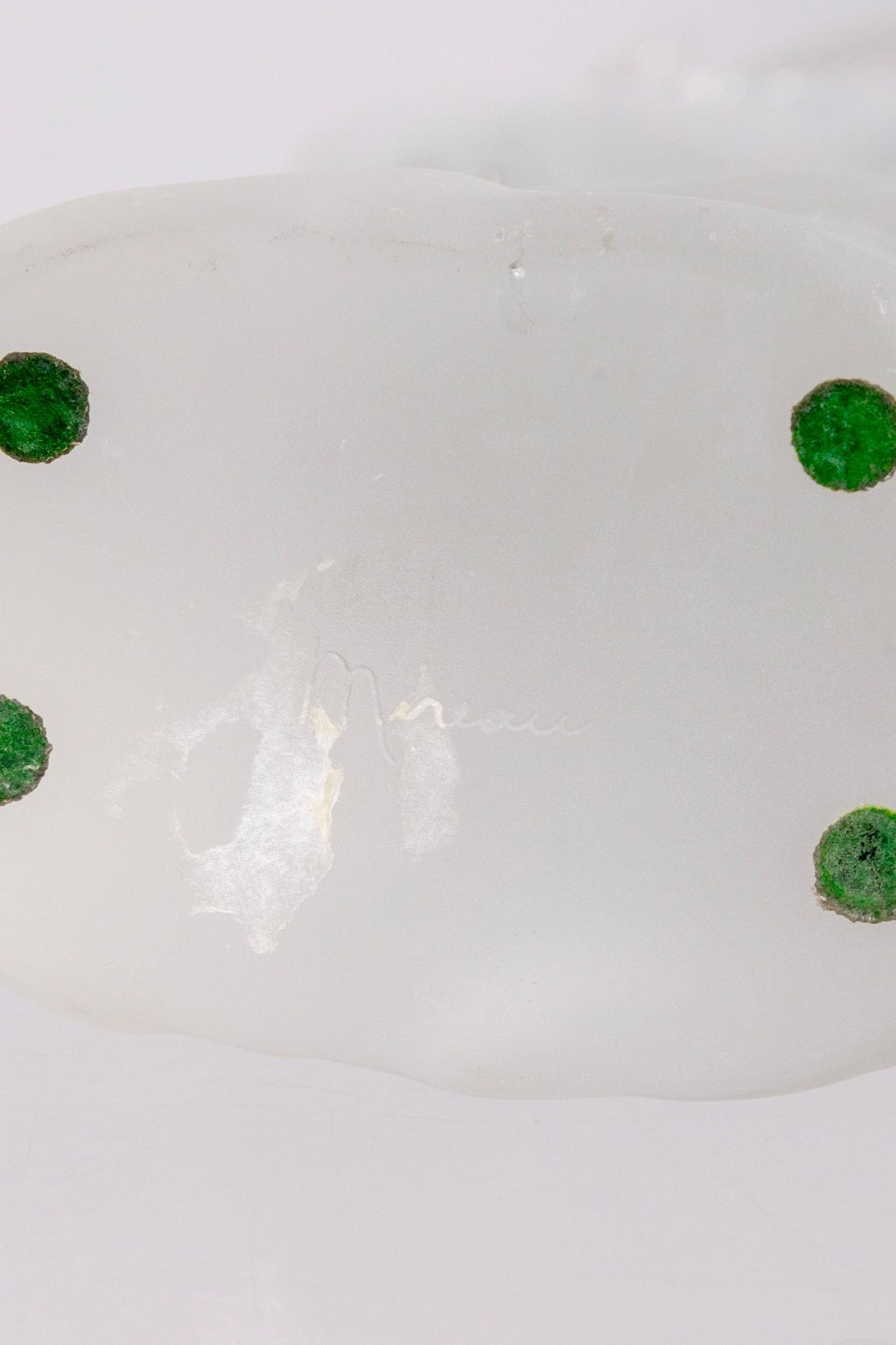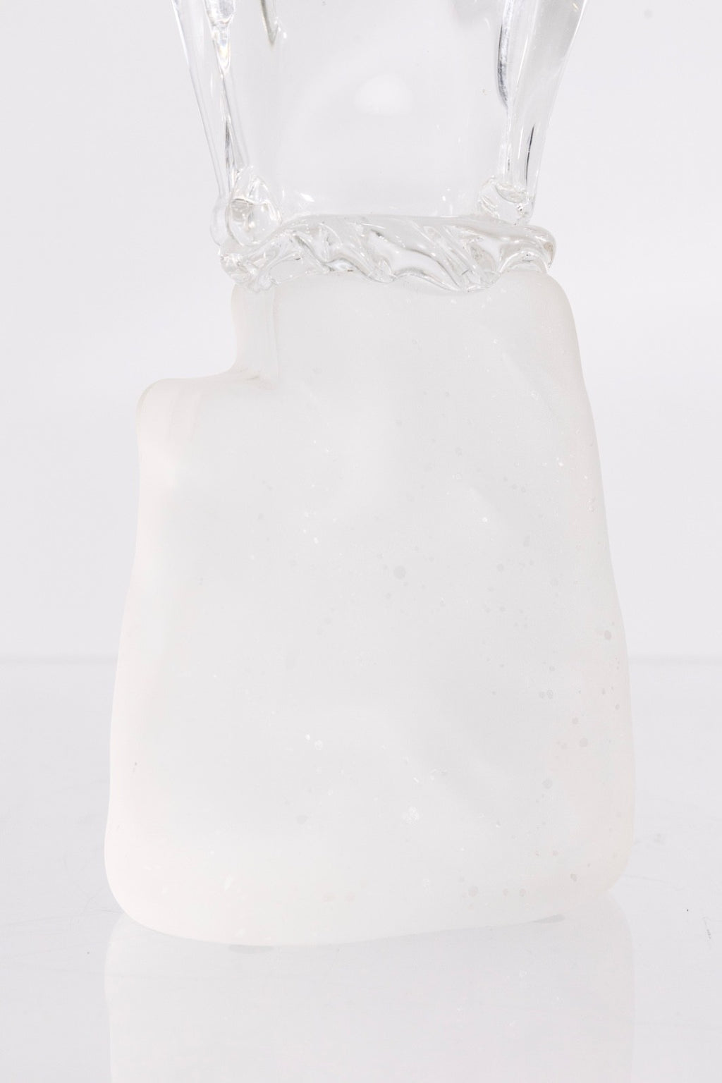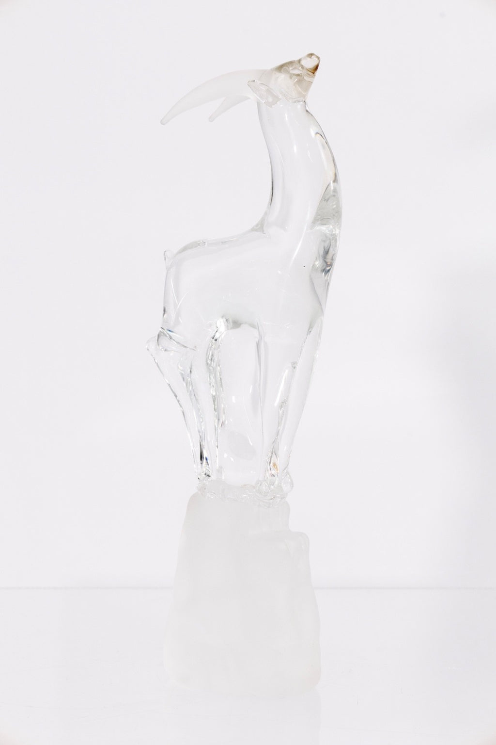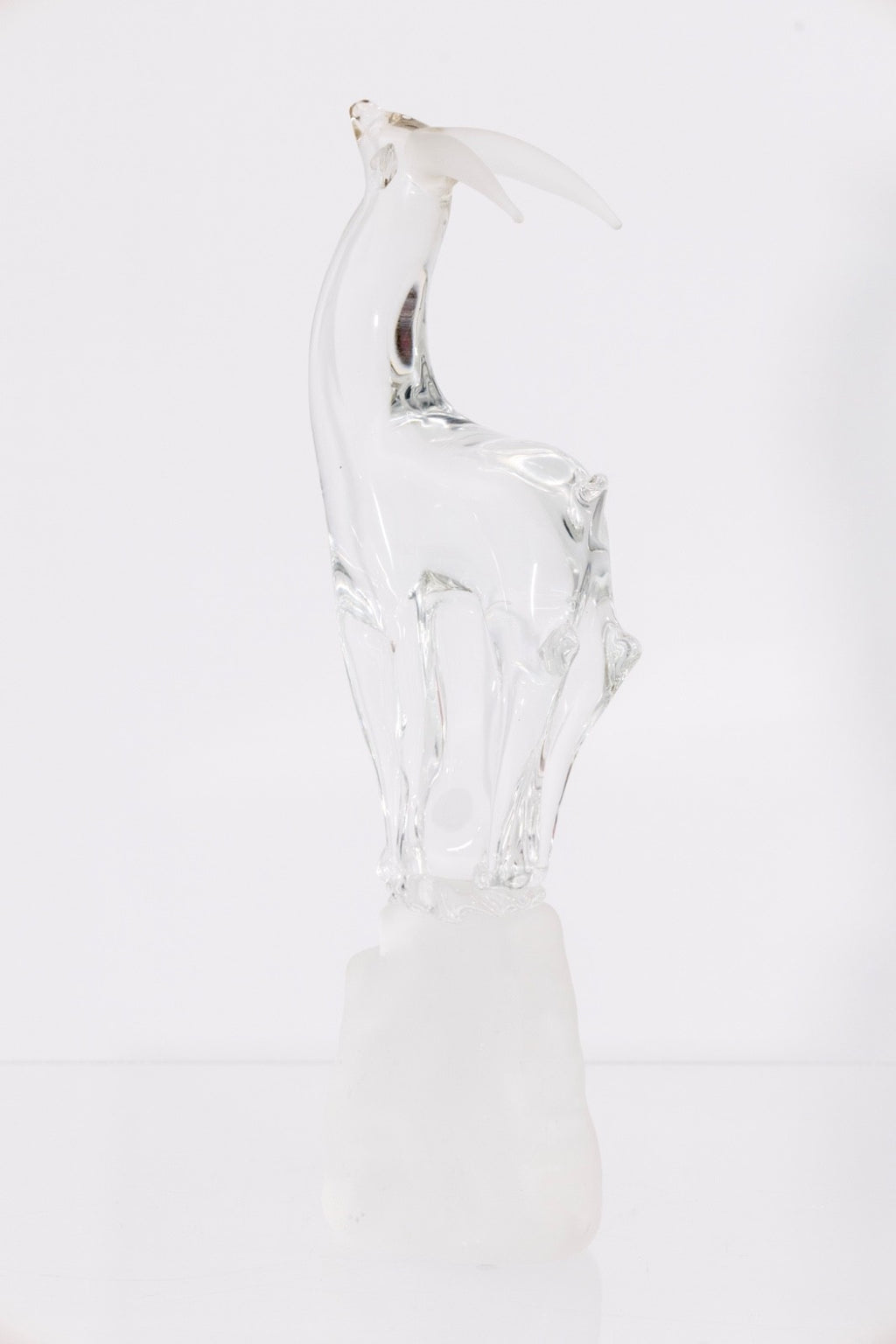 Elegant and refined, this Mid Century Modern signed clear art glass antelope sculpture captures the grace and poise of the animal through a fluid, minimalist form. The clear glass body is beautifully sculpted with elongated lines and curved horns, resting atop a frosted glass base that adds subtle contrast and texture. A signature on the base marks the artist’s hand, further enhancing its collectible appeal. A striking example of Modernist art glass design, this sculpture embodies the timeless sophistication of mid-20th century craftsmanship. The sculpture is in good condition and measures at 20 inches in height, 6 inches in width and 3.5 inches in depth.