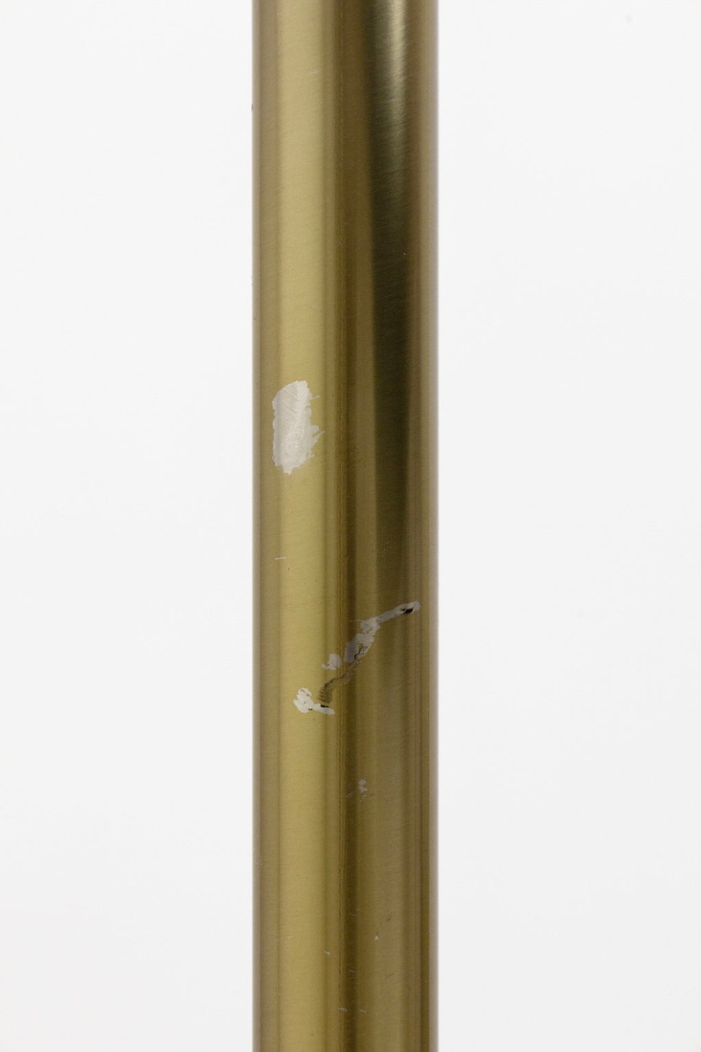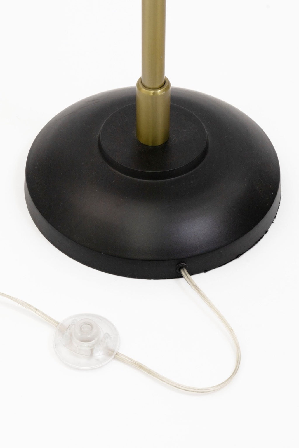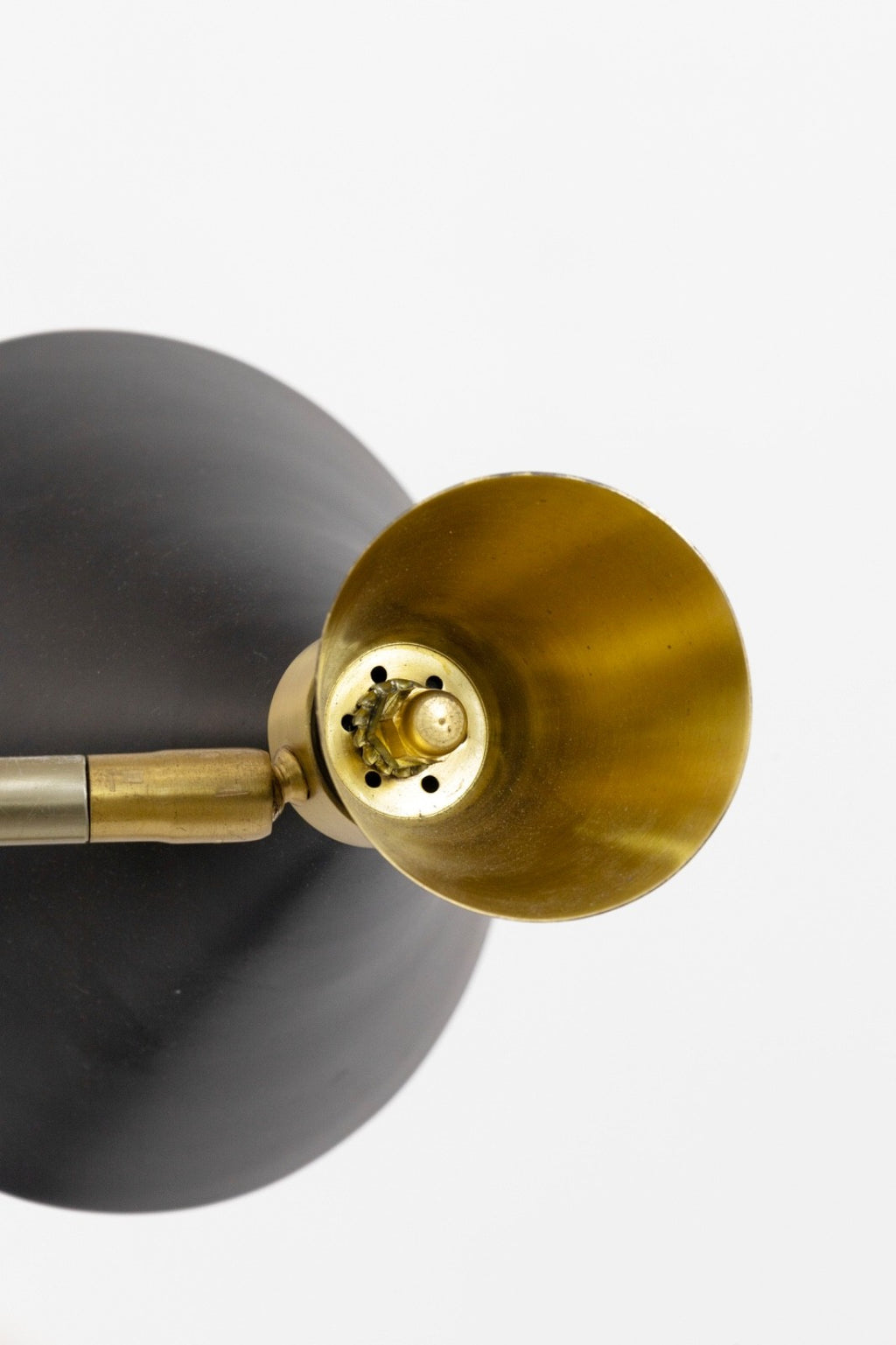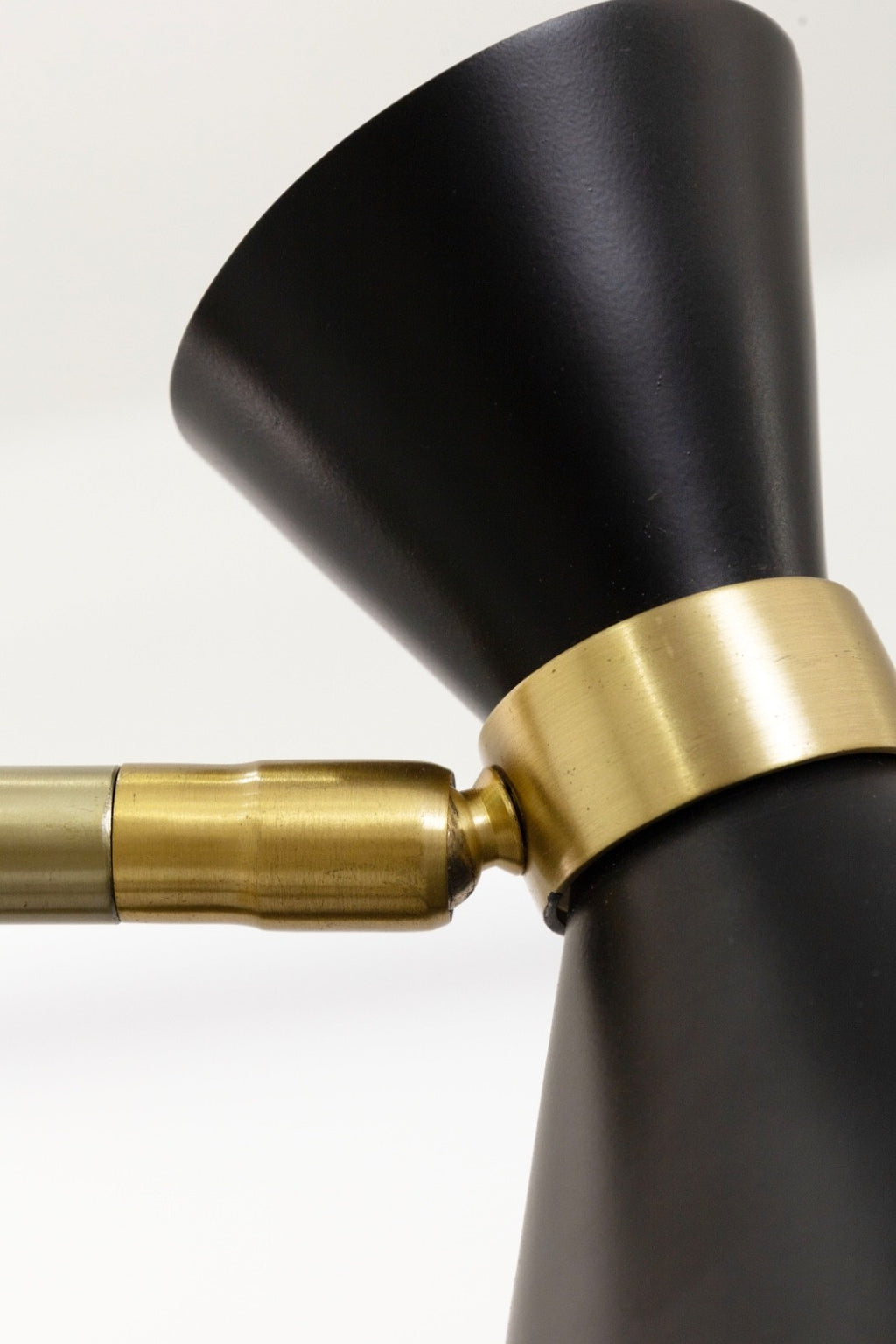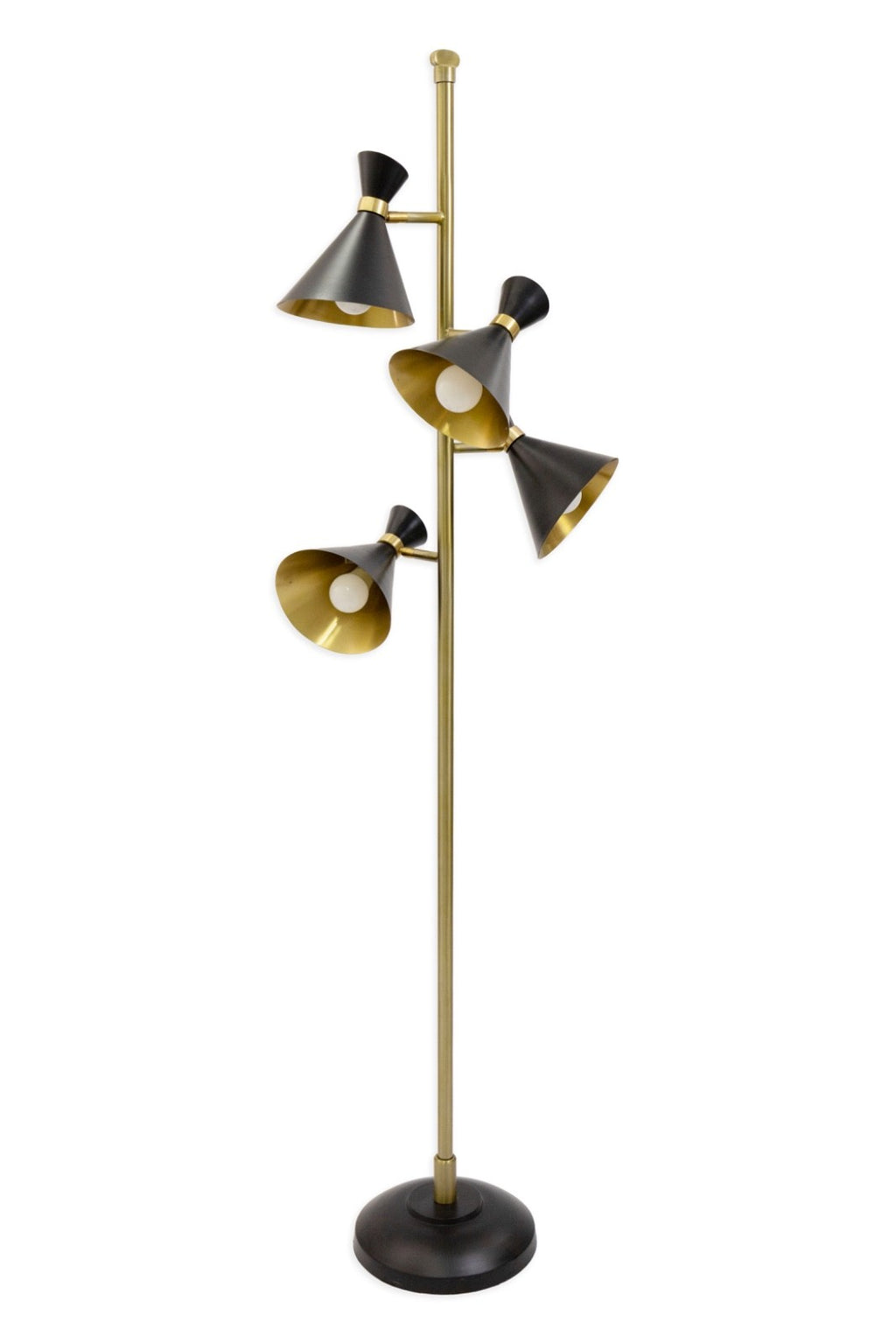 This striking Mid Century Modern style floor lamp features a sleek brass stem paired with four sculptural black metal cone shades, each finished with a warm brass interior that enhances the glow. The shades are individually adjustable, allowing you to direct light exactly where it’s needed—perfect for creating layered illumination in a living room, office, or reading corner. The staggered arrangement of the cones adds a dynamic, architectural quality, while the weighted black base provides stability and a clean silhouette. A refined blend of form and function, this four-shade lamp brings timeless modernist character to any interior. The lamp has some slight chipping on the stem, additionally the lamp measures 74 inches tall, 18.5 inches in width and 18.5 inches in depth.