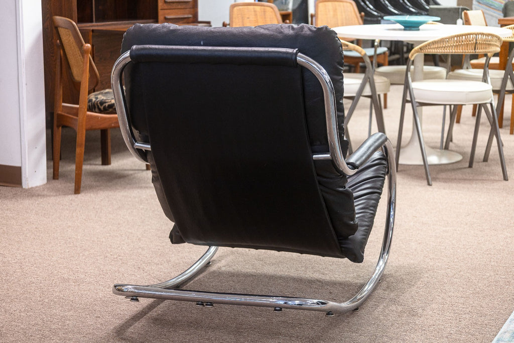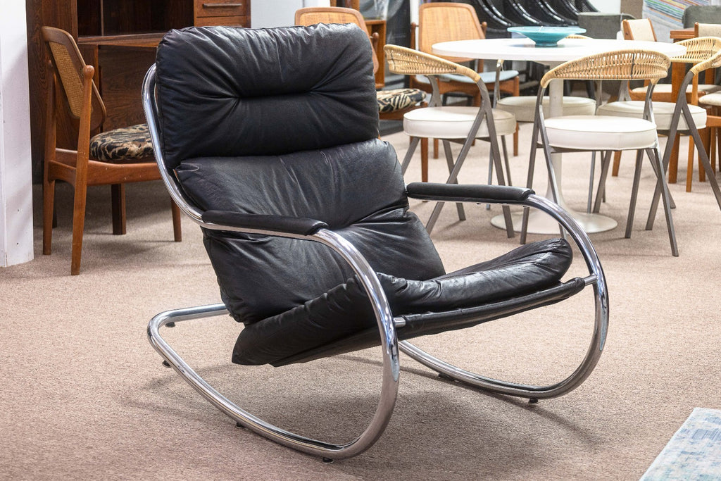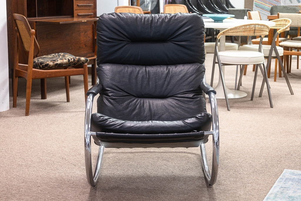 Milo Baughman for DIA Black Leather and Tubular Chrome Vintage Rocker & Ottoman