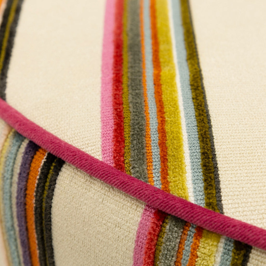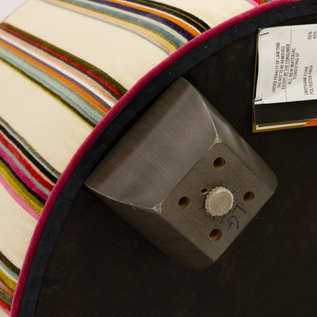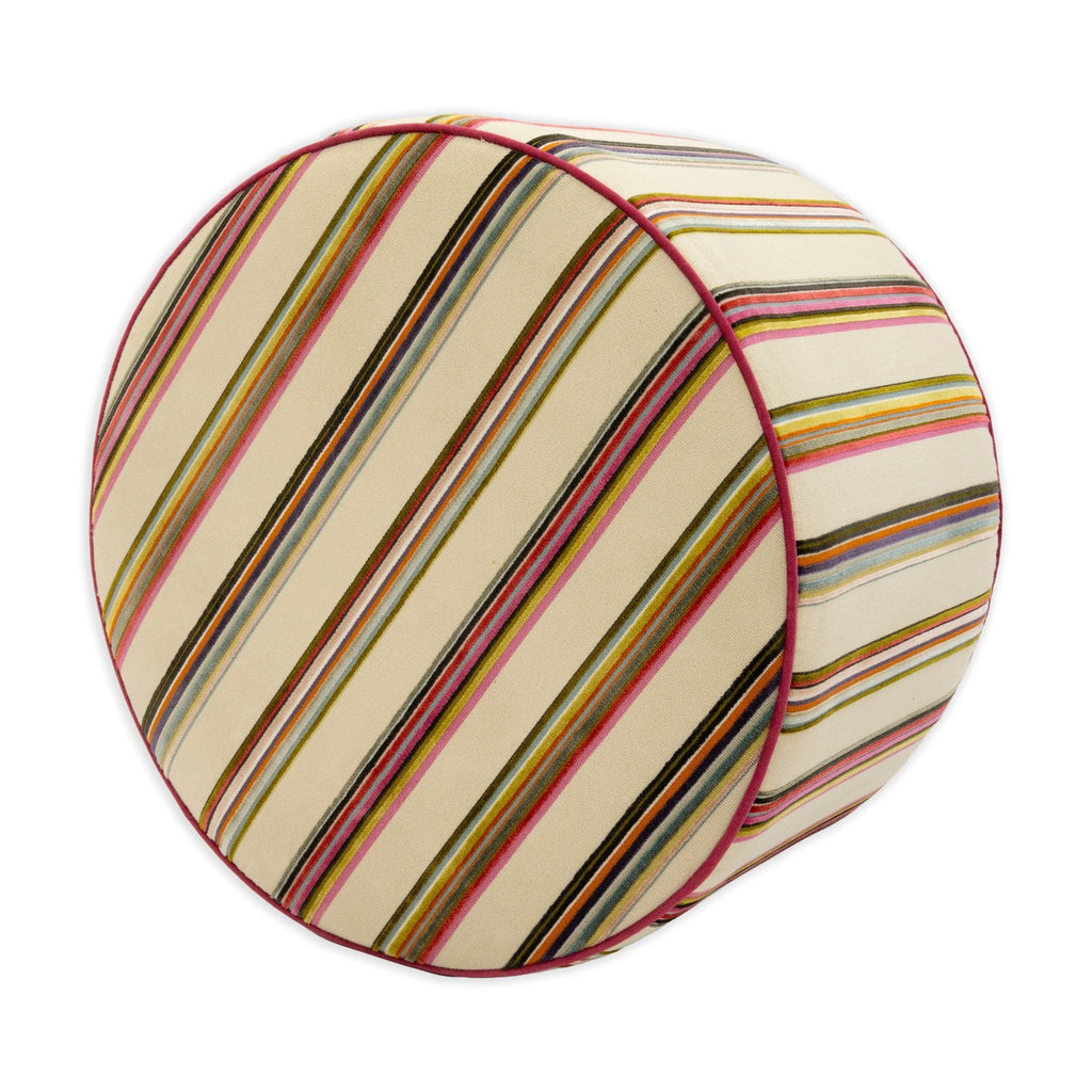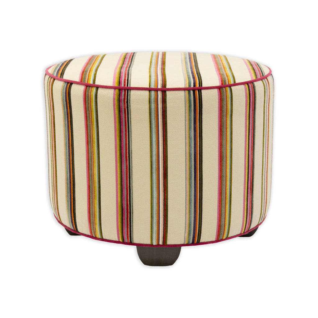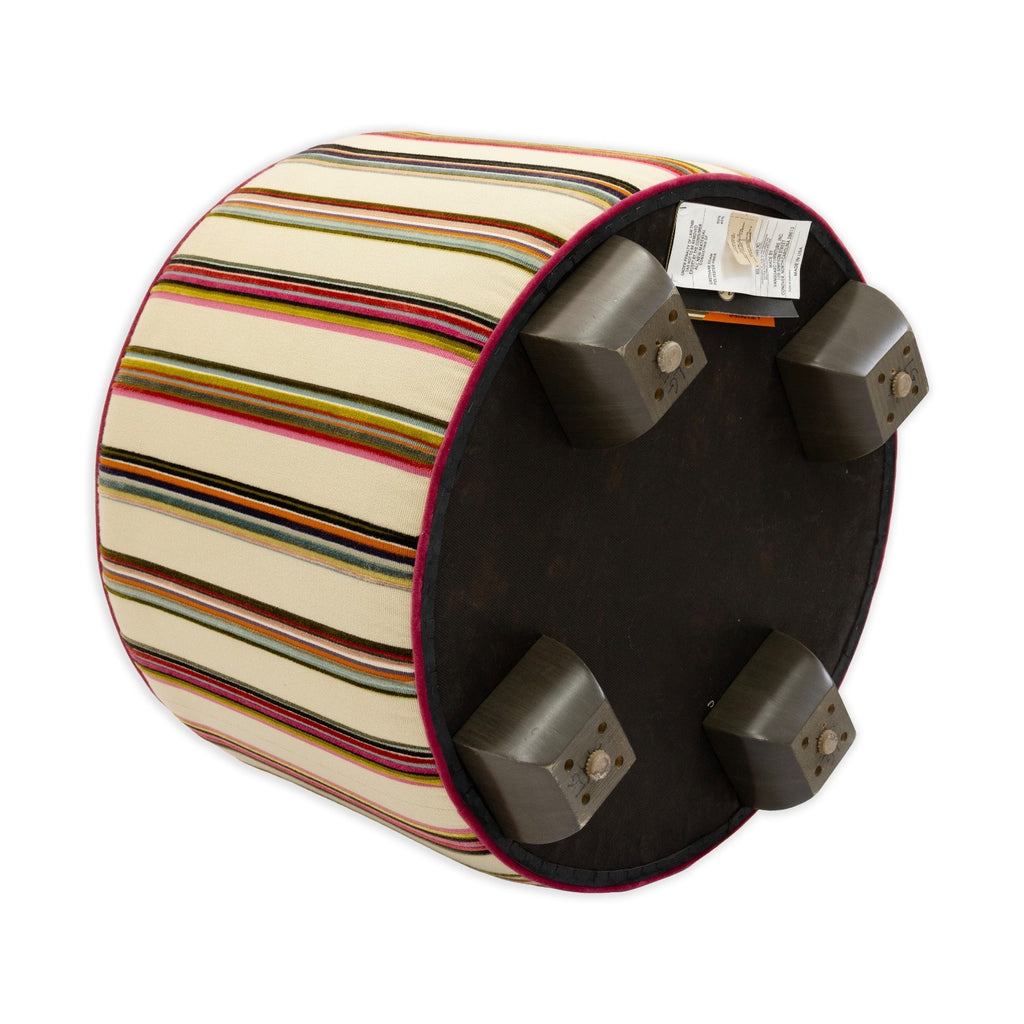 This modern upholstered ottoman features a lively multicolored vertical stripe pattern set against a soft neutral ground, offering a balanced mix of visual interest and versatility. The rounded form is accented with subtle piping along the top and base, lending a tailored finish that highlights its clean, contemporary silhouette. Supported by low, discreet feet, the ottoman feels grounded while maintaining a light, approachable presence. The ottoman is in good condition and measures at 19 inches in height with a diameter of 24 inches.