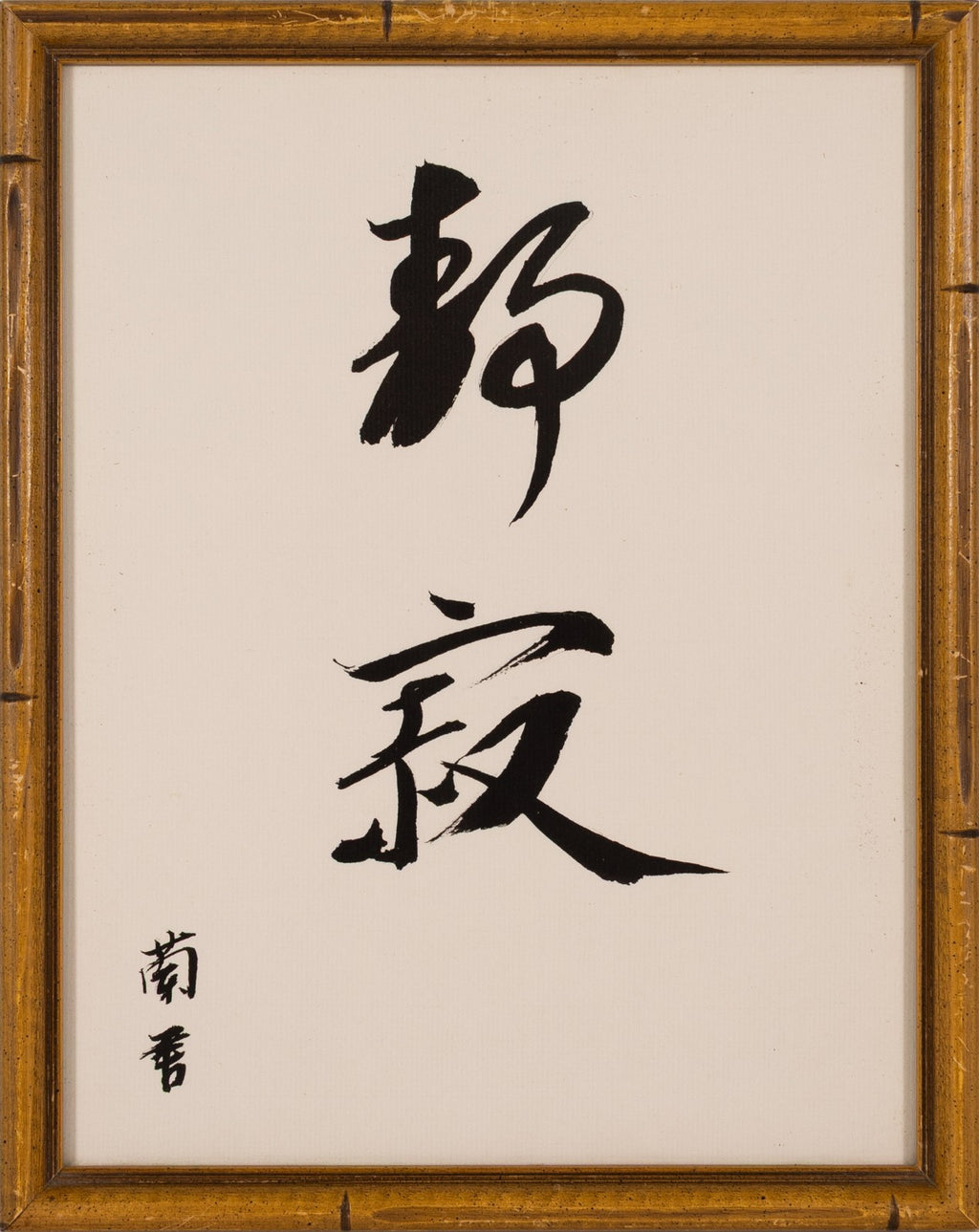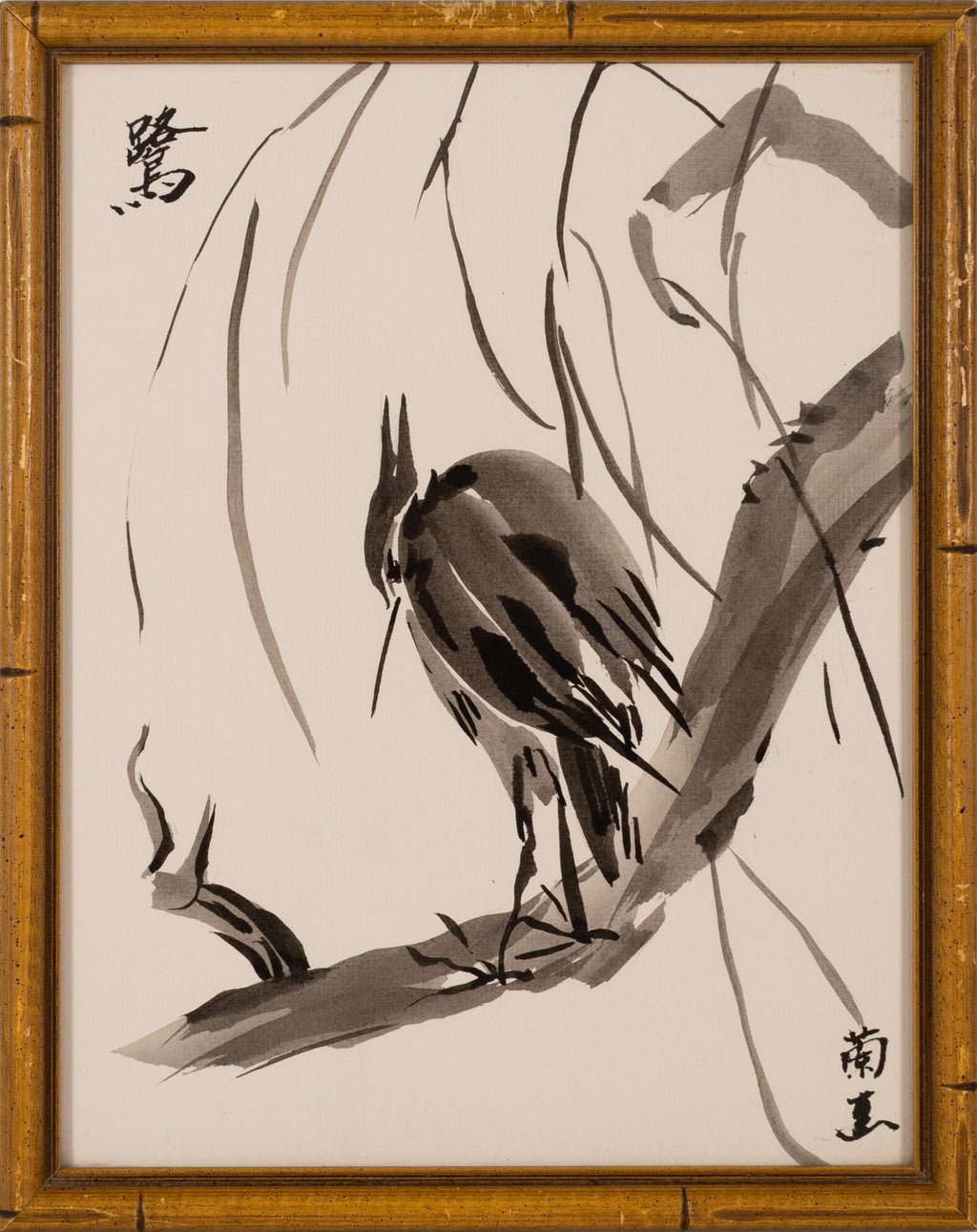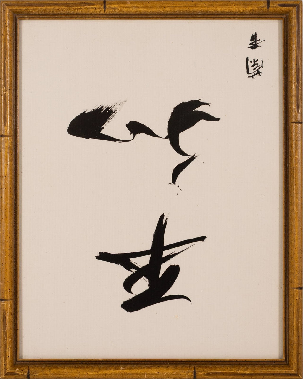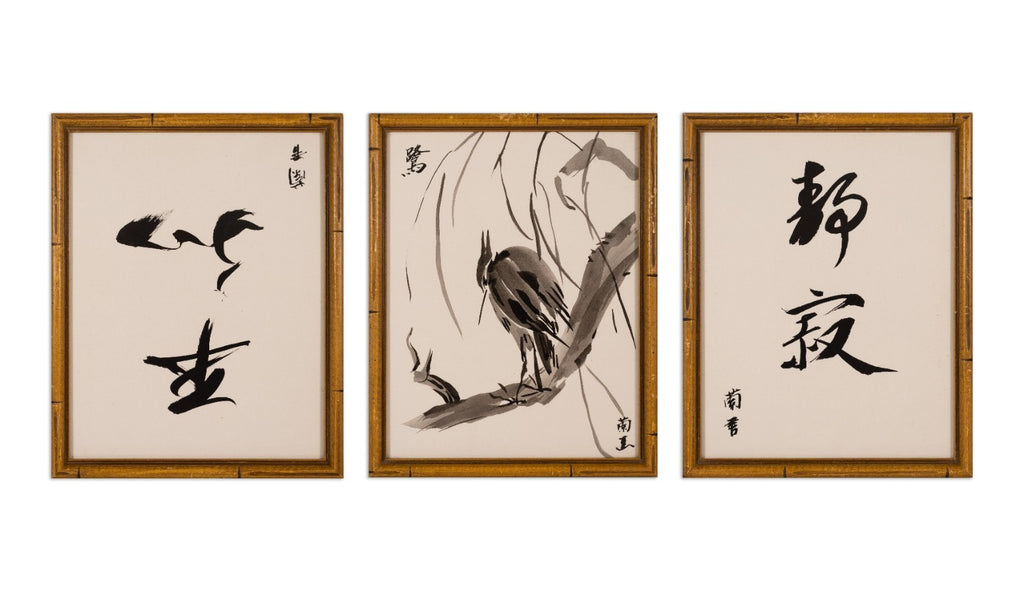 A refined and balanced set of three modernist Asian ink drawings on paper, this framed triptych features expressive calligraphy flanking a central composition of a solitary bird perched on a tree branch. The left and right panels display bold, gestural brushstrokes - likely poetic or philosophical characters - while the center artwork showcases masterful sumi-e (ink wash) technique, emphasizing elegance, simplicity, and the natural world. Rendered in black ink on cream-toned paper and presented in coordinating bamboo-style frames, this set reflects a contemporary interpretation of traditional East Asian calligraphic and painterly aesthetics. A serene and striking decorative ensemble, perfect for collectors of Asian art or modern minimalist interiors.