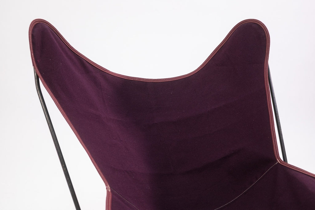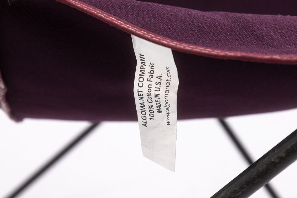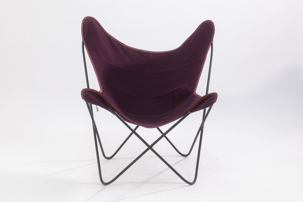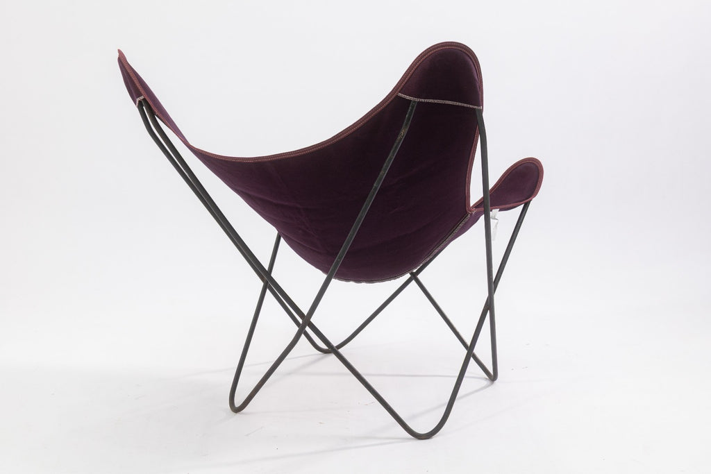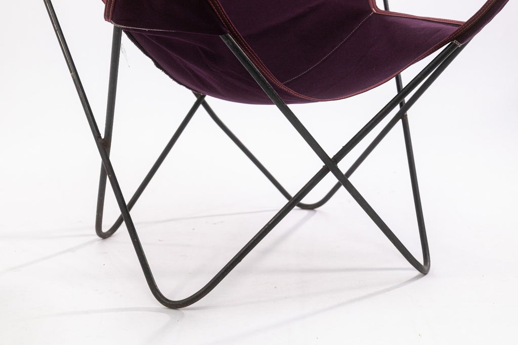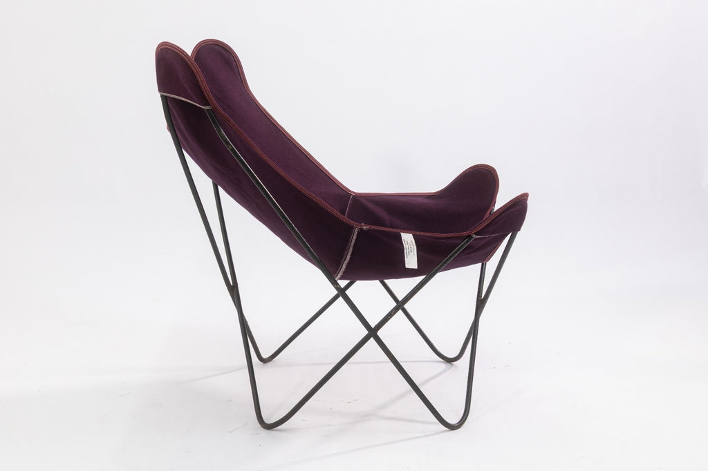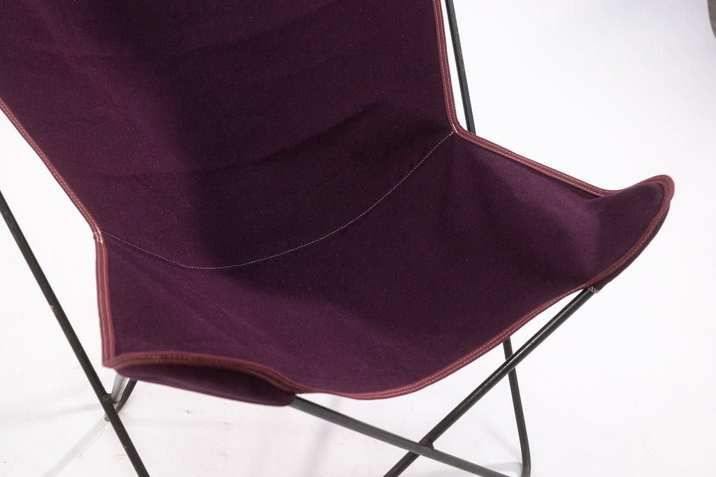 A vintage Butterfly Chair frame with contemporary fabric cover. The Butterfly Chair is one of the most iconic and reproduced designs of the 20th century. The simple design consists of a welded steel frame, and a fabric cover. The original design traces back to Argentina in 1938, designed by architects Antonio Bonet, Juan Kurchan and Jorge Ferrari Hardoy, often refered to as the BKF or Hardoy chair as a salute to the original designers. This specific chair has vintage black steel frame which is in great condition, but the cover has been replaced with a contemporary-made Algoma Net Company purple fabric cover. Overall, the chair is in great condition. It measures approximately 33.5 inches tall, 32 inches wide, and 30 inches deep. It has a seat height of 13 inches, a seat depth of 14 inches, a back height of 16 inches, and a seat width of 12 inches.