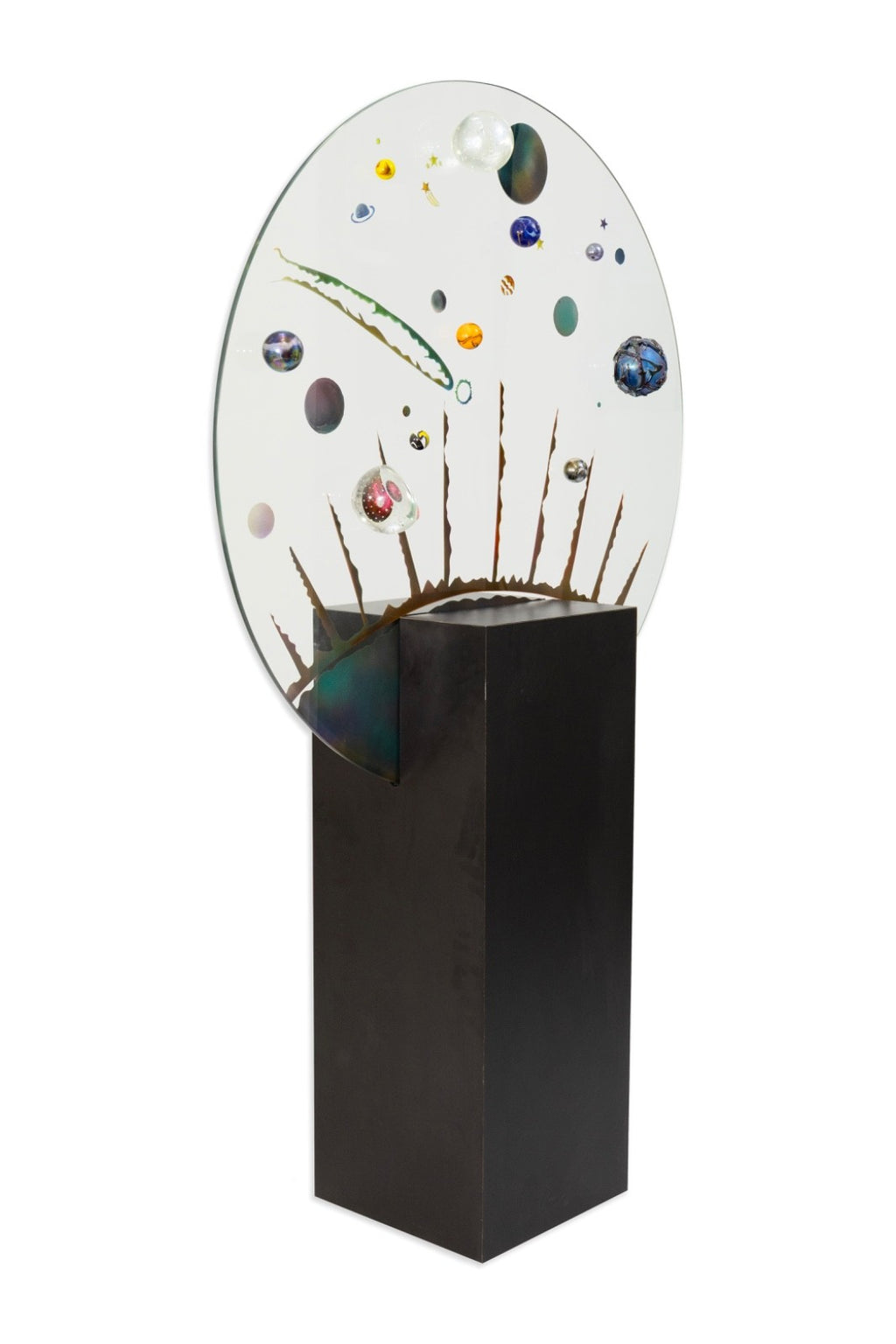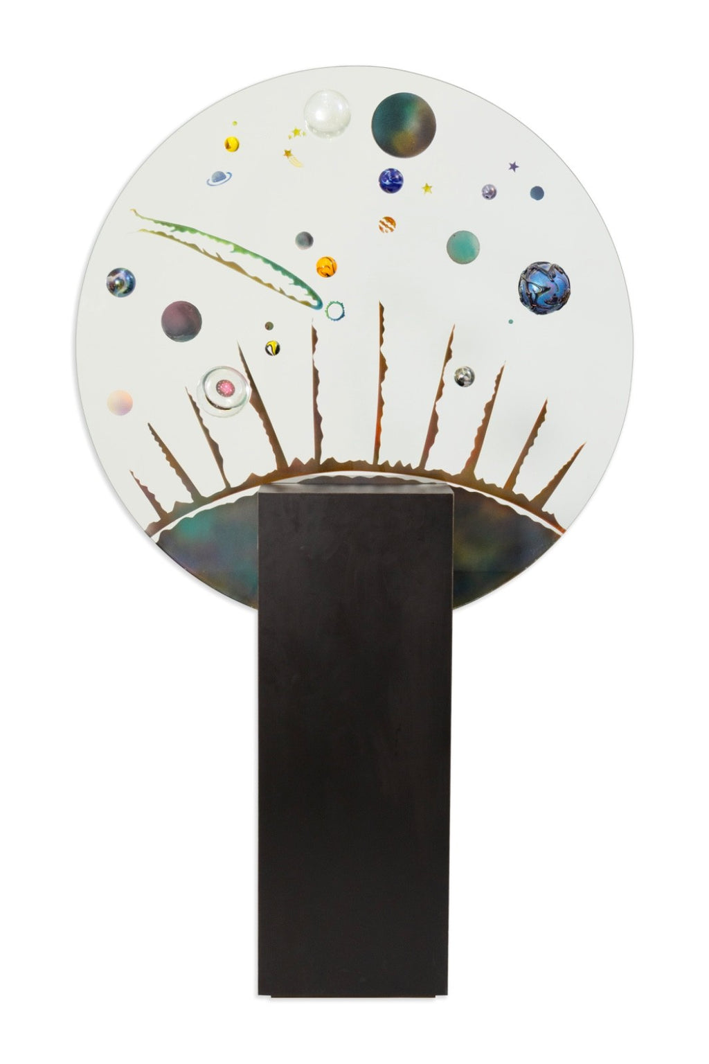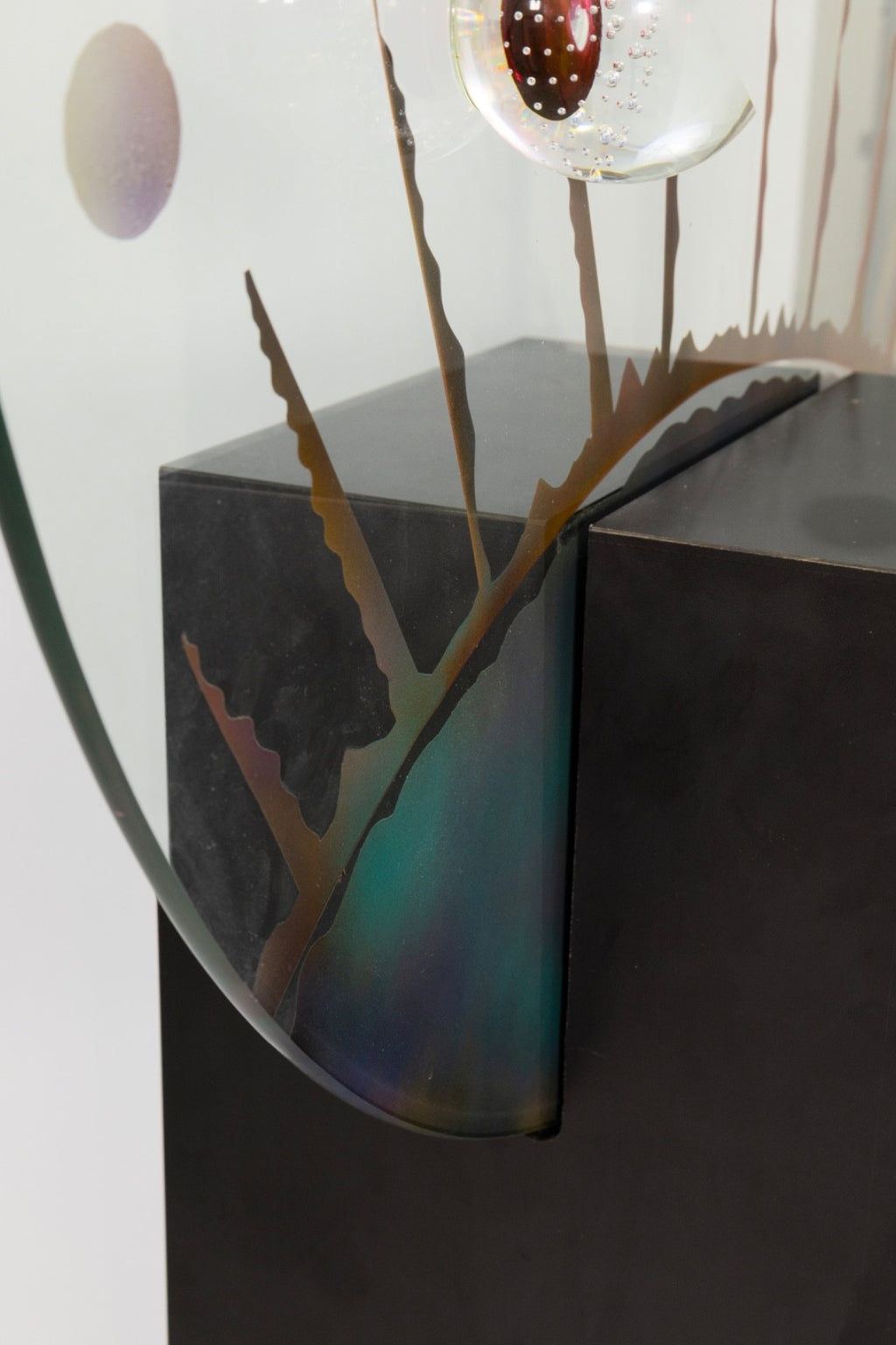A striking Postmodern glass sculpture titled "Outer Limits", dating to the 1990s. The work features a large circular glass disc mounted on a tall rectangular lighted base, creating a commanding vertical presence. The composition depicts a celestial motif with hand-applied, colorful planetary forms orbiting above an abstract horizon, rendered in vivid enamels and metallic accents. The illuminated base enhances the dimensional depth and ethereal quality of the piece, evoking themes of cosmic exploration and human imagination. Signed along the lower edge, artist unknown. From a private collection. Dimensions: 59"h x 35.5"w x 12"d. In very good condition.