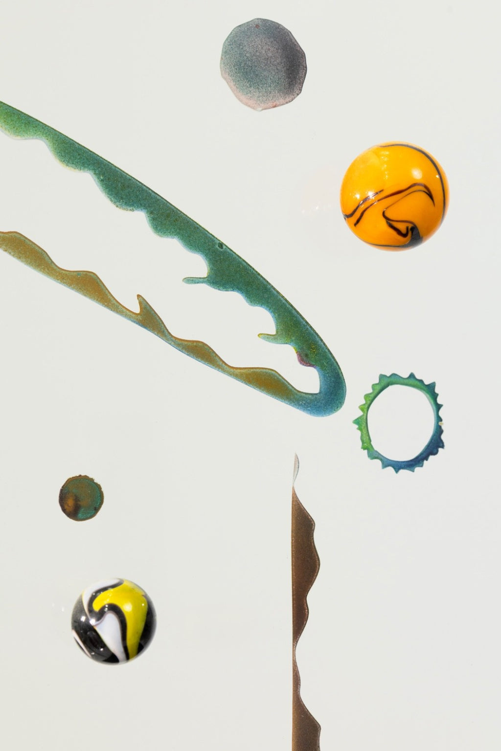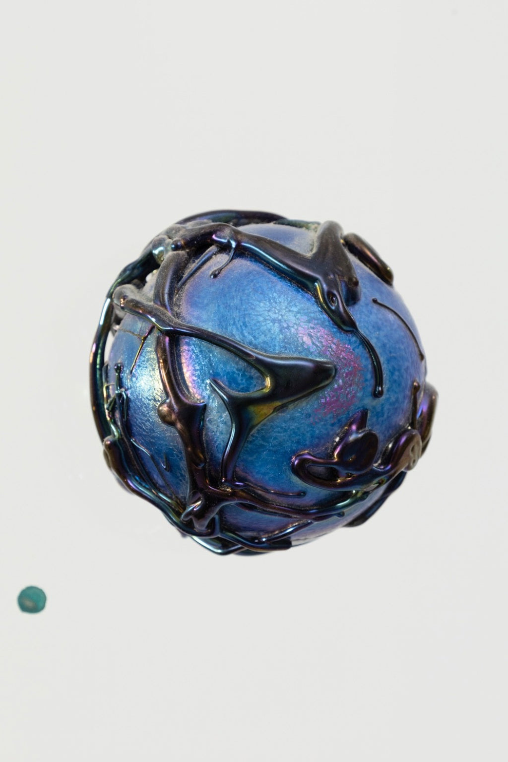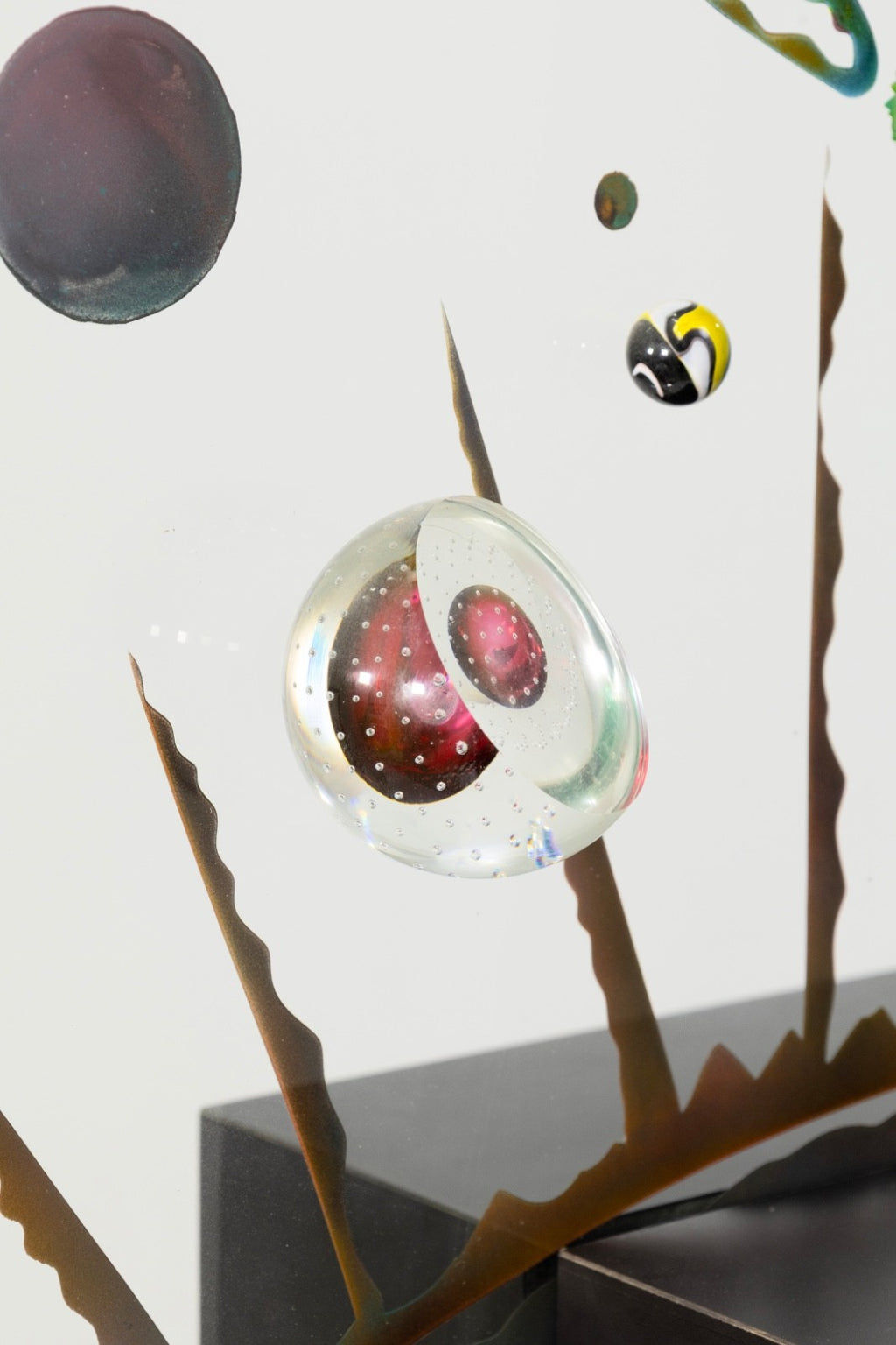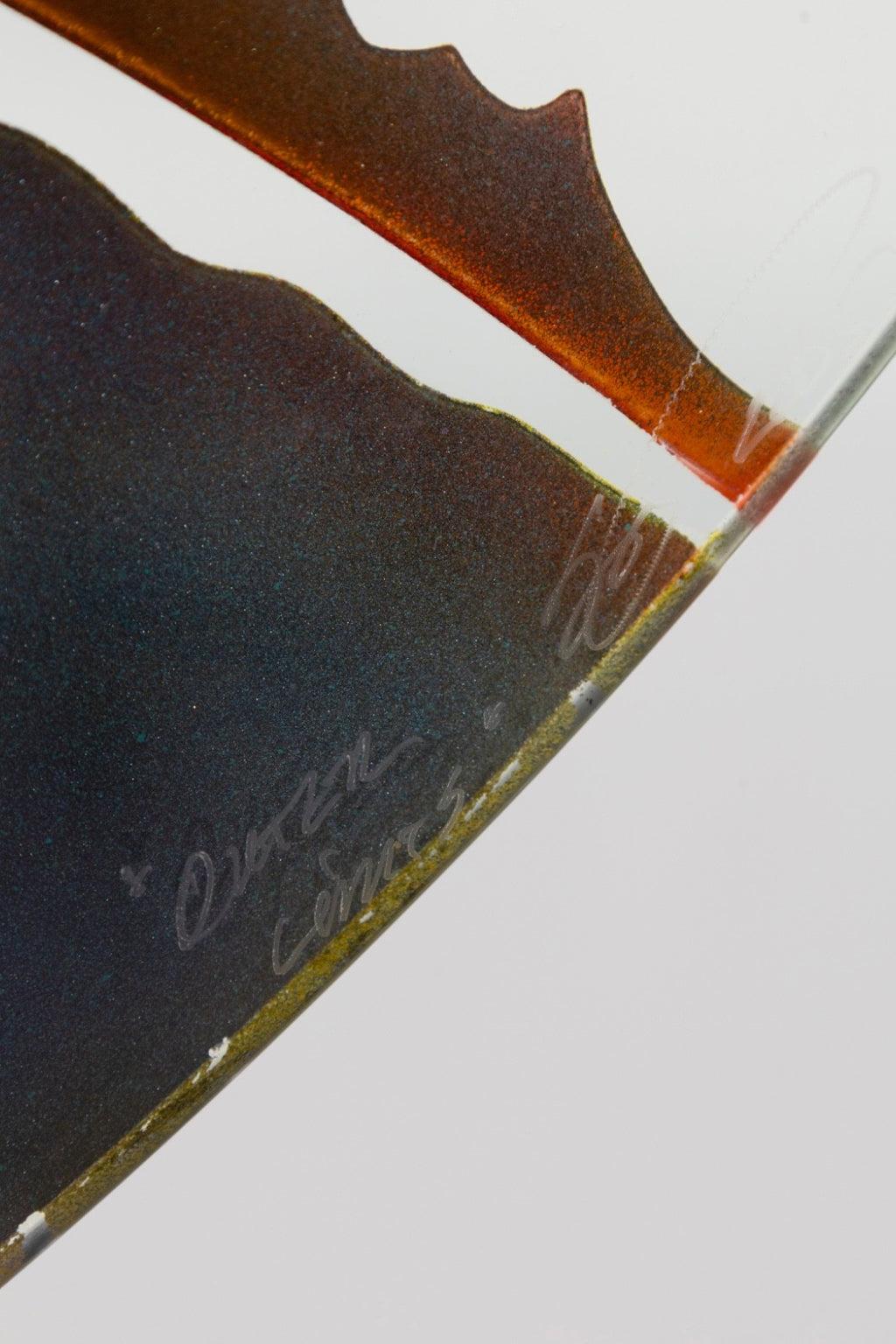 A striking Postmodern glass sculpture titled "Outer Limits", dating to the 1990s. The work features a large circular glass disc mounted on a tall rectangular lighted base, creating a commanding vertical presence. The composition depicts a celestial motif with hand-applied, colorful planetary forms orbiting above an abstract horizon, rendered in vivid enamels and metallic accents. The illuminated base enhances the dimensional depth and ethereal quality of the piece, evoking themes of cosmic exploration and human imagination. Signed along the lower edge, artist unknown. From a private collection. Dimensions: 59"h x 35.5"w x 12"d. In very good condition.