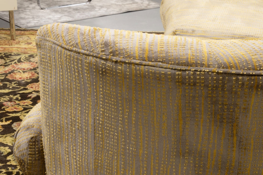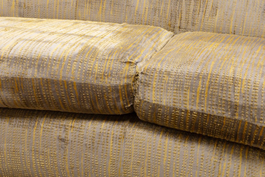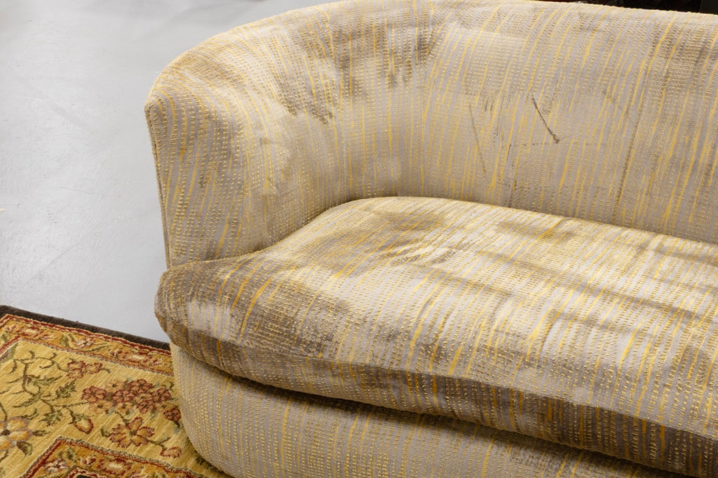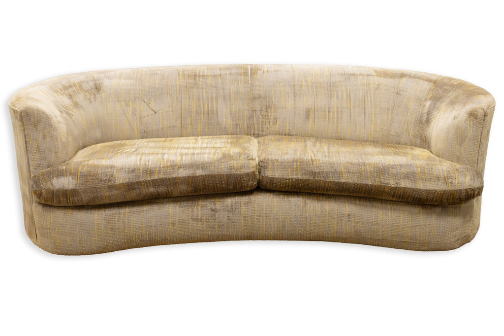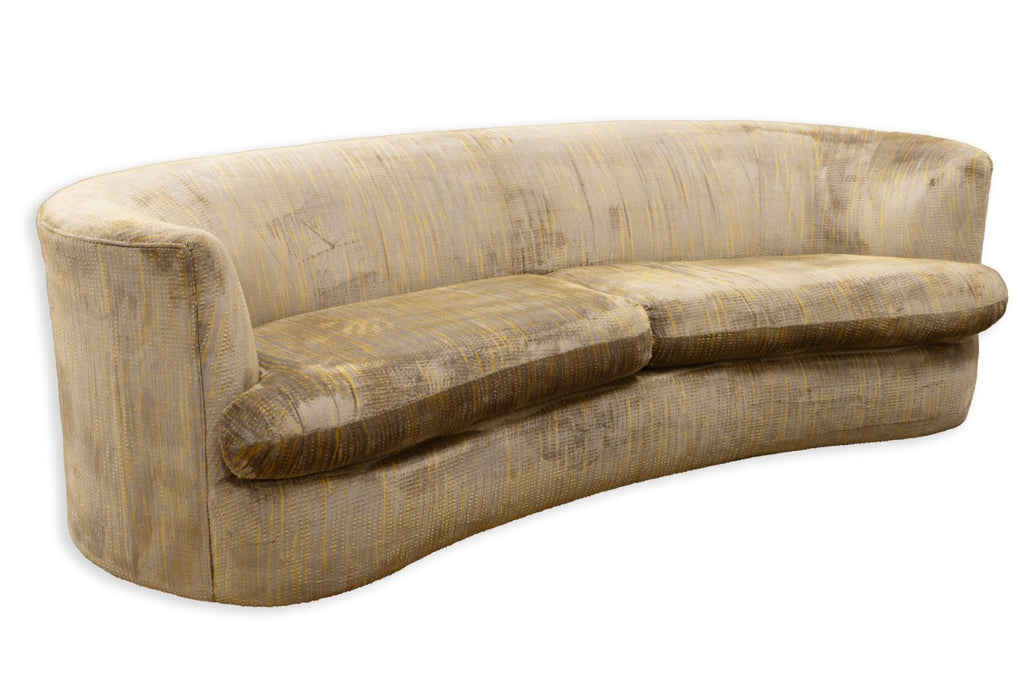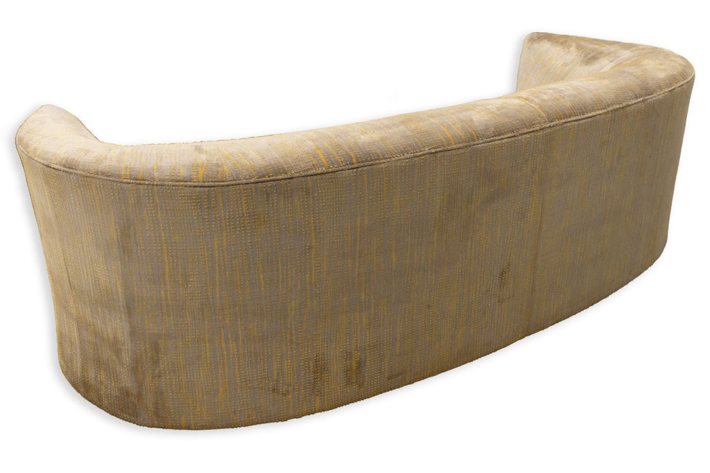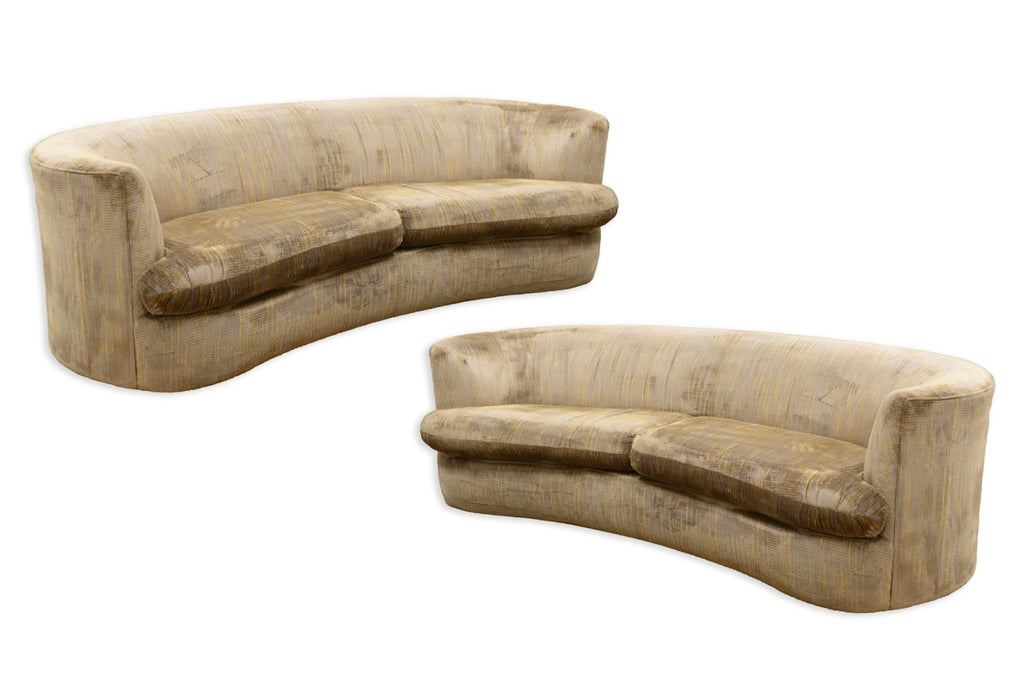 This exquisite pair of Mid Century Modern sofas, crafted in the iconic Vladimir Kagan style, showcases an elegant organic silhouette with fluid, sculptural lines. The sofas feature a sweeping curved back and subtly flared arms, embodying the timeless sophistication and comfort associated with Kagan’s celebrated designs. Upholstered in a textured, neutral-toned fabric with golden undertones, these sofas exude understated luxury while blending seamlessly with a wide range of interior styles. Their generous proportions and plush seat cushions provide both style and comfort, making them the perfect statement pieces for any modern or contemporary living space. Both couches have a small tear in the upholstery along the middle seem as shown above. These sofas measure 30 inches in height, 93 inches wide, and 40 inches deep. They have a seat height of 18 inches, a seat depth of 30 inches, a seat width of 70 inches, and an arm height of 12 inches.