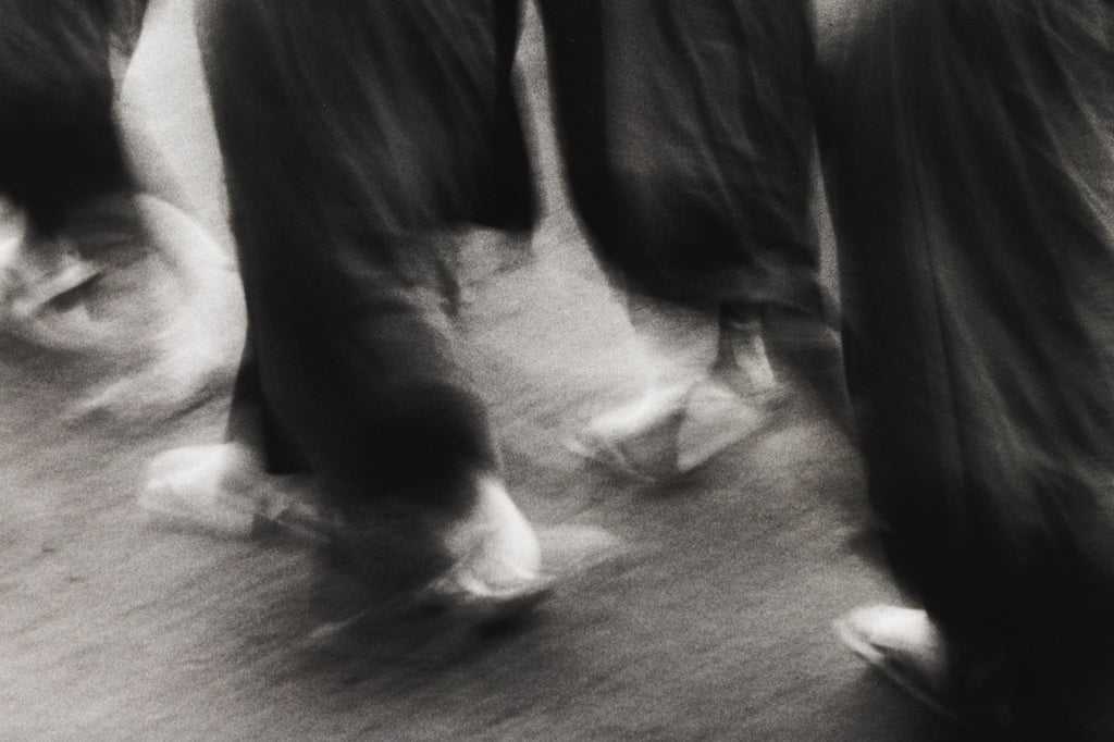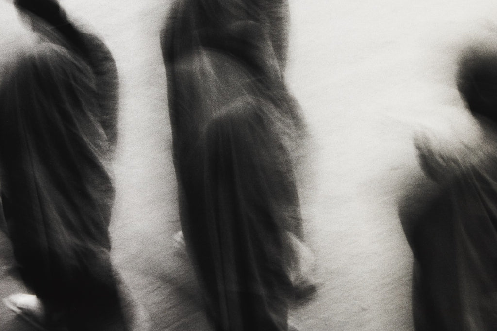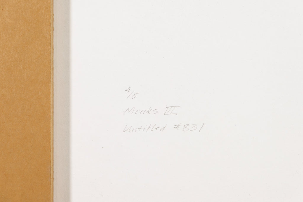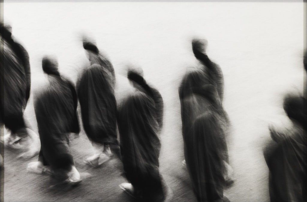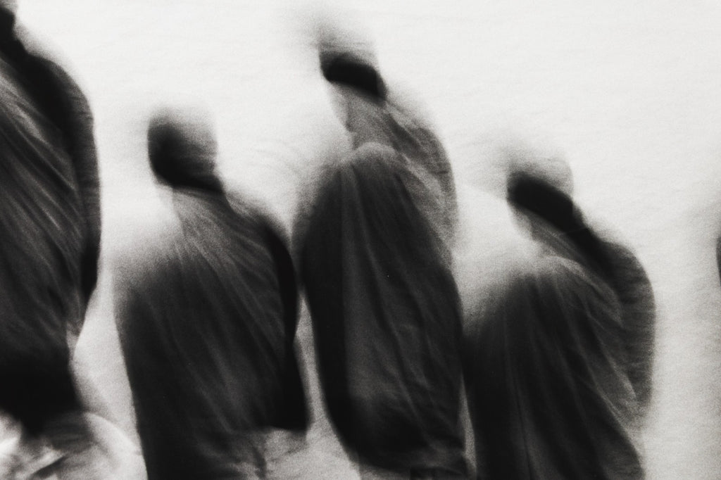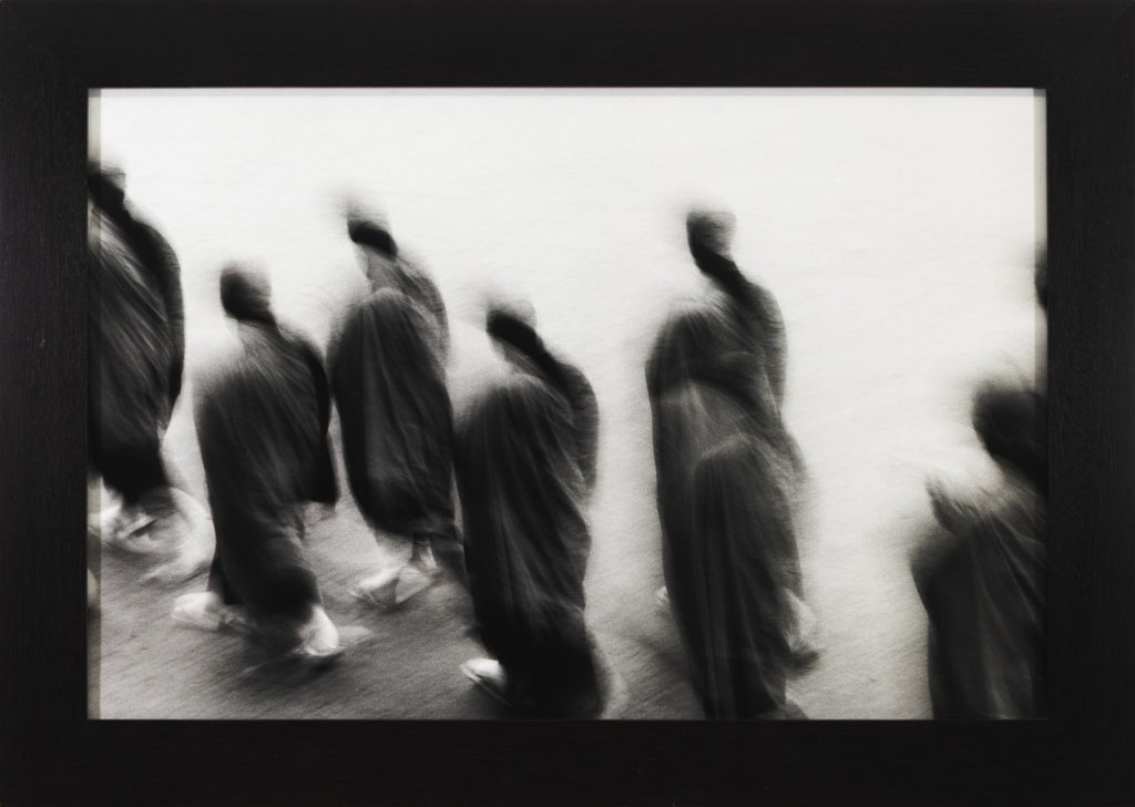 A contemporary gelatin silver print Untitled #831 (Monks III), 1992 by artist Petah Coyne. Captured in late autumn in the mountains of Koyasan, Japan, this atmospheric photograph depicts a group of Buddhist monks emerging from the forest during their afternoon prayers. Moving in quiet formation from one place to another, they remain immersed in continuous devotion. Coyne's use of a long exposure softens their outlines into ghostly, fluid forms, visually translating the shared energy and spiritual unity of the moment. The resulting image blurs the boundary between documentation and abstraction, evoking both the physical presence and the meditative essence of the monks' ritual.