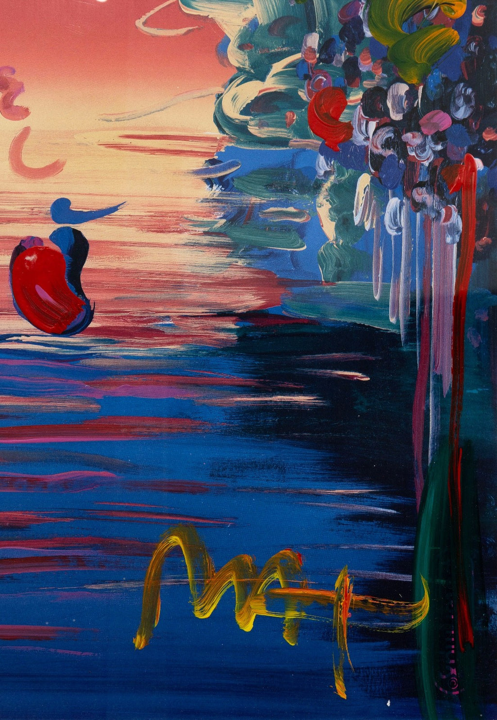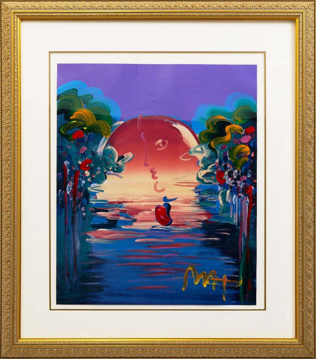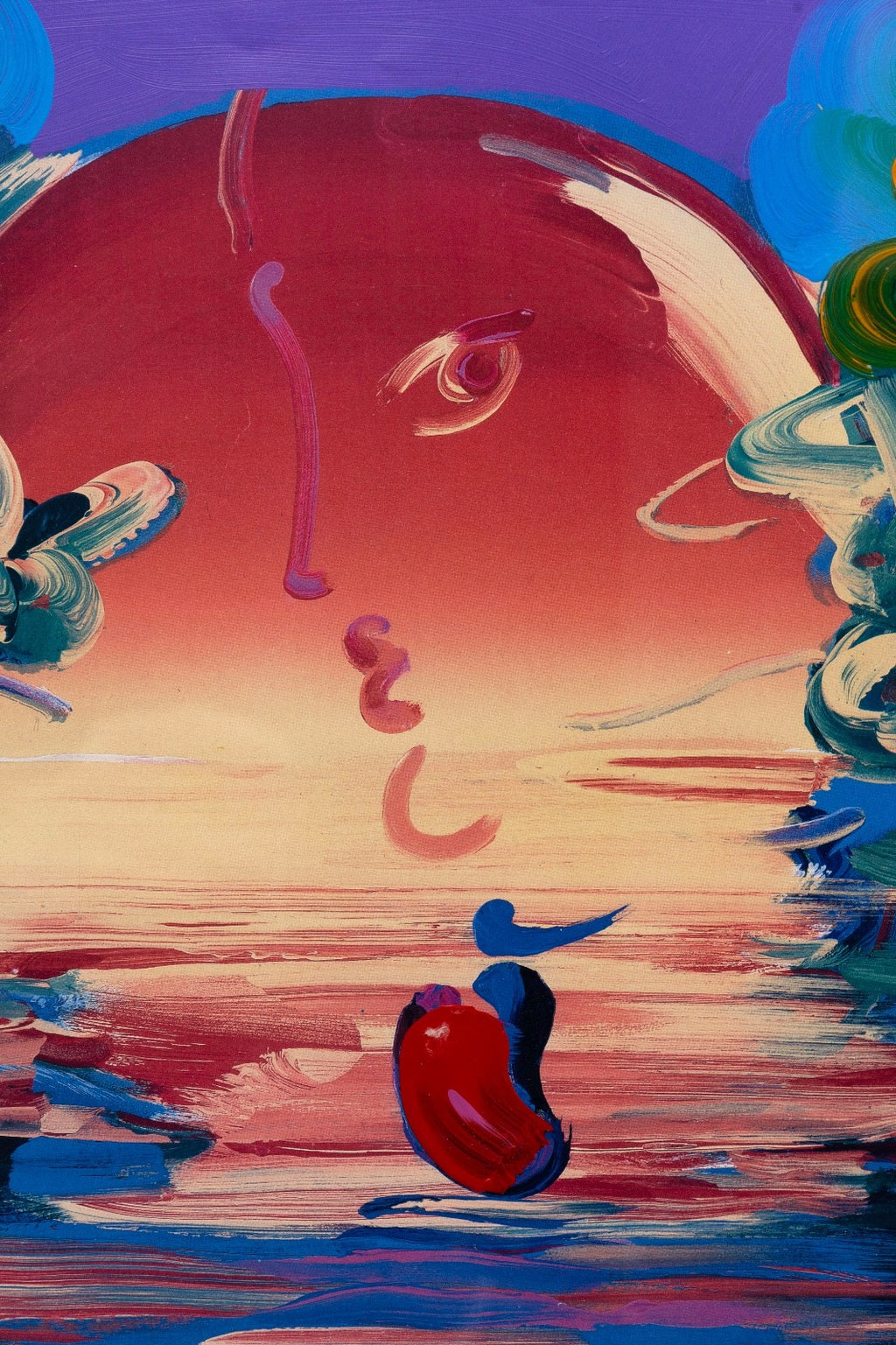 This vibrant mixed-media work by Peter Max, titled "A Better World" and dated 1992, exemplifies the artist’s iconic fusion of abstract expressionism and pop art. Hand signed in acrylic on the lower right. The composition features a radiant, dreamlike landscape with a glowing sun and flowing water, animated by saturated blues, purples, reds, and greens. Expressive brushwork and layered color create a sense of movement and optimism, central themes in Max’s oeuvre. Signed by the artist, this work reflects his enduring message of peace, harmony, and universal consciousness, making it a compelling example of Max’s celebratory visual language and enduring influence on contemporary pop art.