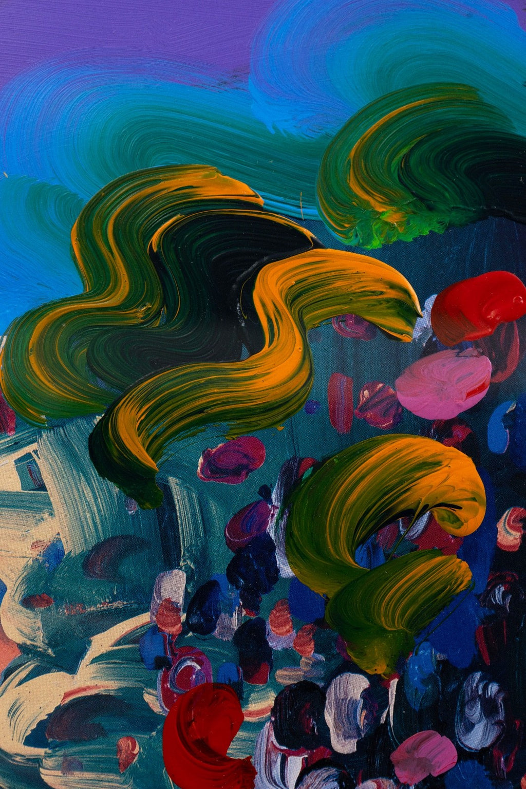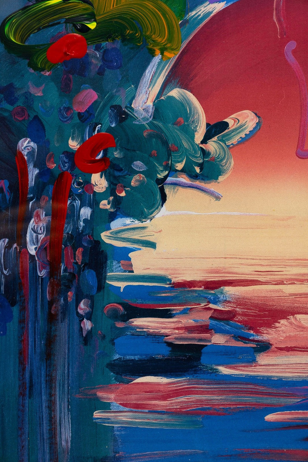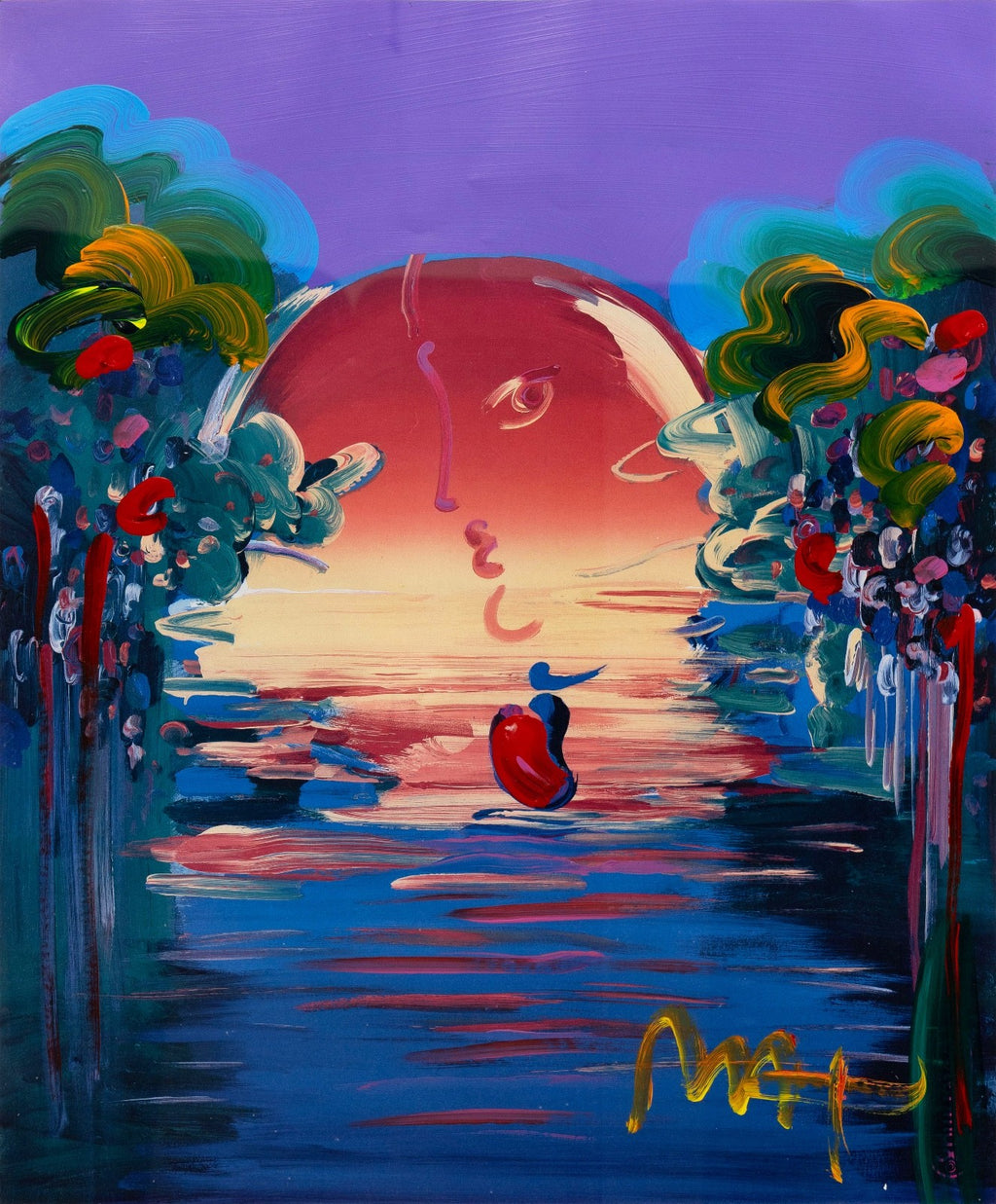 This vibrant mixed-media work by Peter Max, titled "A Better World" and dated 1992, exemplifies the artist’s iconic fusion of abstract expressionism and pop art. Hand signed in acrylic on the lower right. The composition features a radiant, dreamlike landscape with a glowing sun and flowing water, animated by saturated blues, purples, reds, and greens. Expressive brushwork and layered color create a sense of movement and optimism, central themes in Max’s oeuvre. Signed by the artist, this work reflects his enduring message of peace, harmony, and universal consciousness, making it a compelling example of Max’s celebratory visual language and enduring influence on contemporary pop art.
