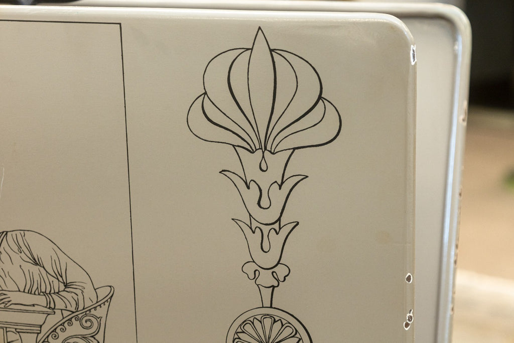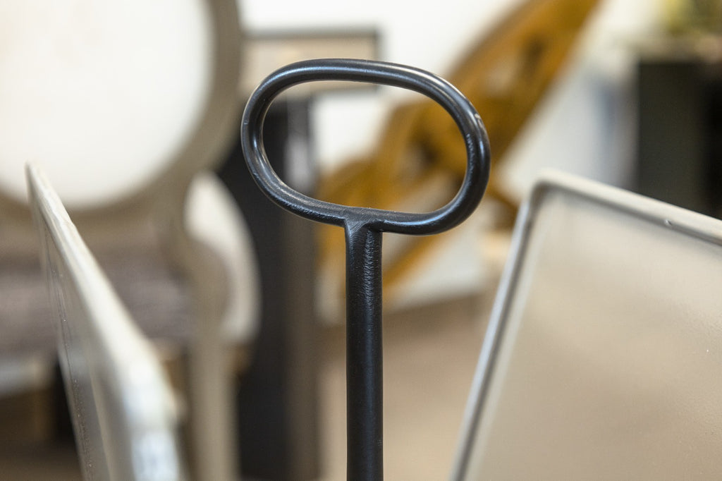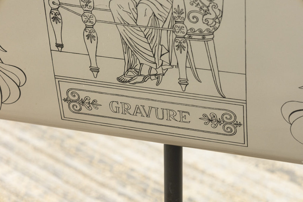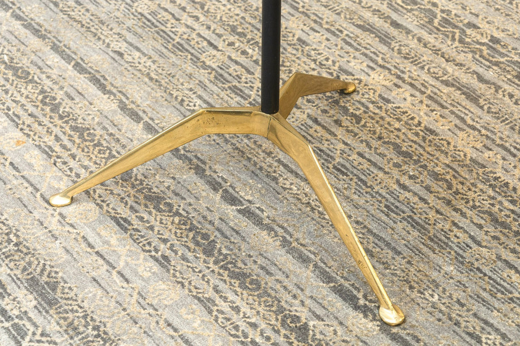 A vintage mid century modern Italian Piero Fornasetti attributed magazine stand. This is a gorgeous piece of home decor that bleeds the border between household object, and sculptural art. This magazine stand features a polished brass base, a black wrought iron center column, and a painted aluminum upper magazine stand. The upper features beautiful artwork stenciled onto either side. This piece is in overall very good vintage condition, but has some small chipping and scratching throughout the paint, common with used vintage furniture. This rack measures 30 inches tall, and 17 x 13 inches wide.