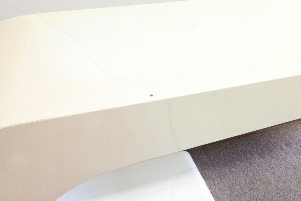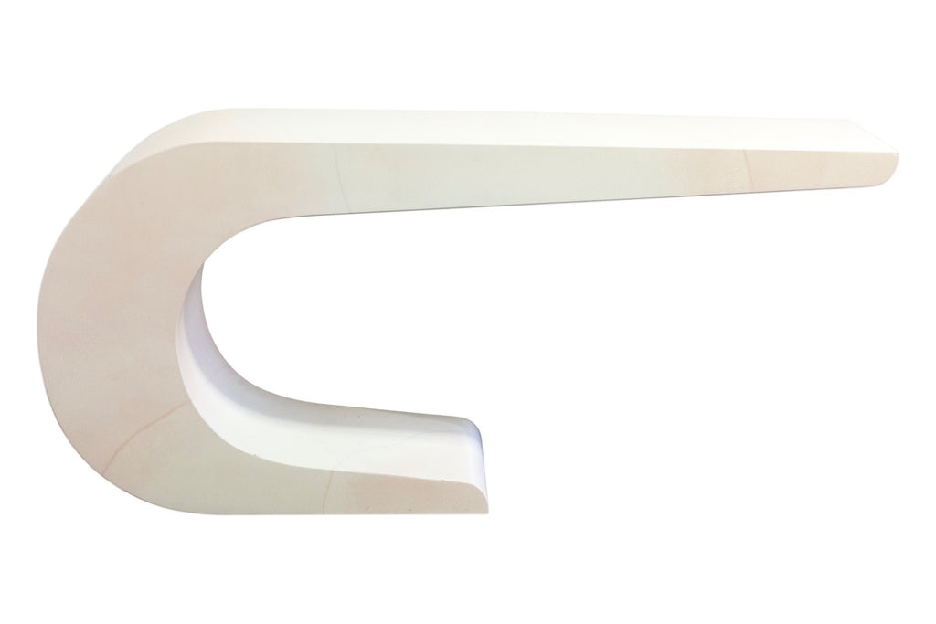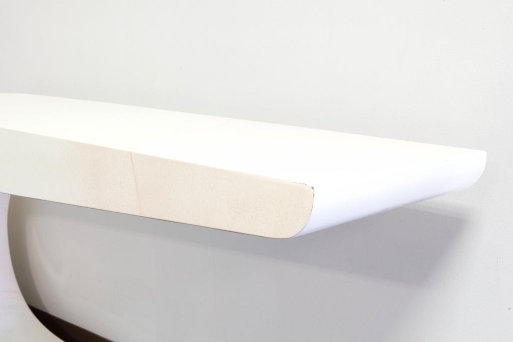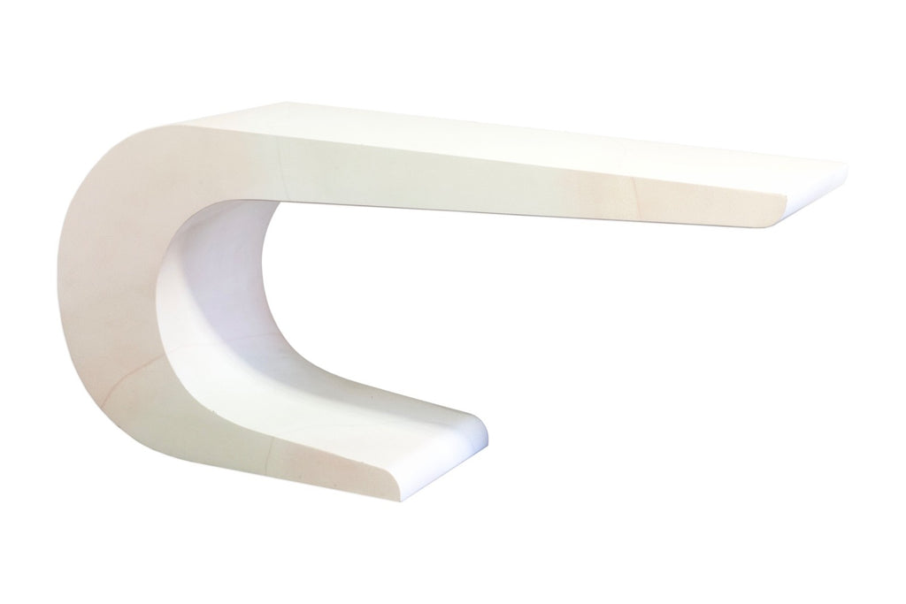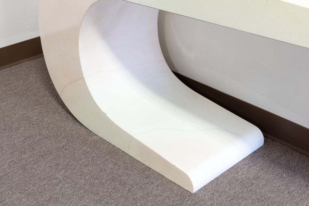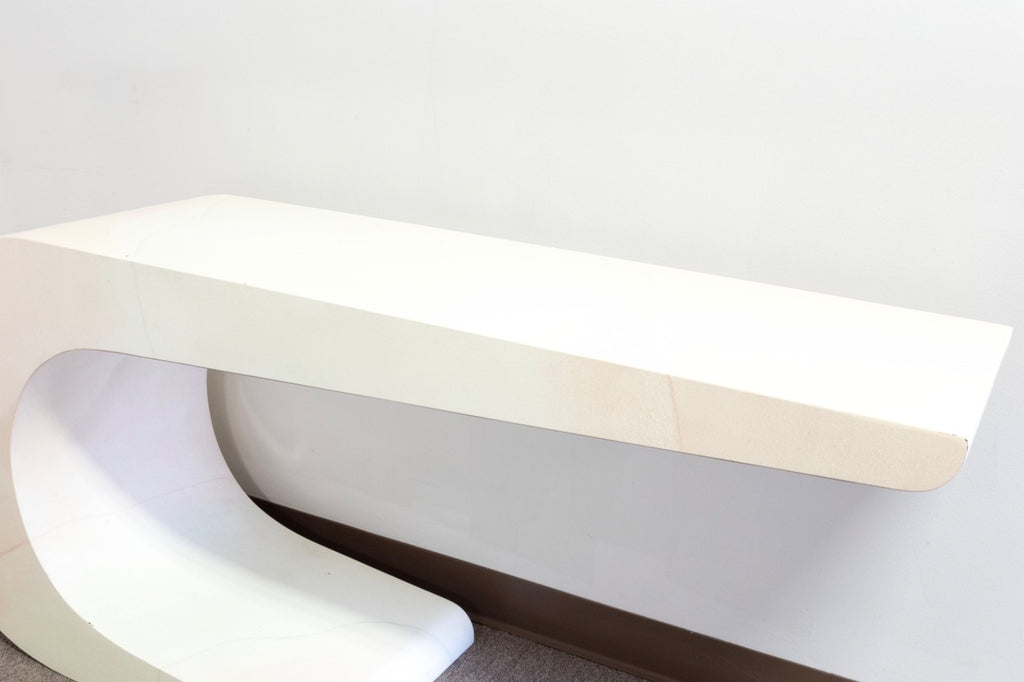 This Pierre Cardin White Lacquered Waterfall Console Table is a striking example of sculptural modern design, defined by its fluid, continuous form and sleek monochromatic finish. Crafted in a high-gloss white lacquer, the table features a dramatic waterfall silhouette that curves seamlessly from the top surface down into its base, creating a bold yet refined visual statement. The smooth, rounded edges and uninterrupted lines emphasize its architectural quality, while the minimalist design allows it to function as both a practical surface and a piece of functional art. Subtle variations in tone across the lacquer add depth and character, enhancing its sculptural presence without detracting from its clean aesthetic. The lacquer is slightly yellowed all over, some small chips to the surface as shown. The table measures at 27.25 inches in height, 60 inches in width and 16 inches in depth.