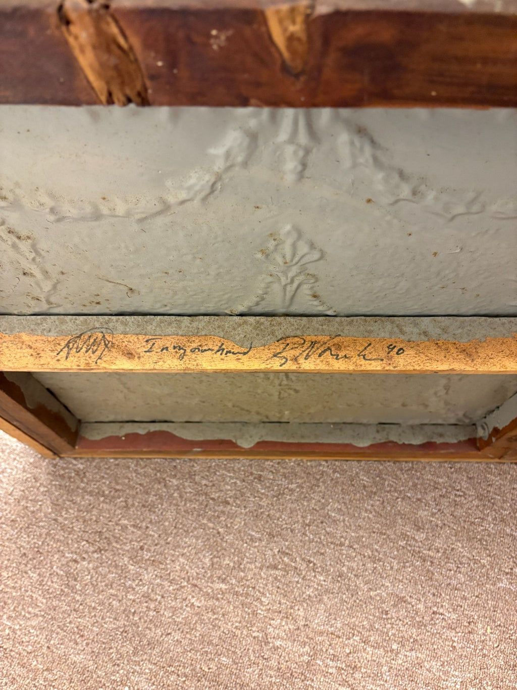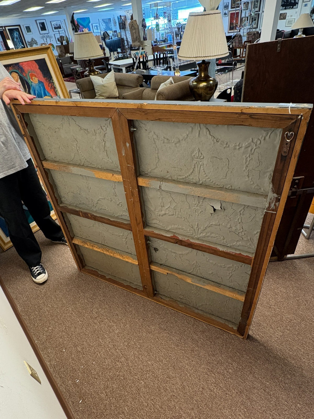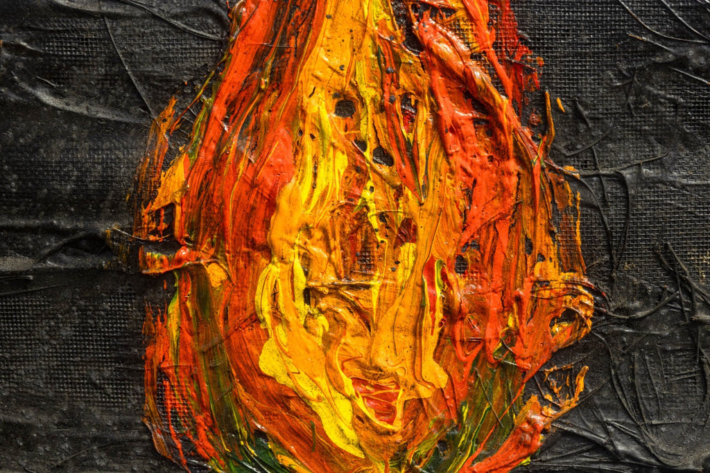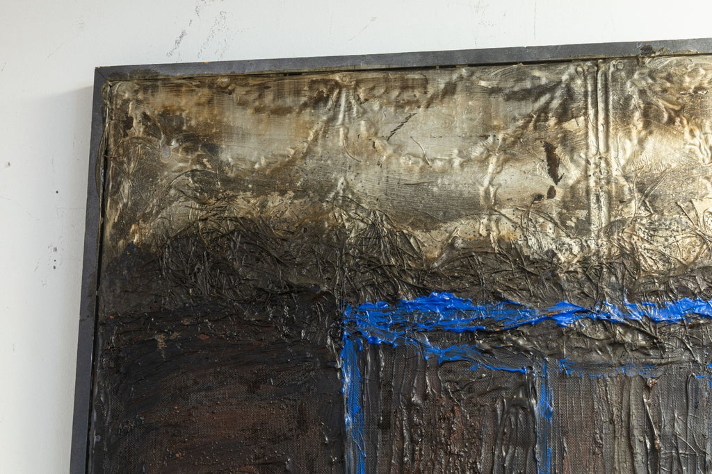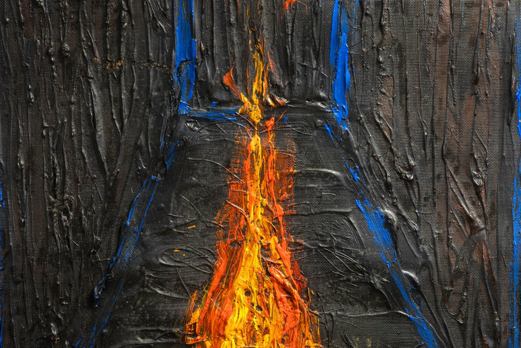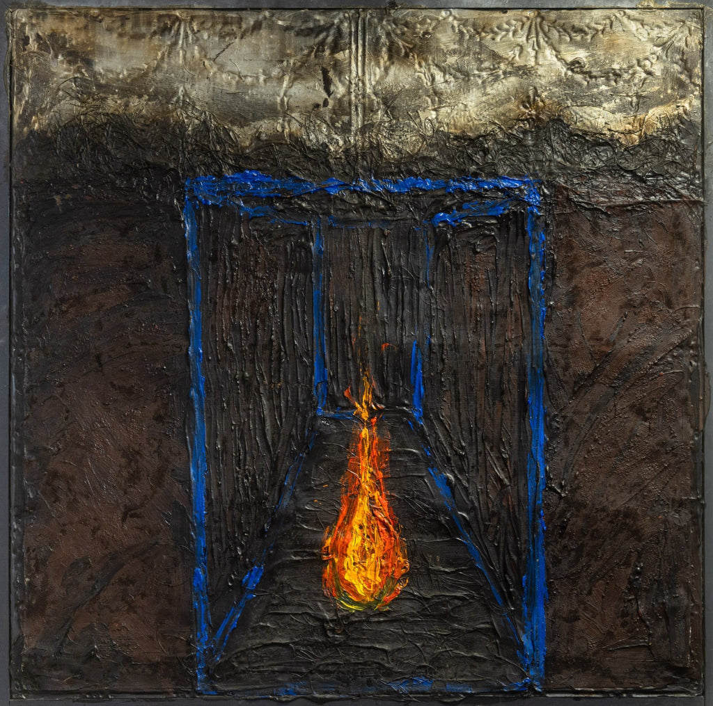 A visually arresting mixed-media painting executed in thick impasto oil on antique wood paneling. The composition centers around a fiery orange flame enclosed within a geometric, blue-outlined chamber, emerging from a richly textured and darkly atmospheric background. The interplay between the luminous flame and the shadowed surroundings creates a sense of psychological depth and symbolic tension, evoking themes of enlightenment, transformation, and inner illumination. Rendered in a surreal, architectural format, the piece combines expressive abstraction with a sculptural surface quality. Signed and titled on the verso (although illegible). Dimensions: 49.5 inches tall, 50.25 inches wide, and 1.75 inches deep. In very good condition.