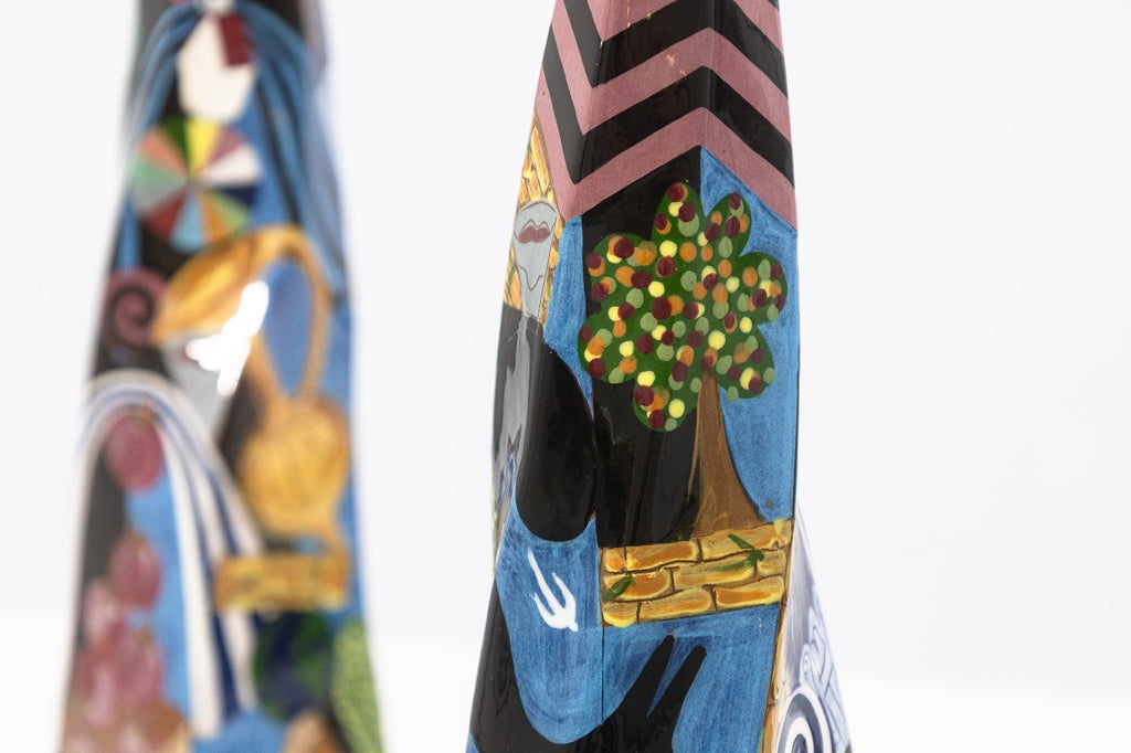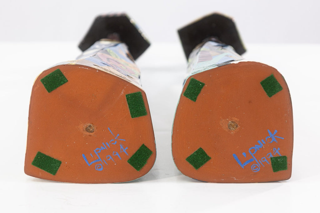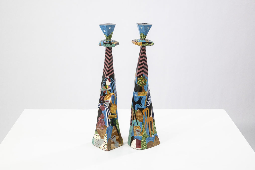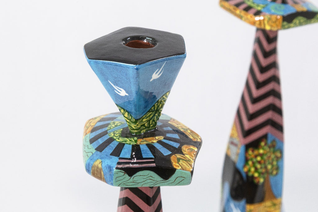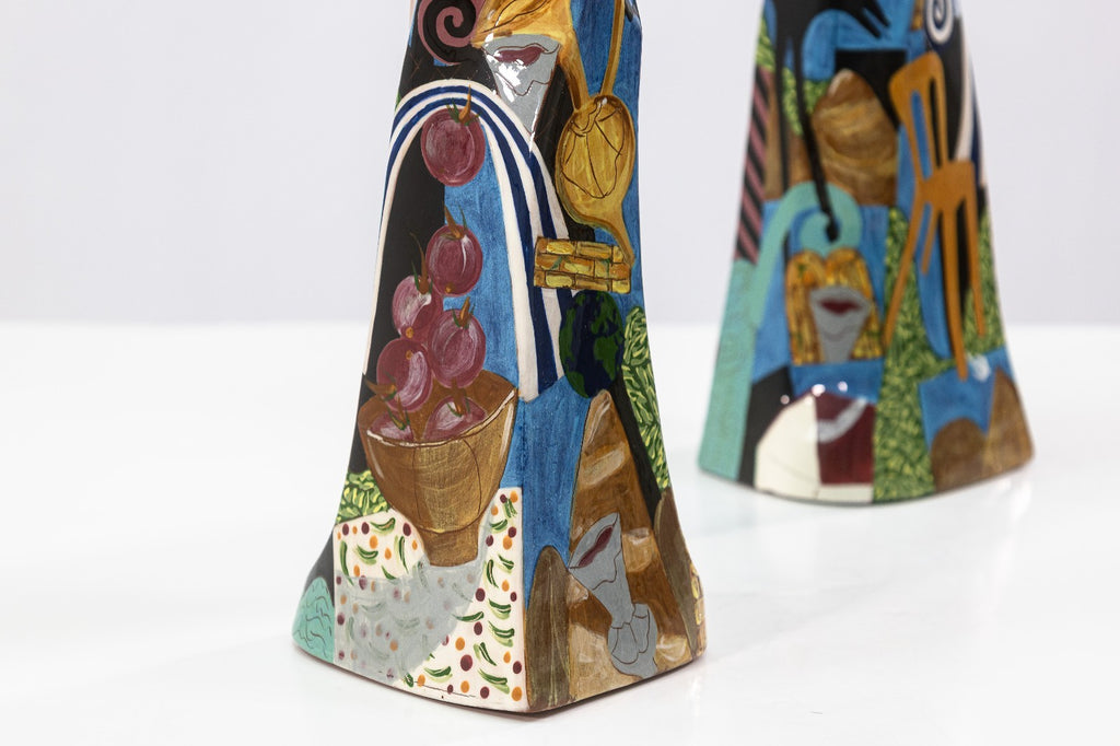 A pair of ceramic candlestick holders of tapering form with flared tops and square bases by Robert Lipnick. Hand signed and dated 1994 on the underside. Each is hand-painted in polychrome with figurative and abstract motifs, including stylized faces, fruit, architectural elements, geometric patterns, and landscape imagery. The surfaces feature bold color blocking and graphic line work associated with postmodern and Memphis-inspired design. <br> <br> Provenance: From a private collection. Dimensions: 14.25”h x 12”w x 1.25”d. Overall very good condition. Full condition reports available upon request. <br> <br> Robert Lipnick is an American ceramic artist and educator known for developing a distinctive iconographic language that connects Jewish tradition, popular culture, and personal narrative. He holds a Bachelor of Science from the University of Maryland and a Master of Fine Arts from the University of Notre Dame. Lipnick has exhibited nationally, with works shown at institutions including the Minneapolis Institute of Art and the Jewish Museum in New York. In addition to exhibiting at the Figge Art Museum, he has been a long-standing educator in eastern Iowa, teaching at Scott Community College, Clinton Community College, and Marycrest College. His career reflects a sustained commitment to studio practice and arts education.