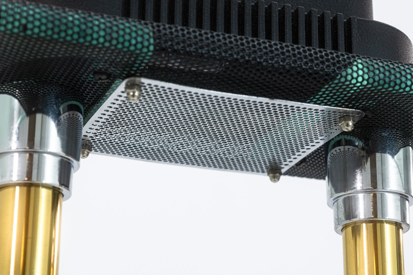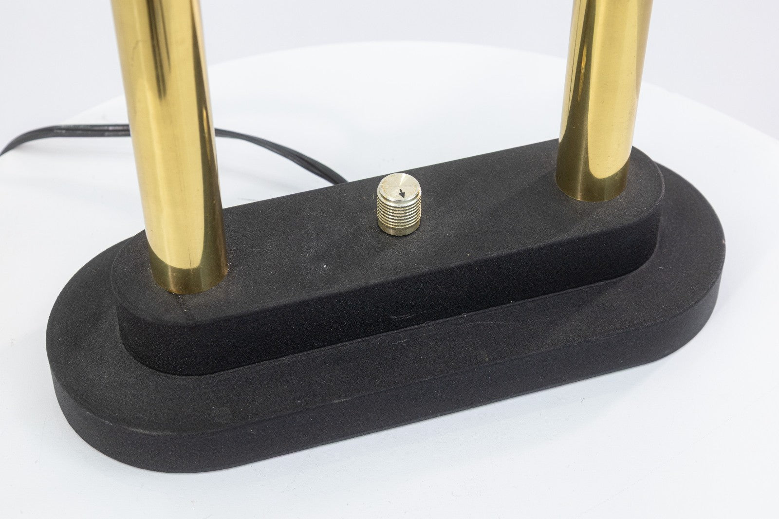 A Robert Sonneman for George Kovacs 1980s table lamp. This is a stunning example of a post modern table lamp by Sonneman for Kovacs. This lamp features a full metal body with matte black textured frame pieces, two polished brass columns, a rounded glass lamp shade with black metal grating, and an adjustable intensity light switch knob. This table lamp is in minty vintage condition, with some small scuffs and scratches common with used vintage pieces. This lamp measures 15.25 inches tall, 16.5 inches long, and 4.75 inches wide.