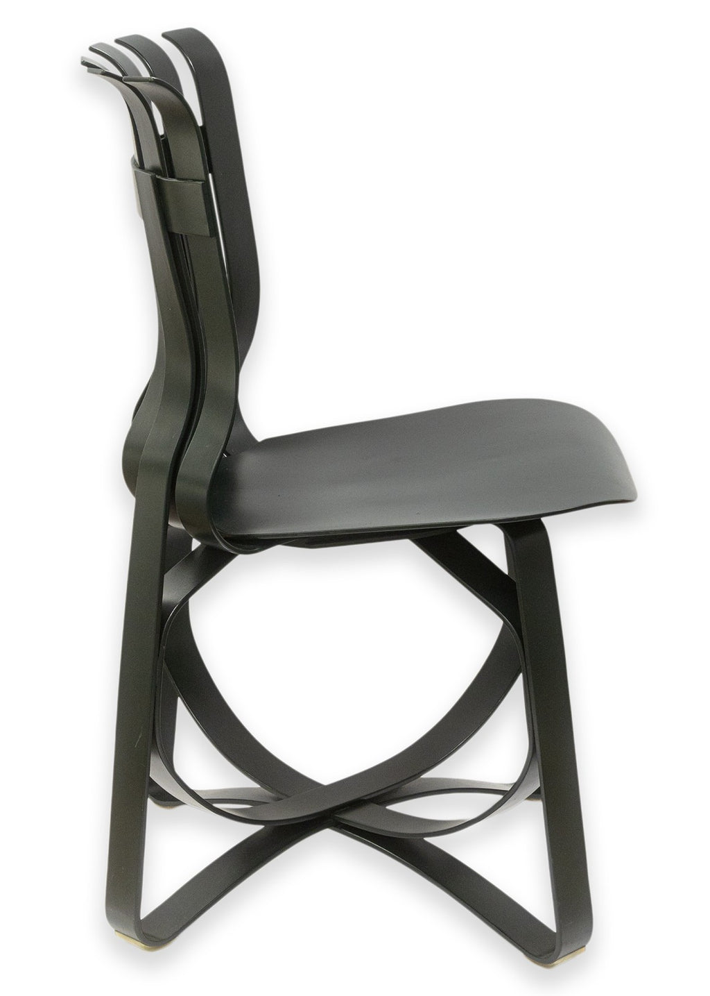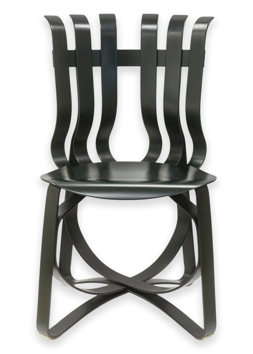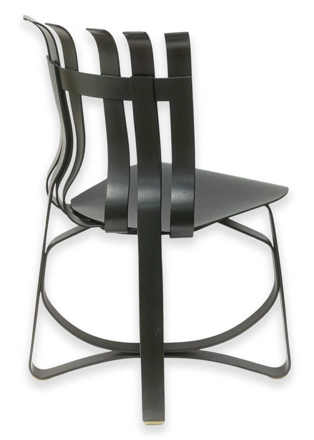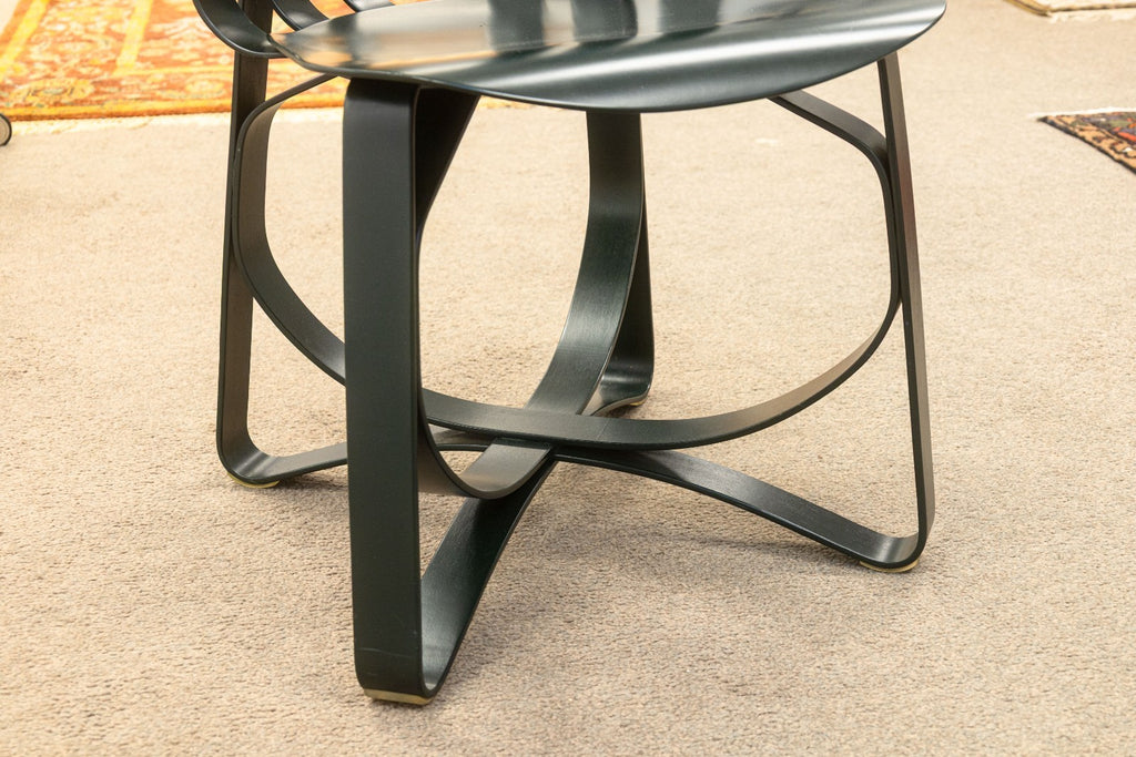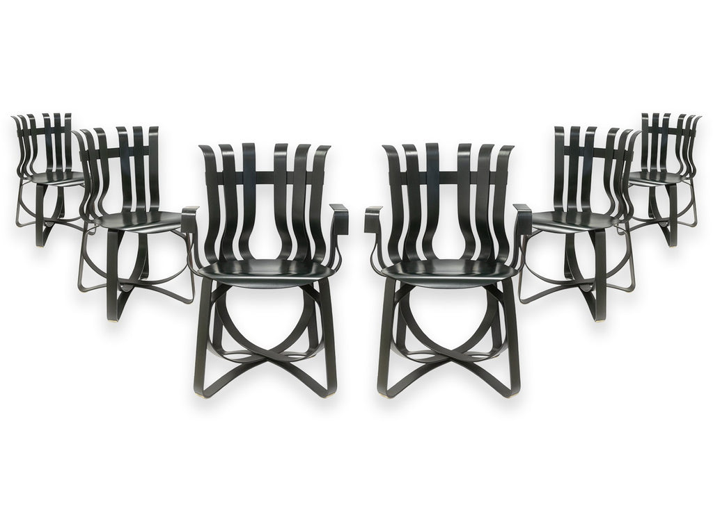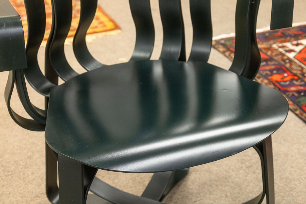 A set of vintage Frank Gehry for Knoll "Hat Trick" dining chairs. This stunning artful furniture designed by Frank Gehry and produced by Knoll features a bentwood construction with a ribbon-like design. They are inspired by Gehry's childhood, specifically by the apple crates he would play on as a child and their surprising strength and resilience. These gorgeous pieces of furniture feature white maple veneer strips, glued and woven together. The maple has been colored a deep black verdigreen color, unique from the usual Gehry chairs seen. Each chair has embossings of the Knoll name and Frank Gehry's signature on the underside, as well as the date noting 1993. The whole set is in very good condition.