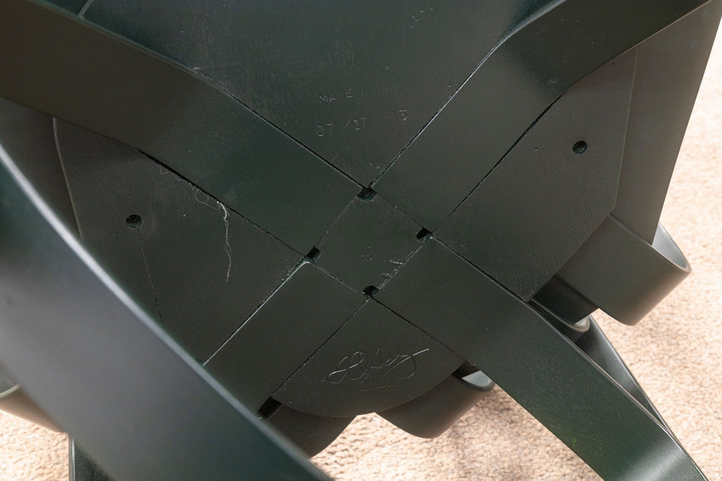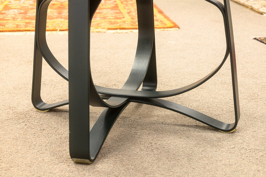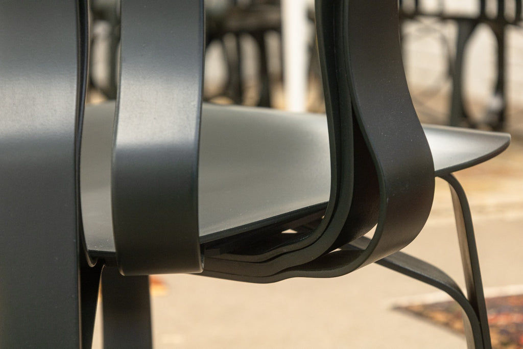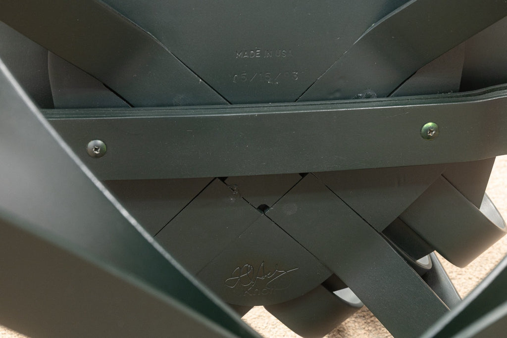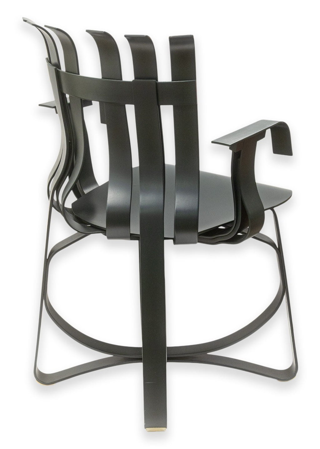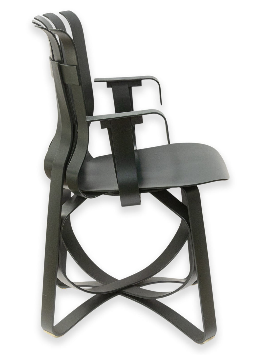 A set of vintage Frank Gehry for Knoll "Hat Trick" dining chairs. This stunning artful furniture designed by Frank Gehry and produced by Knoll features a bentwood construction with a ribbon-like design. They are inspired by Gehry's childhood, specifically by the apple crates he would play on as a child and their surprising strength and resilience. These gorgeous pieces of furniture feature white maple veneer strips, glued and woven together. The maple has been colored a deep black verdigreen color, unique from the usual Gehry chairs seen. Each chair has embossings of the Knoll name and Frank Gehry's signature on the underside, as well as the date noting 1993. The whole set is in very good condition.