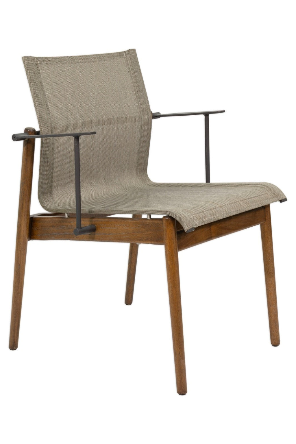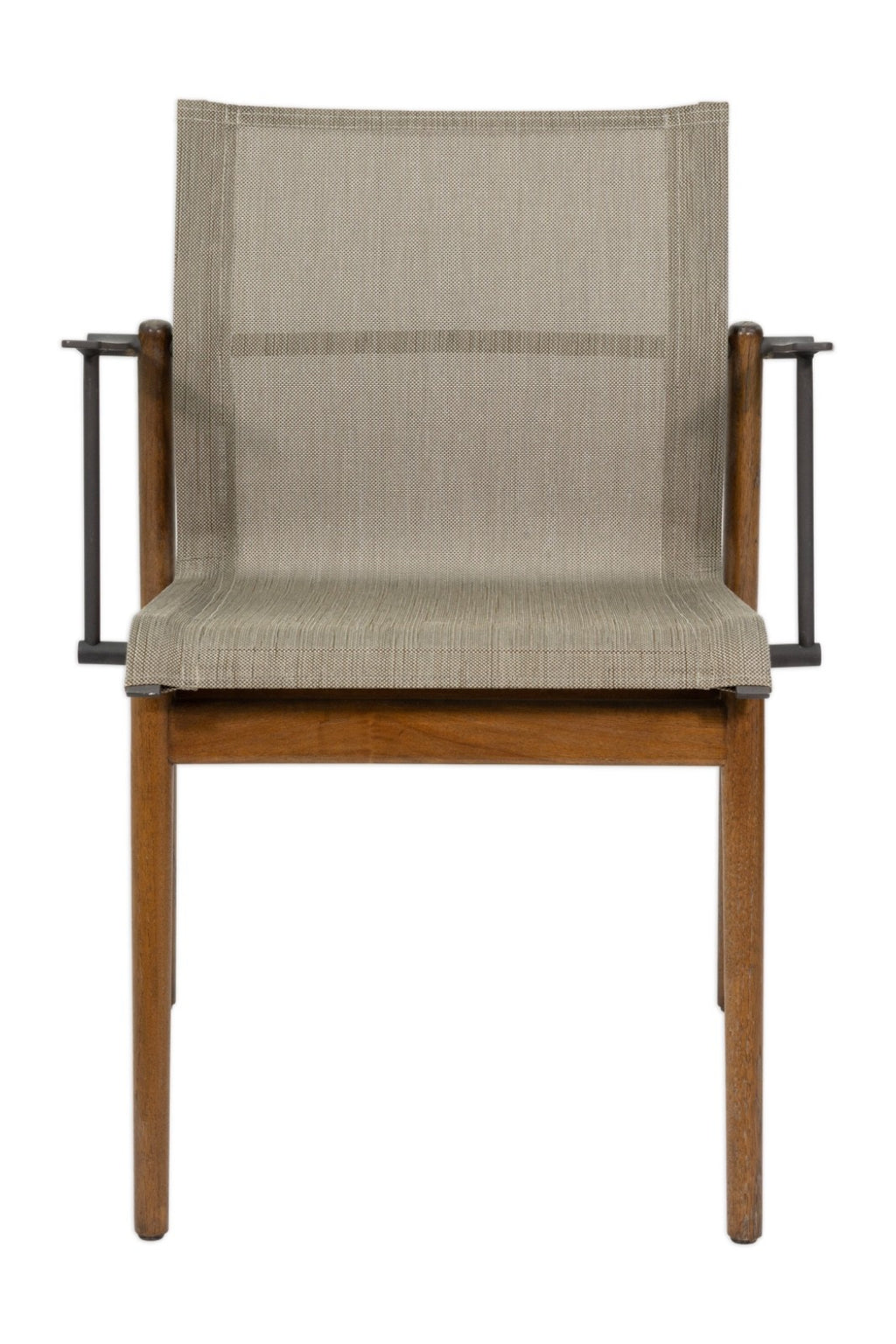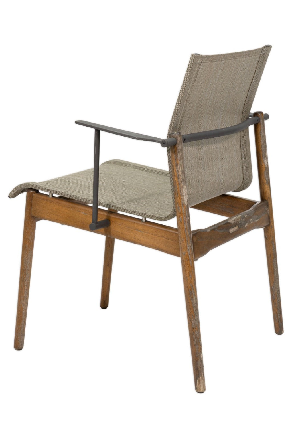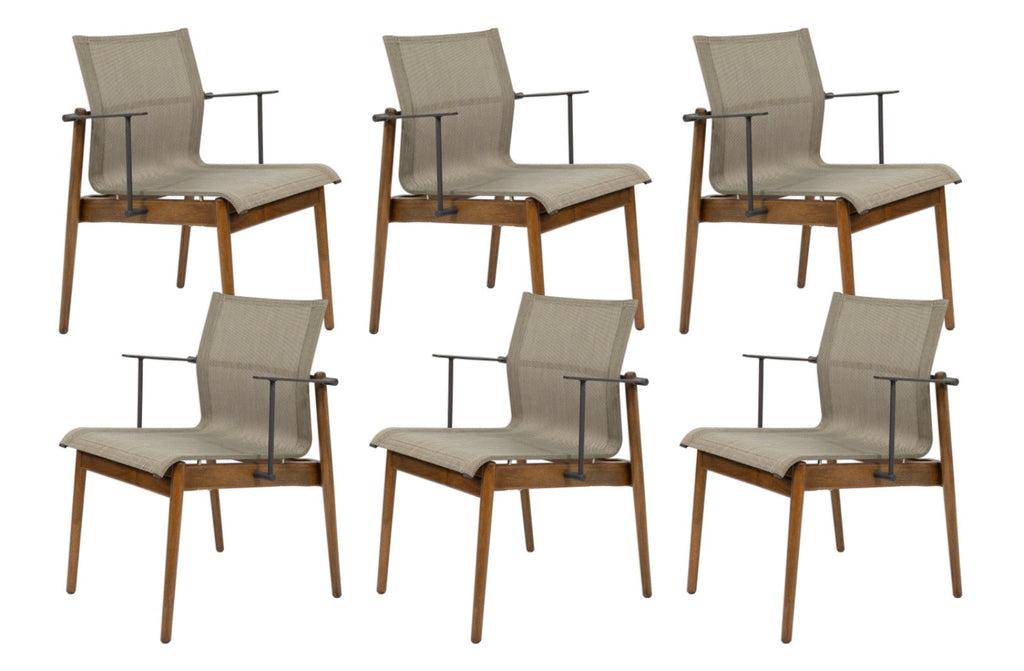 This set of six Gloster Sway stacking patio armchairs combines refined modern design with durable outdoor construction. Each chair features a warm teak wood frame paired with sleek aluminum arm supports, creating a striking balance between natural materials and contemporary structure. The gently contoured sling seat and back are formed from a durable woven outdoor textile in a neutral tone, offering both comfort and breathability for extended outdoor seating. Designed with practicality in mind, the chairs stack neatly for easy storage when not in use, making them ideal for patios, terraces, or poolside dining areas. The chairs all have some water damage to the wood frames as shown above. The chairs measure at 32.25 inches in height, 25.25 inches in width and 23.25 inches in depth. The chairs have a seat height of 18.5 inches, a seat width of 18.5 inches, a seat depth of 20 inches and an arm rest height of 7.5 inches.