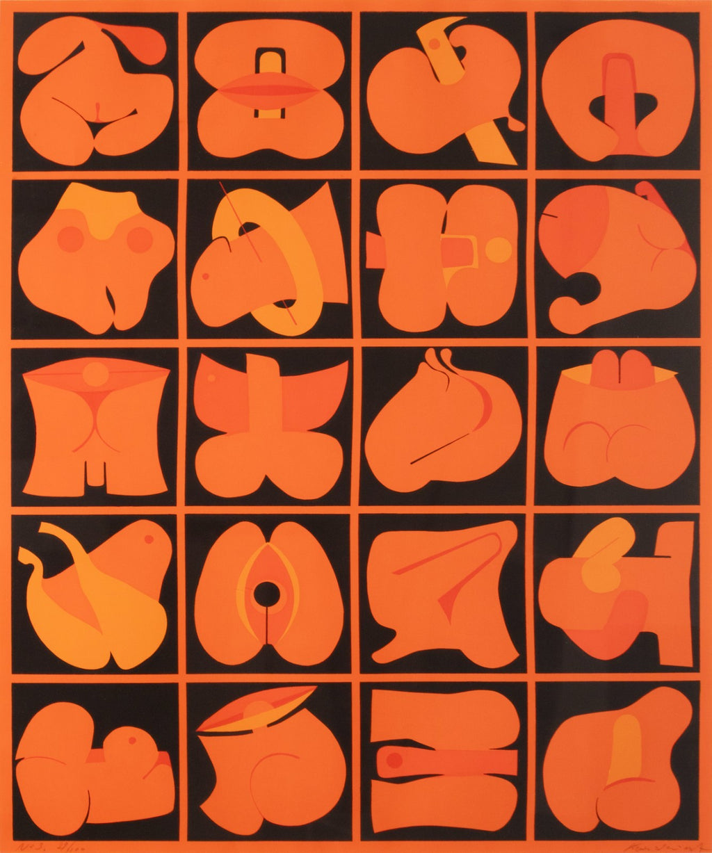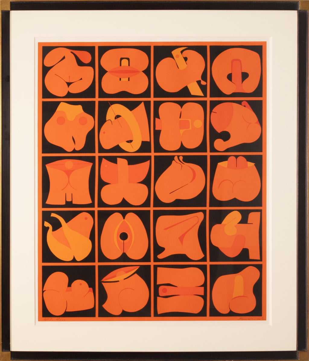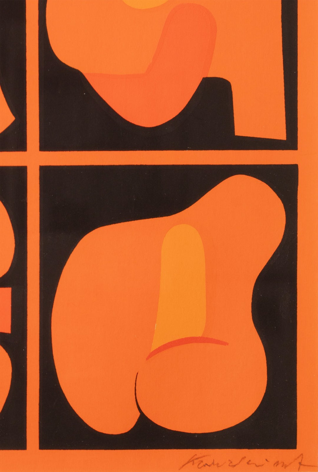 A modern serigraph in colors on paper titled "#3" Takeshi Kawashima. Hand signed in pencil on the lower right. Titled with an annotation of 27/100 on the lower left. Published in 1968. Using bold abstract language, this serigraph explores form and repetition through a grid of biomorphic shapes rendered in vivid orange and red against a black ground. The composition reflects Kawashima's signature exploration of minimalism, abstraction, and the tension between organic and geometric structures. His work bridges Eastern and Western modernist aesthetics, contributing to his recognition in the international art scene of the 1960s. From a private collection. Dimensions: 33.5"h x 28.5"w x 1"d (framed). In very good vintage condition. Full condition reports are available upon request.