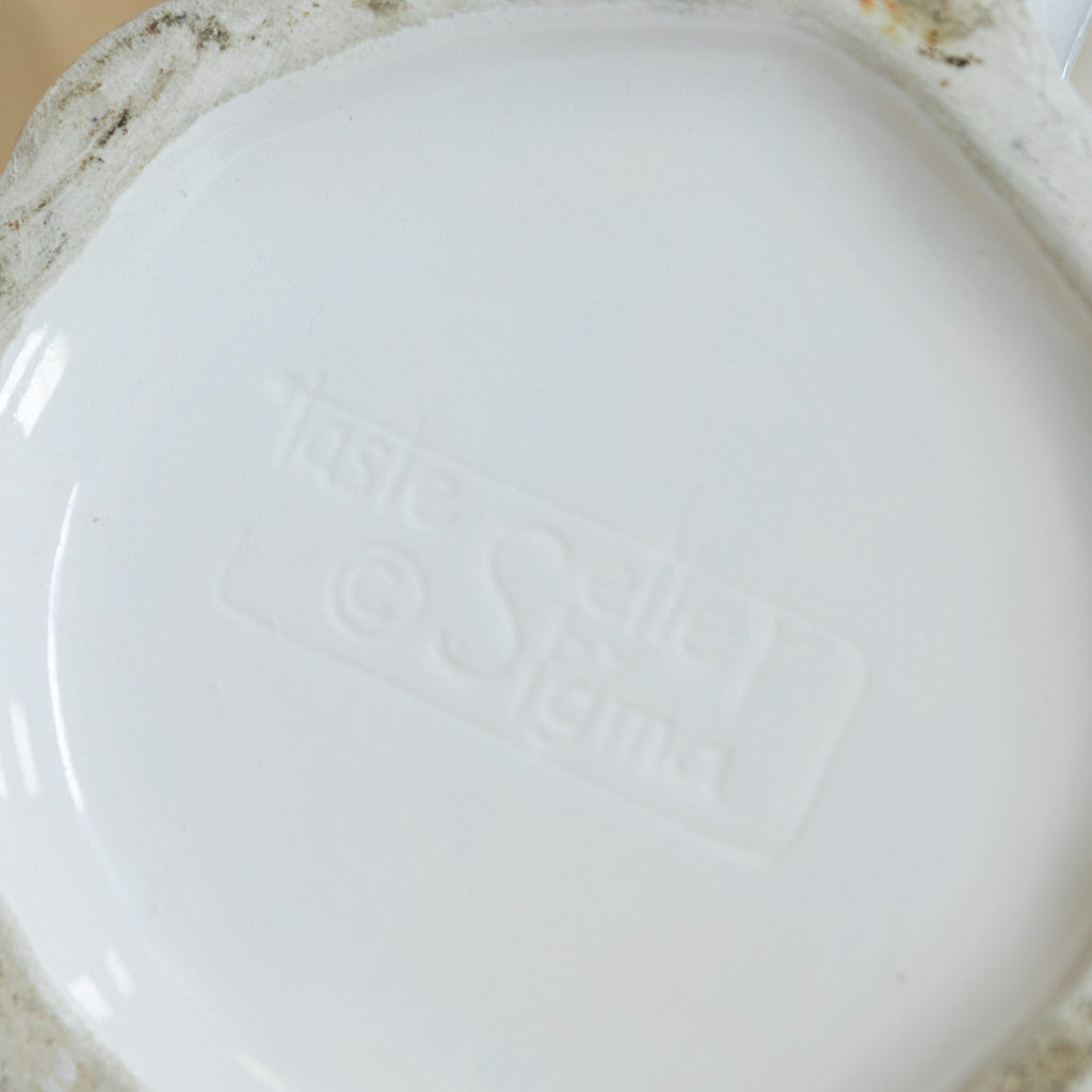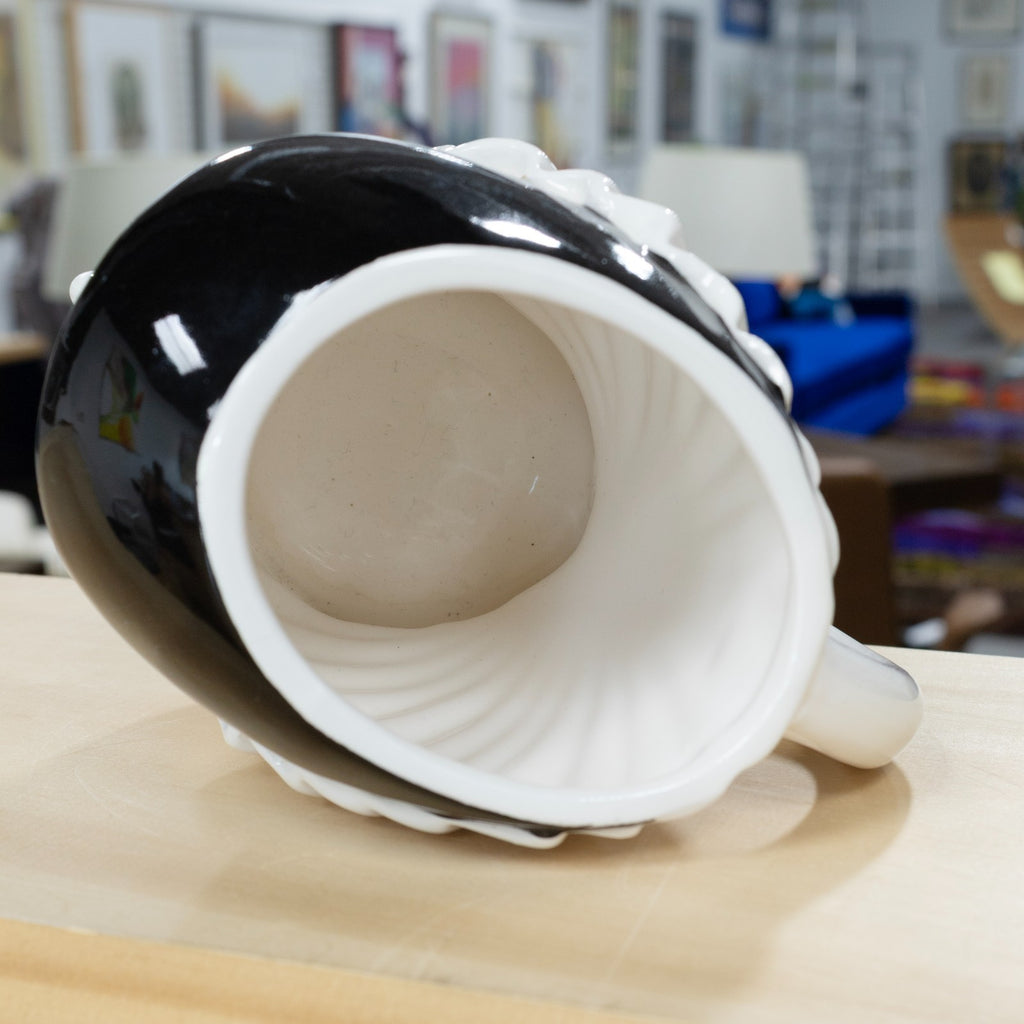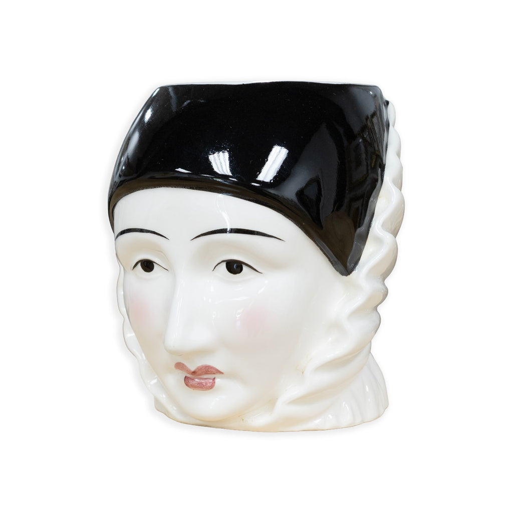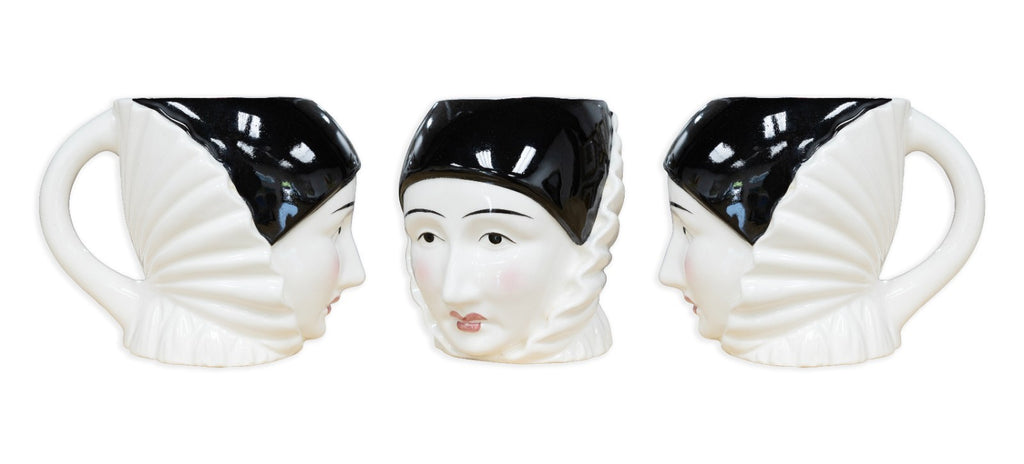 A whimsical set of ceramic mugs by Taste Setter Sigma, dating to the 1980s, each designed in the form of Pierrot - the iconic mime clown figure of French Commedia dell'Arte. Stamped on underside. Hand-painted with stylized black head coverings and delicately blushed porcelain faces, the mugs capture Pierrot's expressive and melancholic charm. Produced in Japan, these collectible mugs reflect the playful yet sculptural design sensibility that defined Sigma's decorative wares of the period. Highly decorative and nostalgic, they make a striking addition to Postmodern ceramic collections or vintage tabletop displays. From a private collection. Dimensions: 4.5"h x 4.5"w x 6"d. In very good vintage condition. Full condition reports are available upon request.