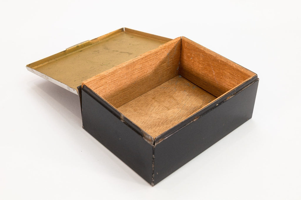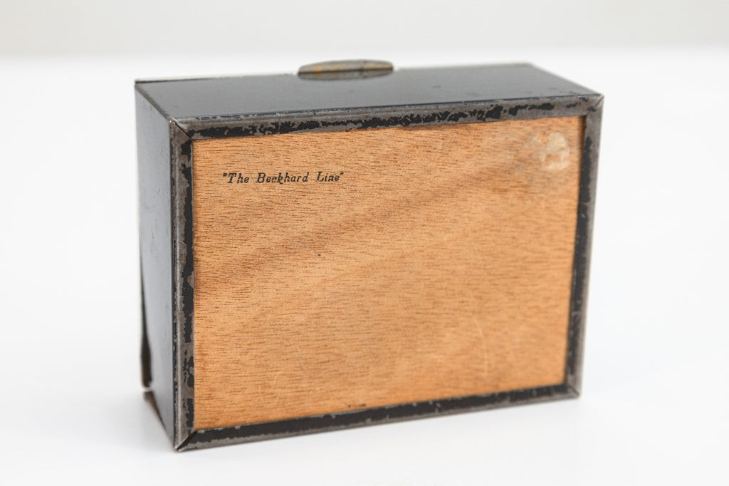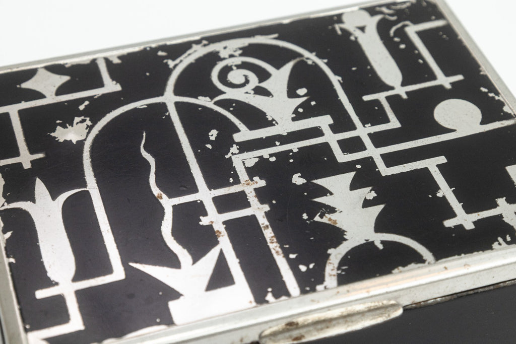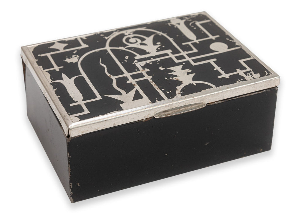 A striking Art Deco black lacquered wooden box from The Beckhard Line, dating to the 1930s. The hinged lid is decorated with a bold chrome inlay design featuring geometric and abstract motifs in the modernist spirit of the Machine Age. The box's streamlined form is balanced by its graphic surface design, reflecting the era's fascination with both functionality and ornamentation. Stamped "The Beckhard Line" on the underside. A rare and stylish collectible that bridges decorative and utilitarian design, perfect for display or use as a jewelry holder. From a private collection. Dimensions: 1.75"h x 4.25"h x 3.5"w. In good vintage condition consistent with age.