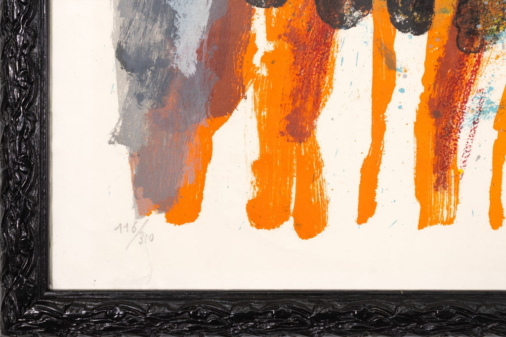 A contemporary lithograph in colors on paper titled "Seranade pour une Muse" by French-Israeli artist Theo Tobiasse. Hand signed in pencil on the lower right with an annotation of 116/310 on the lower left. The composition features dynamic, overlapping figures rendered in bold strokes of blue, red, yellow, and green, evoking both intimacy and theatricality. Tobiasse's painterly approach and symbolic compositions draw on his rich cultural heritage, infusing the scene with emotional depth and dreamlike allure.