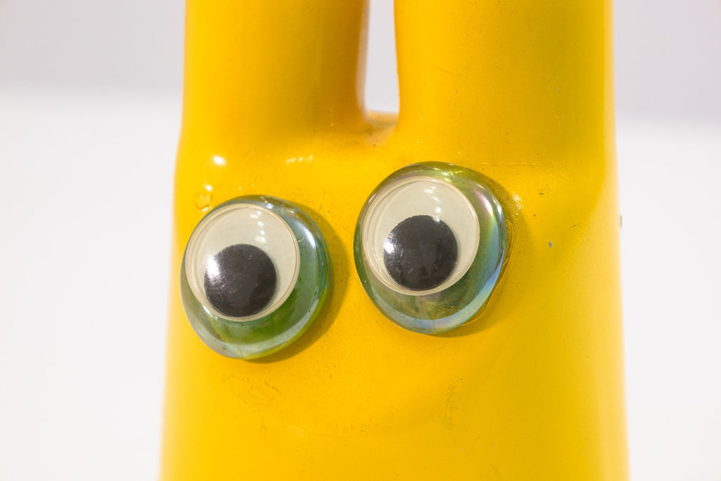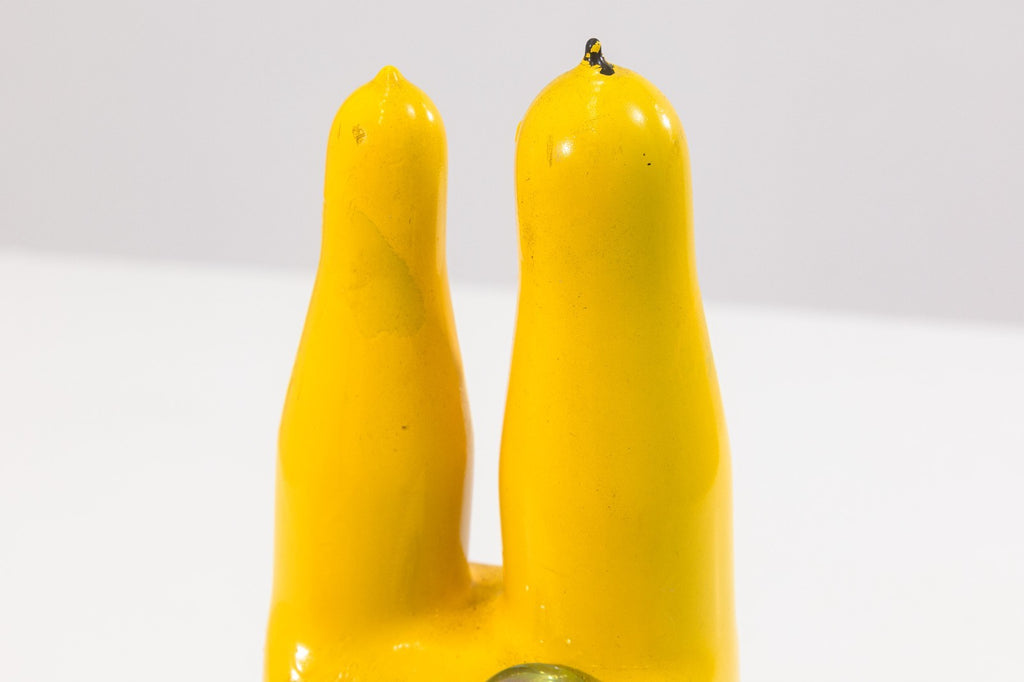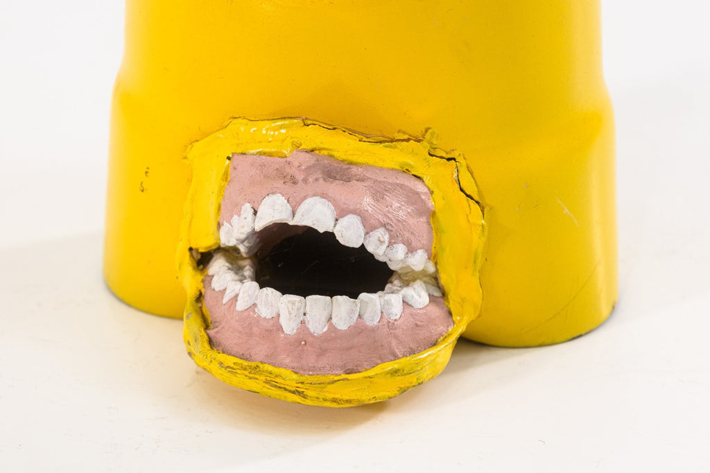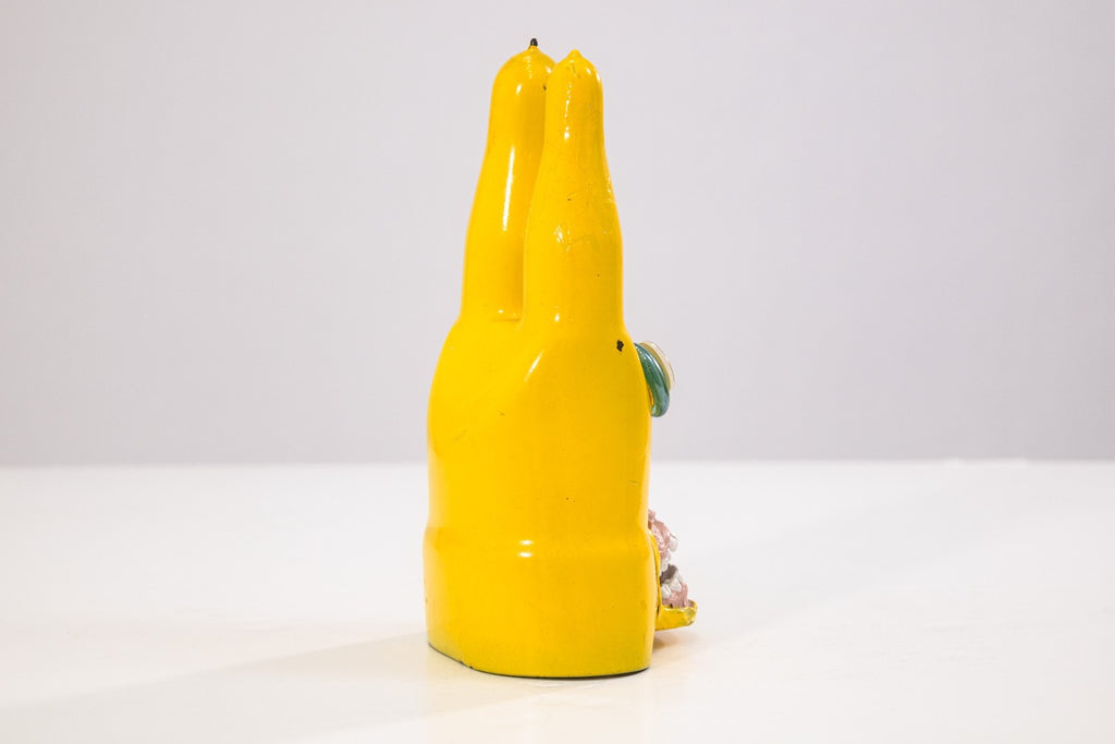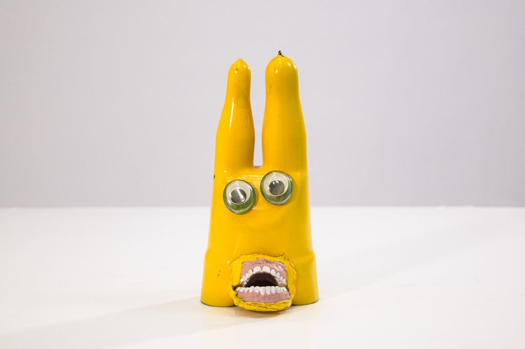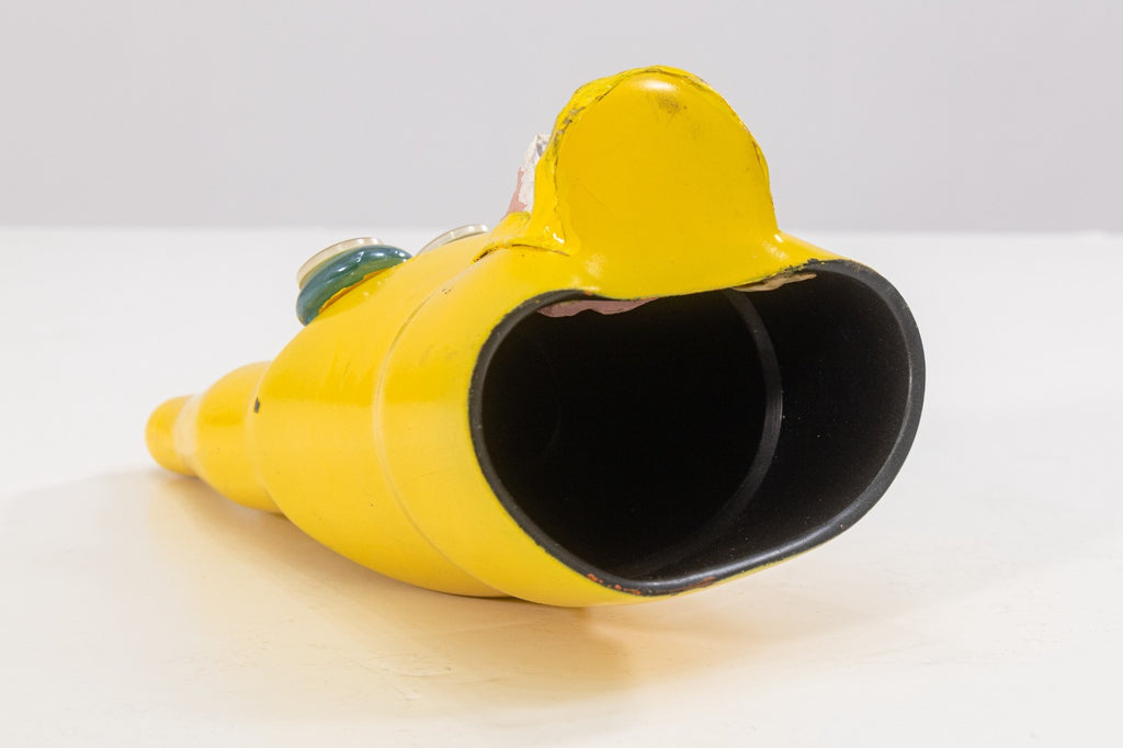 A mixed-media sculpture titled “I’m Not Crazy” by Tim Burke, c. 2000s. The sculpture depicts a stylized yellow figure with elongated ear-like forms, applied glass eyes, and an open mouth with modeled teeth. The work is executed in painted composite material with attached elements. The surface shows the artist’s characteristic hand-finished texture and expressive detailing. This example reflects Burke’s interest in exaggerated facial features and psychological themes, making it a representative work for collectors of contemporary figurative and character-based sculpture. From a private collection in Metro Detroit. Acquired at a gallery in Detroit. Dimensions: 10”h x 4.75”w x 4.5”d. In very good vintage condition. Full condition reports available upon request. Tim Burke is a contemporary American artist known for his irreverent, psychologically charged sculptures that merge figuration with pop-influenced surrealism. Working primarily in mixed media, Burke creates highly expressive, character-driven forms that blur the line between humor and unease. His work often features exaggerated facial elements, bold color, and cartoon-like distortion, exploring themes of identity, emotion, and the absurdity of modern life. Burke’s sculptures have been exhibited in galleries across the United States and are collected for their distinctive blend of outsider aesthetics and contemporary narrative sensibility.