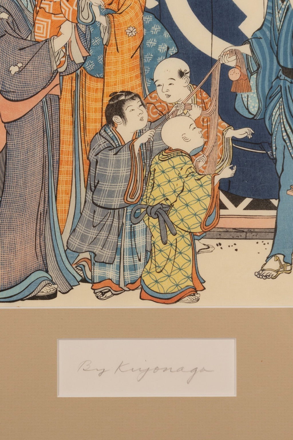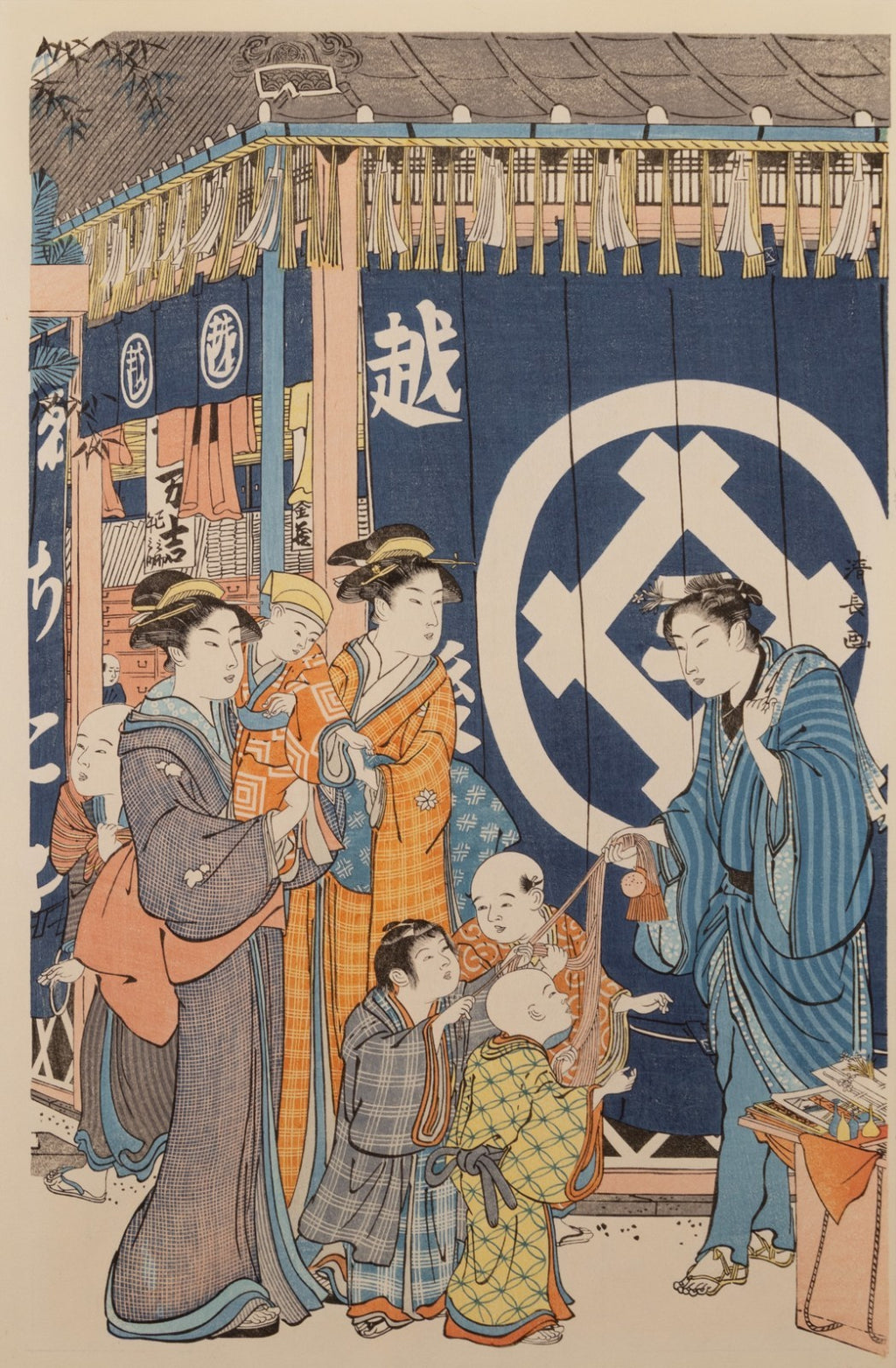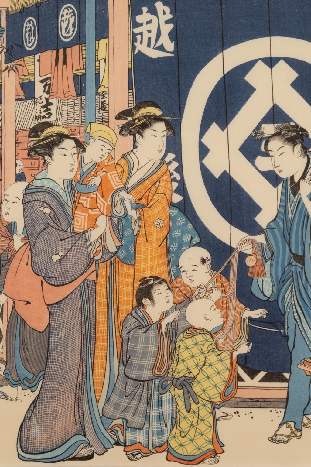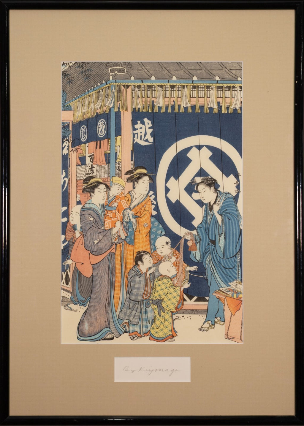 A modern color ukiyo-e woodblock print on paper titled "The Echigoya on New Year's Day" by Torii Kiyonaga. This example is a later impression, originally created between 1784 and 1794. This vibrant scene captures an elegantly dressed women and children interact with a merchant amid festive New Year's celebrations. Rendered in rich blues, oranges, and delicate patterns, the composition exemplifies Kiyonaga's mastery of bijin-ga (images of beautiful women) and genre scenes of urban life. This later impression retains the crisp linework, harmonious color balance, and refined detail that make the original an enduring masterpiece of the Edo period, while offering the precision and freshness of modern Japanese woodblock craftsmanship. From a private collection. Dimensions: 16"h x 10.5"w (unframed) / 22.75"h x 16.5"w x .25"d (framed). In very good vintage condition. Full condition reports are available upon request.