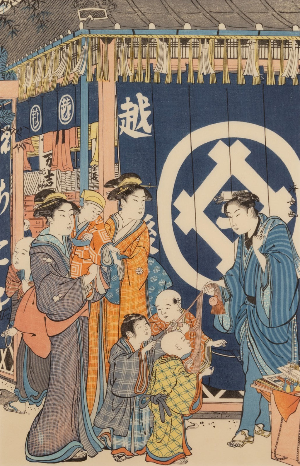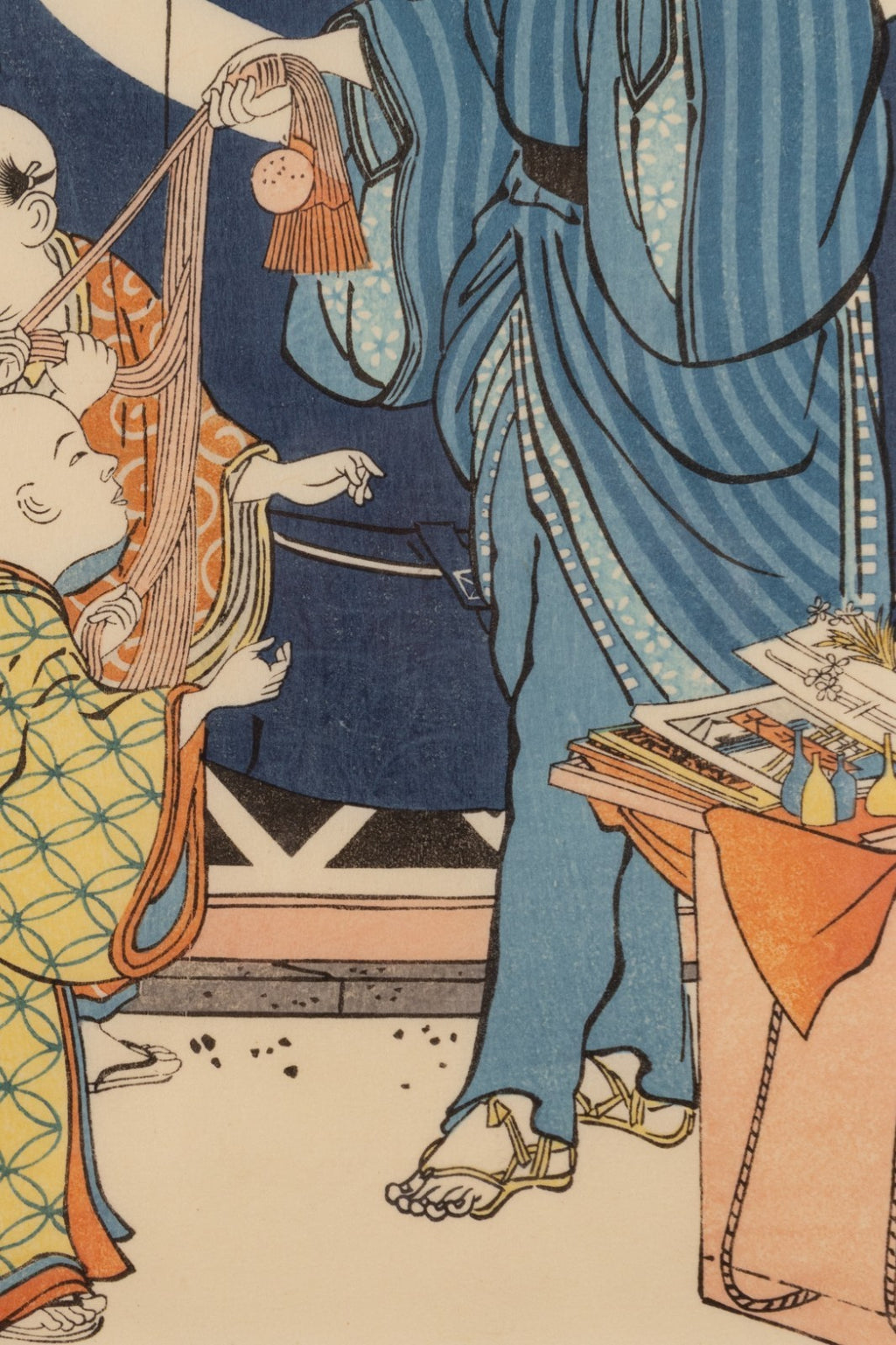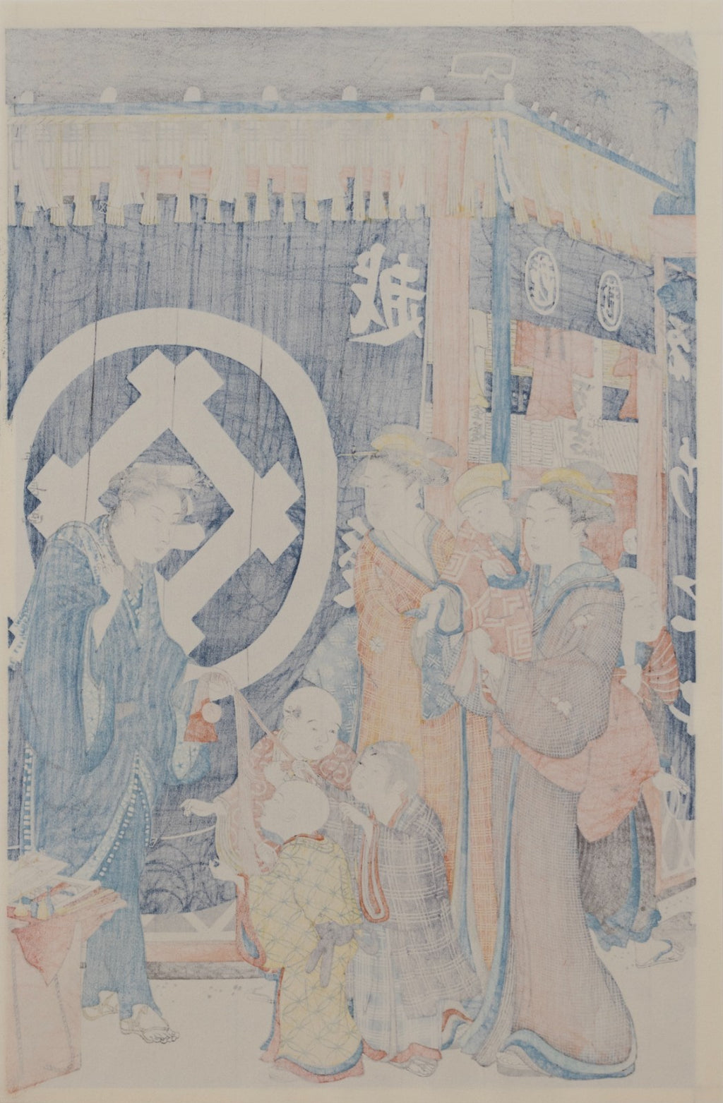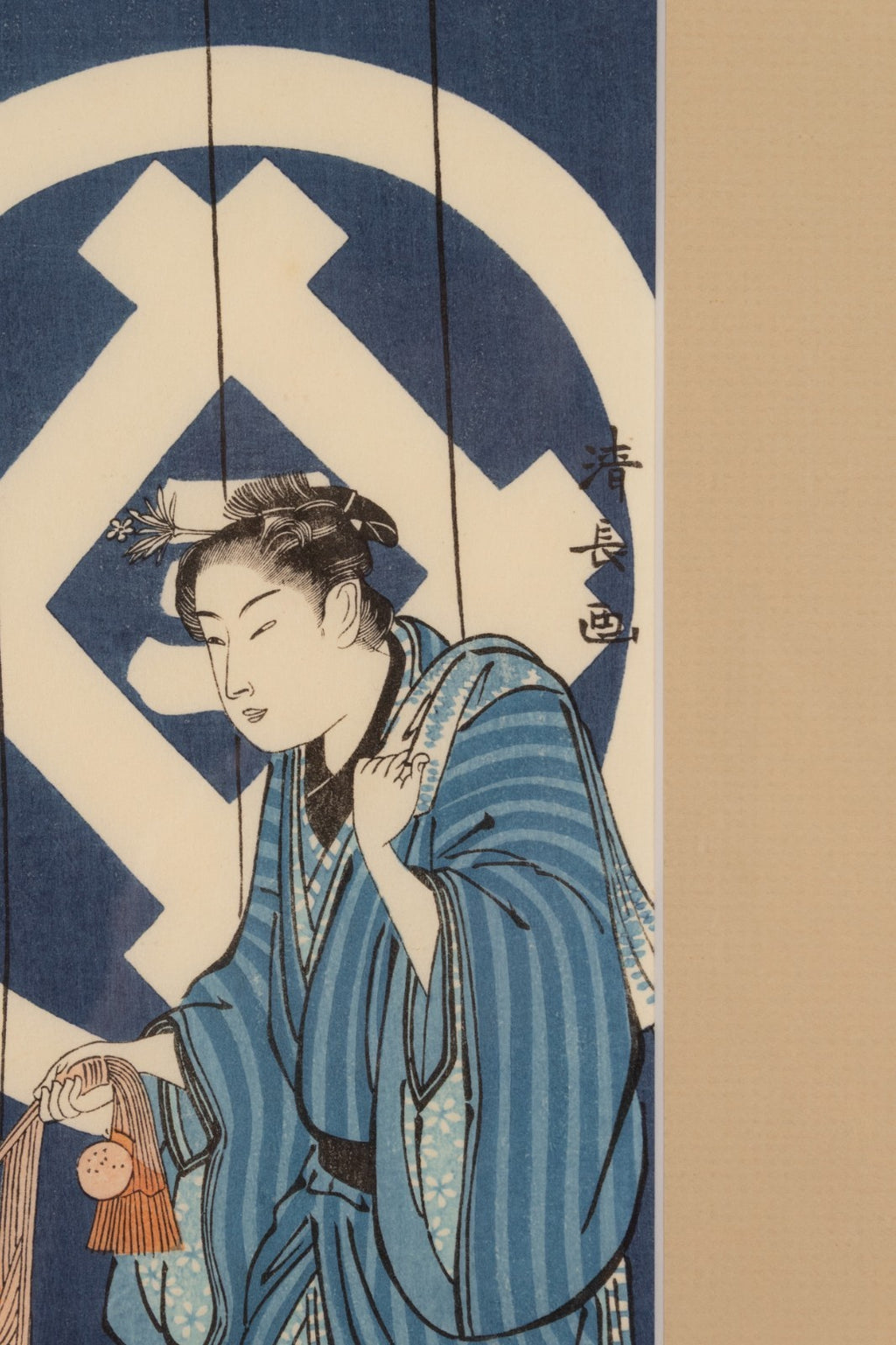 A modern color ukiyo-e woodblock print on paper titled "The Echigoya on New Year's Day" by Torii Kiyonaga. This example is a later impression, originally created between 1784 and 1794. This vibrant scene captures an elegantly dressed women and children interact with a merchant amid festive New Year's celebrations. Rendered in rich blues, oranges, and delicate patterns, the composition exemplifies Kiyonaga's mastery of bijin-ga (images of beautiful women) and genre scenes of urban life. This later impression retains the crisp linework, harmonious color balance, and refined detail that make the original an enduring masterpiece of the Edo period, while offering the precision and freshness of modern Japanese woodblock craftsmanship. From a private collection. Dimensions: 16"h x 10.5"w (unframed) / 22.75"h x 16.5"w x .25"d (framed). In very good vintage condition. Full condition reports are available upon request.