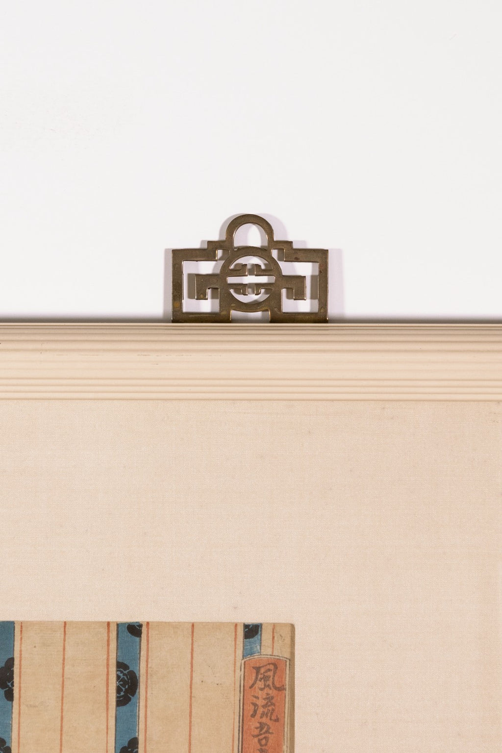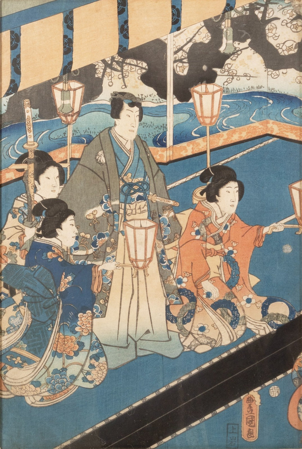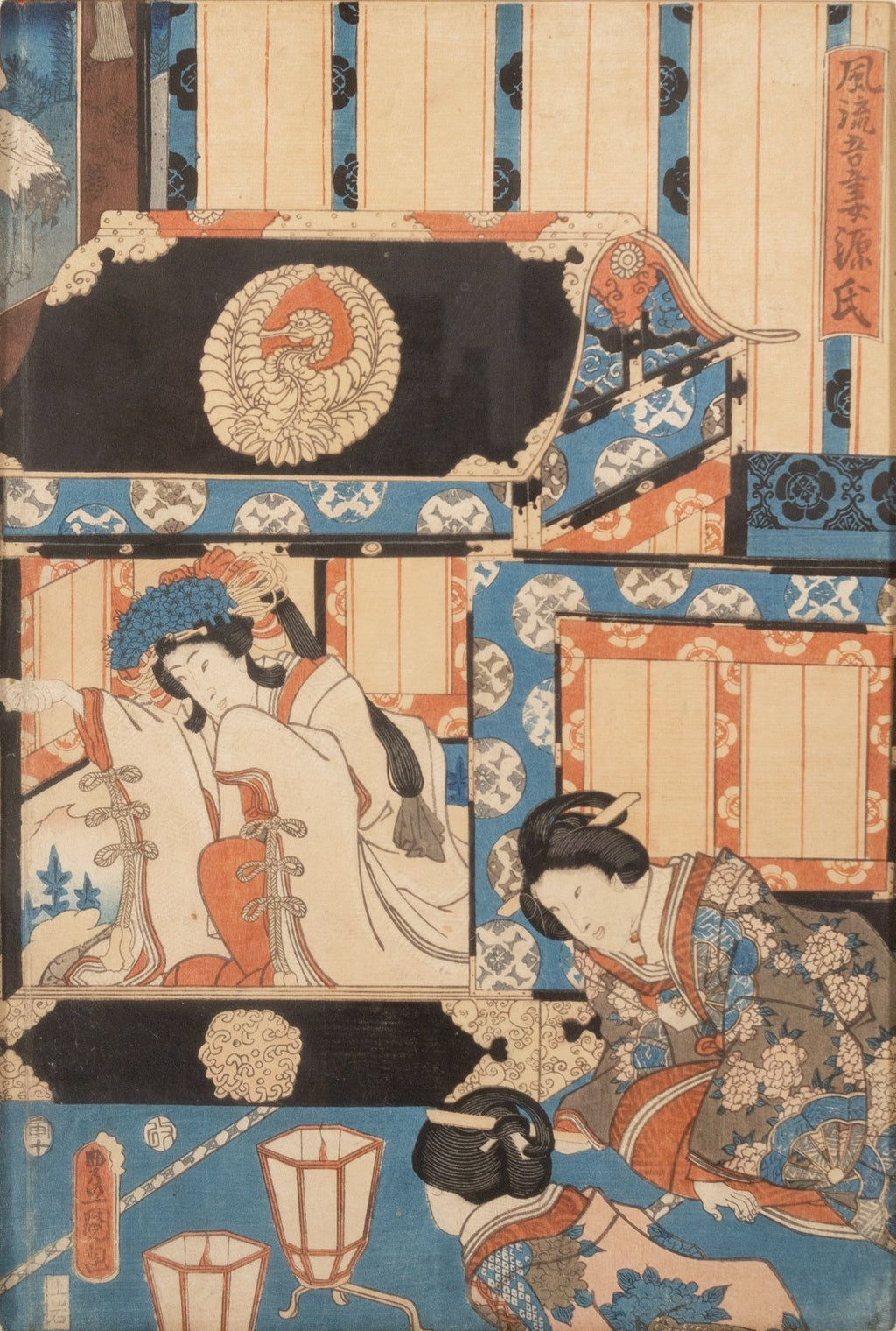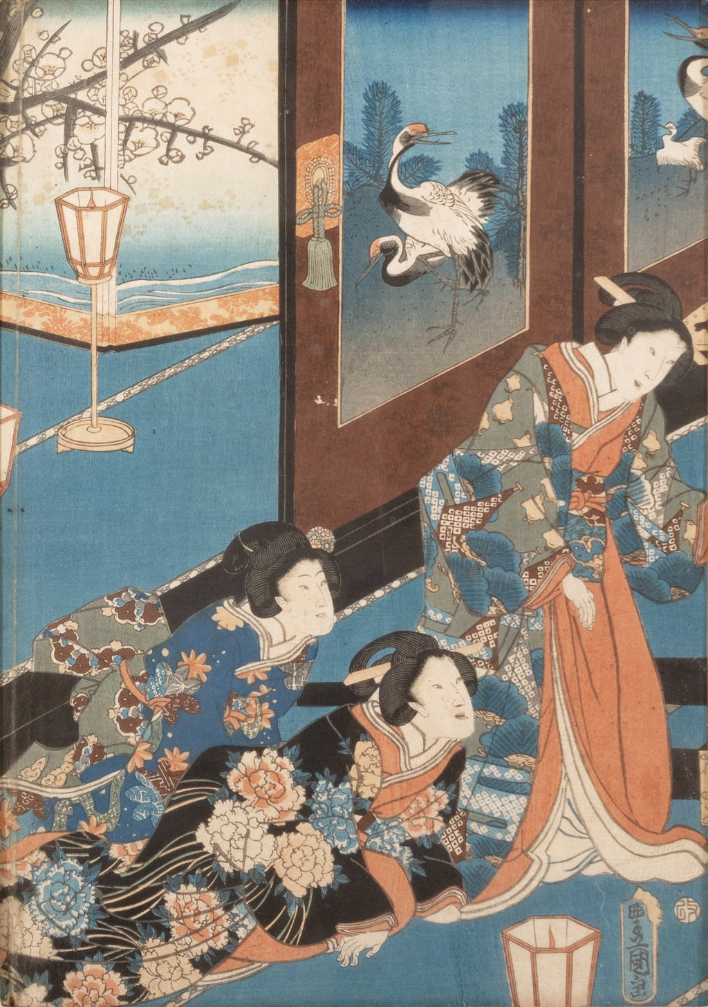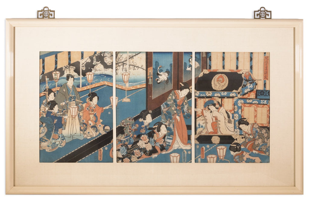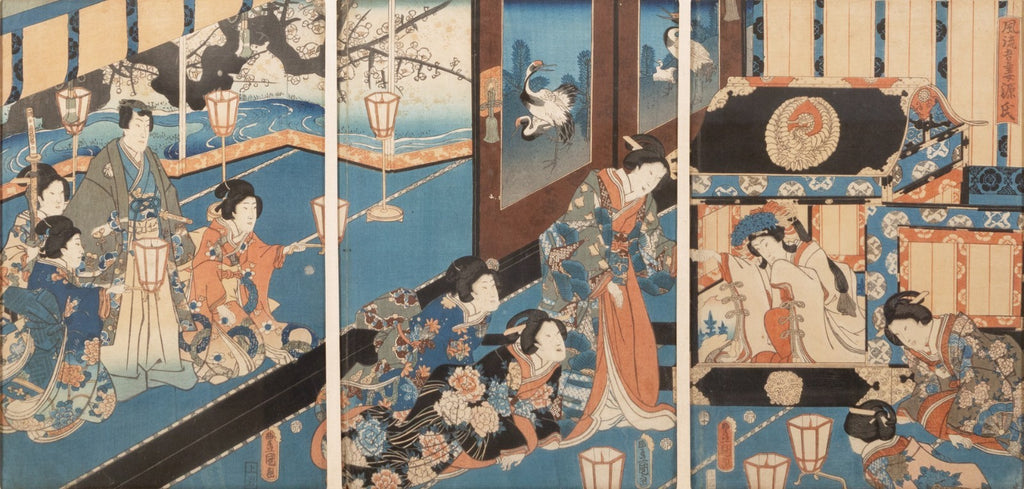 A captivating and finely detailed original ukiyo-e woodblock print triptych by Utagawa Kunisada (1786-1865), one of the most prolific and popular woodblock print artists of the Edo period. The triptych features elegant courtesans and noble figures adorned in sumptuous kimono, framed within a luxurious interior scene with intricate architectural elements and seasonal references such as blossoming plum trees and paper lanterns. Rendered with vibrant colors and fine patterning, the print exemplifies Kunisada's mastery of fashion, theatricality, and narrative in woodblock art. This triptych remains a remarkable example of 19th-century Japanese printmaking and the Genji-e genre.
