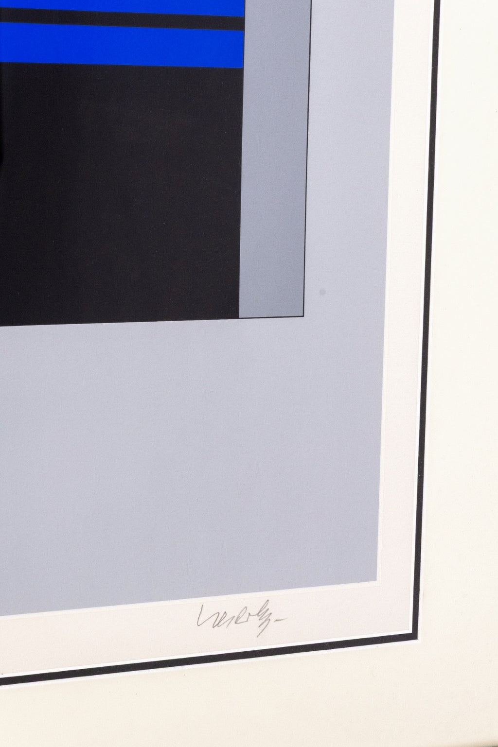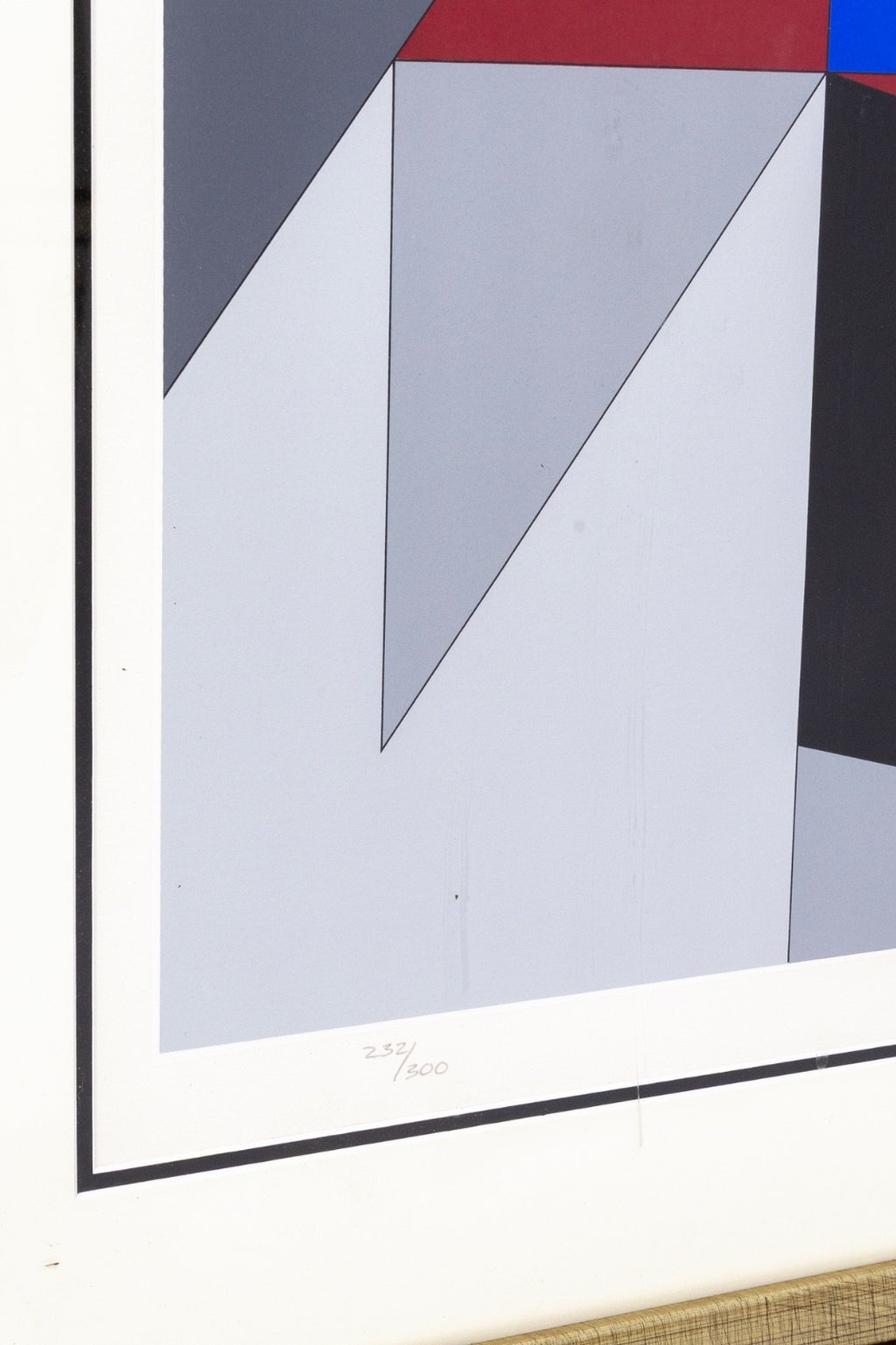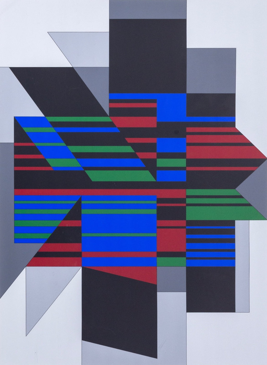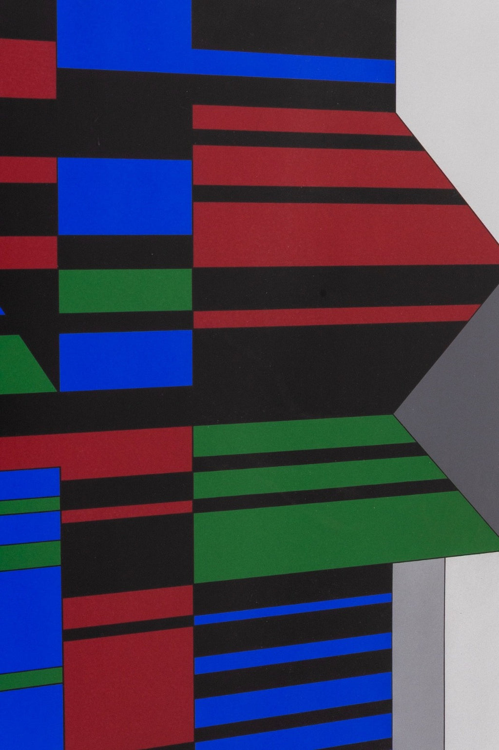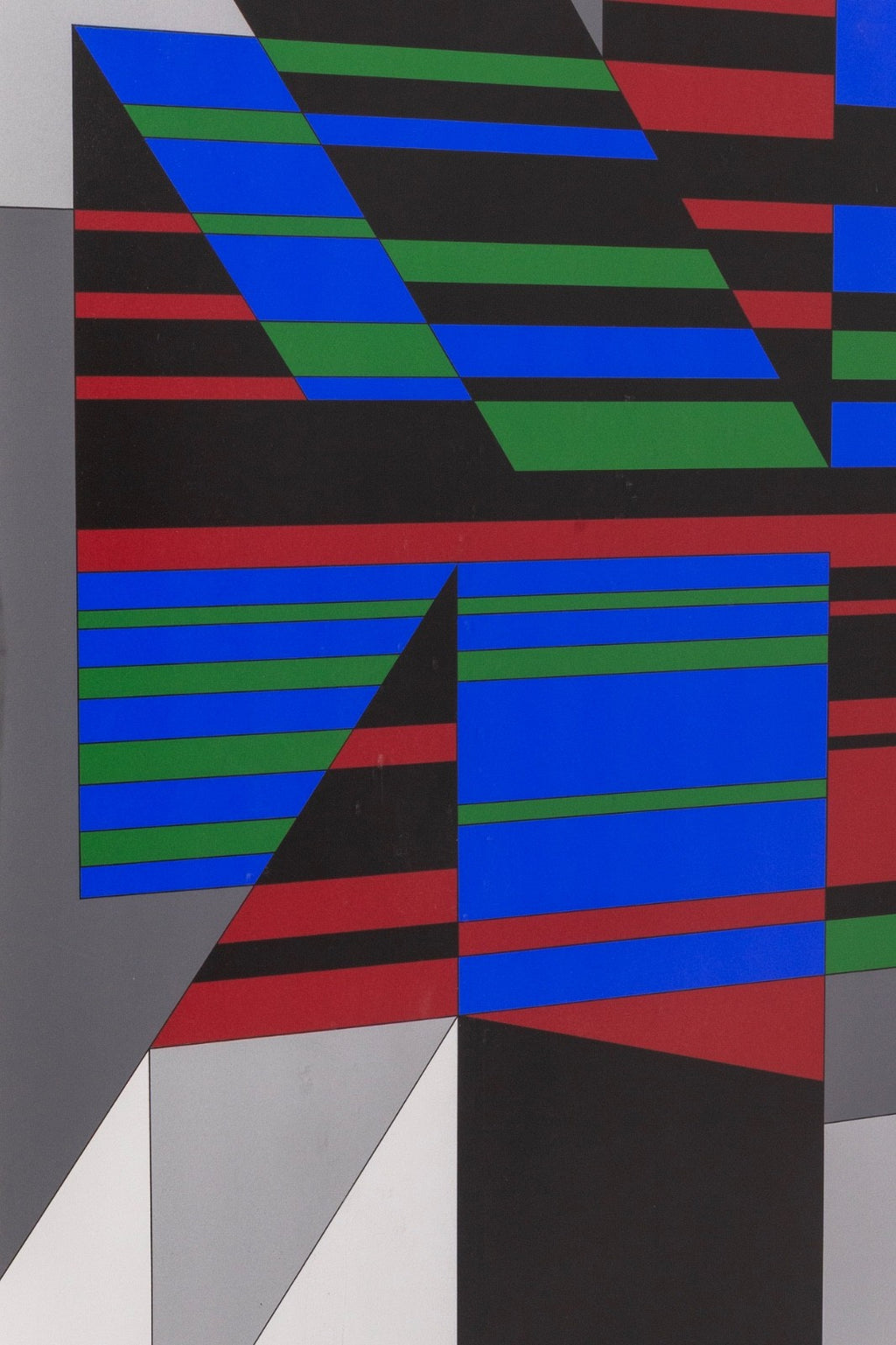 The composition is built from overlapping angular forms in shades of black, gray, and blue, punctuated by vivid red and green striped segments that create a dynamic sense of depth and movement. Vasarely’s precise use of color contrasts and layered geometry engages the viewer’s perception, producing the illusion of shifting planes and vibrating space. A visually captivating and collectible work by the "father of Op Art."