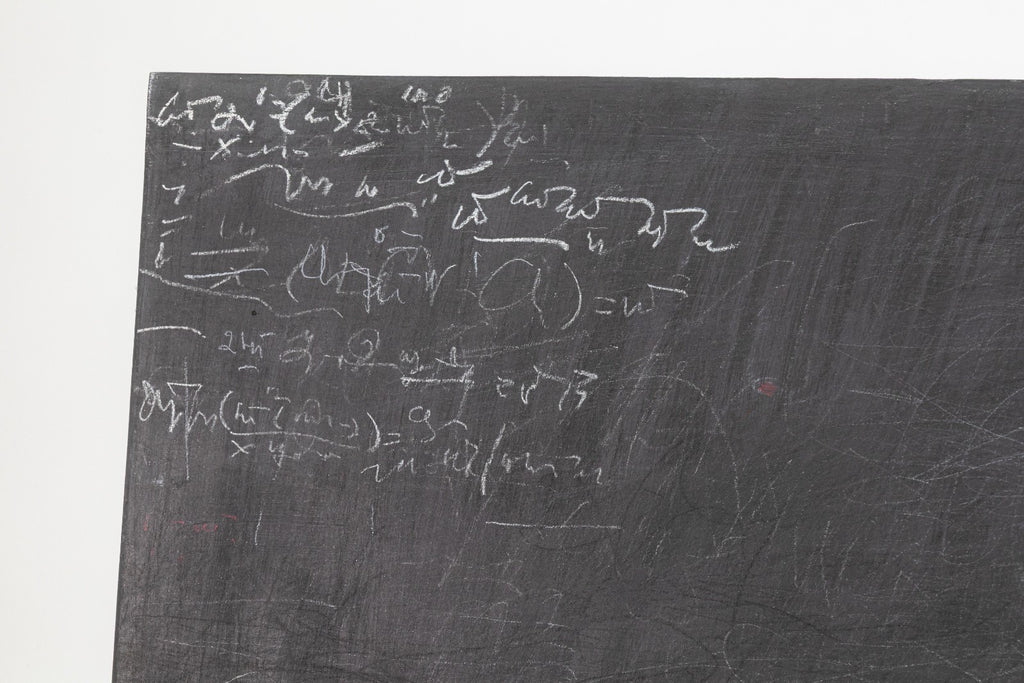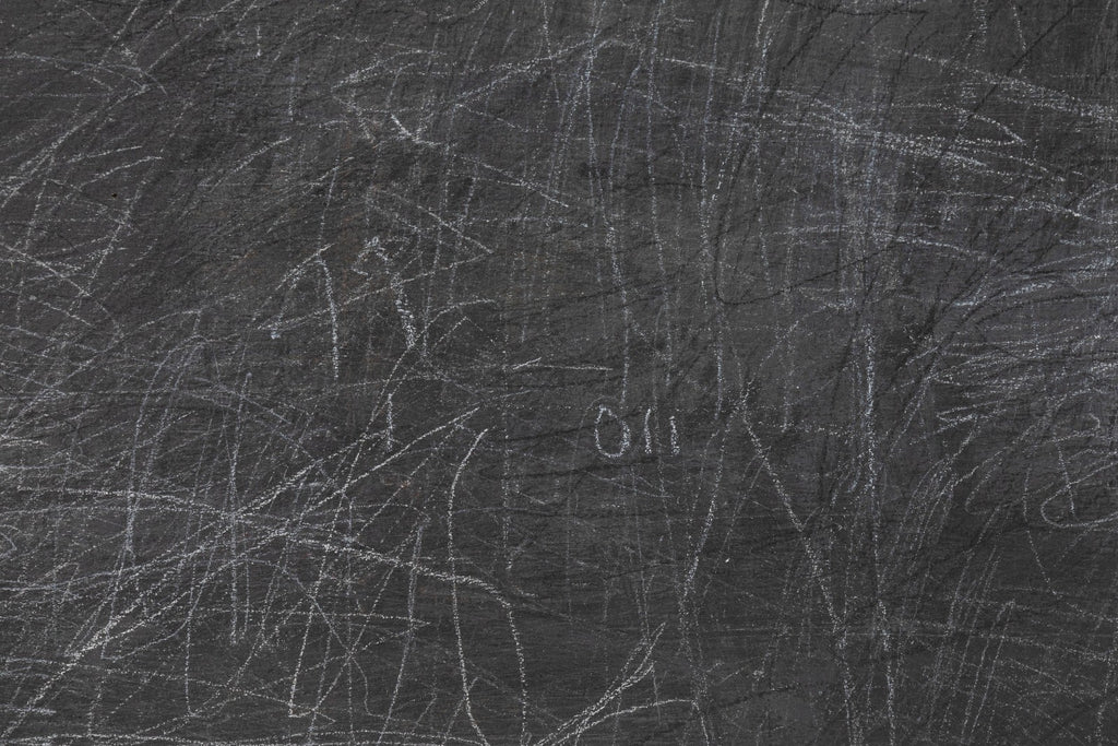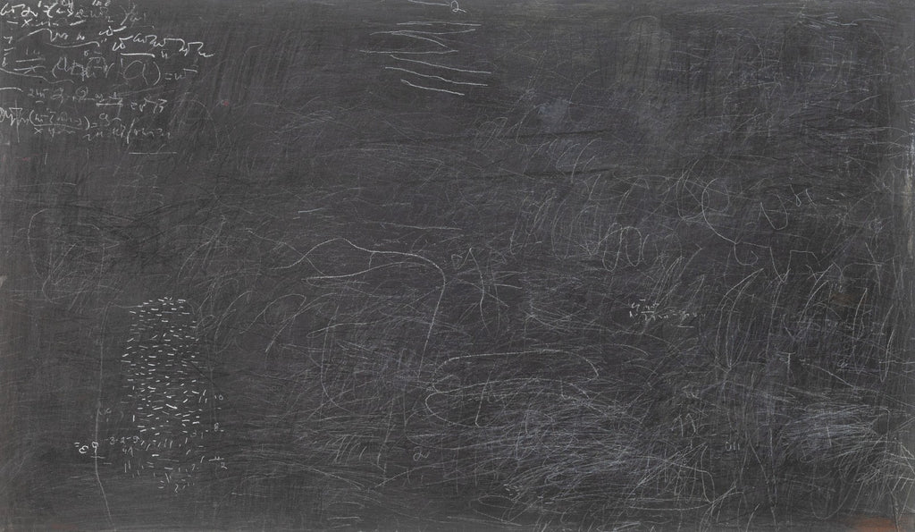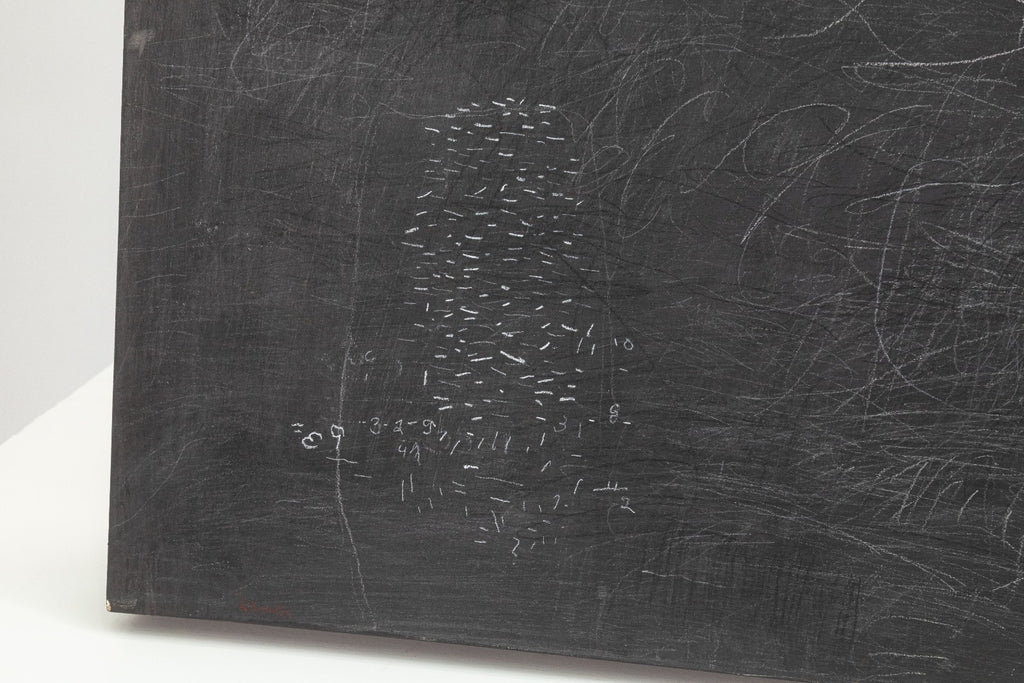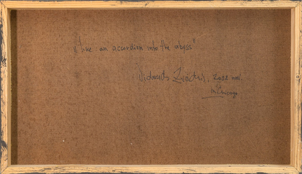 A contemporary mixed media work titled "Like An Accordion Into The Abyss" by Latvian-born artist Vidvuds Zviedris. Signed, titled, and dated 2008 on the verso. The composition evokes the textured surface of a chalkboard layered with enigmatic inscriptions, gestures, and markings. The dark ground is animated by scattered white lines and faint traces of writing, suggesting both mathematical notation and lyrical abstraction. Zviedris creates a visual field that feels simultaneously chaotic and meditative, inviting viewers to consider memory, language, and the elusive boundary between order and entropy. From a private collection. Dimensions: 17.5"h x 30"w x 1.75"d. In very good condition.