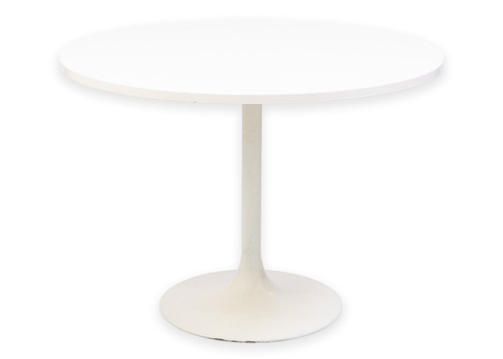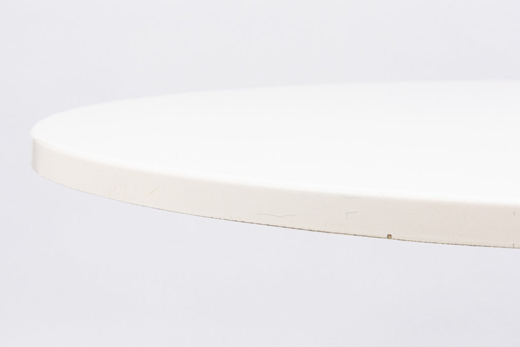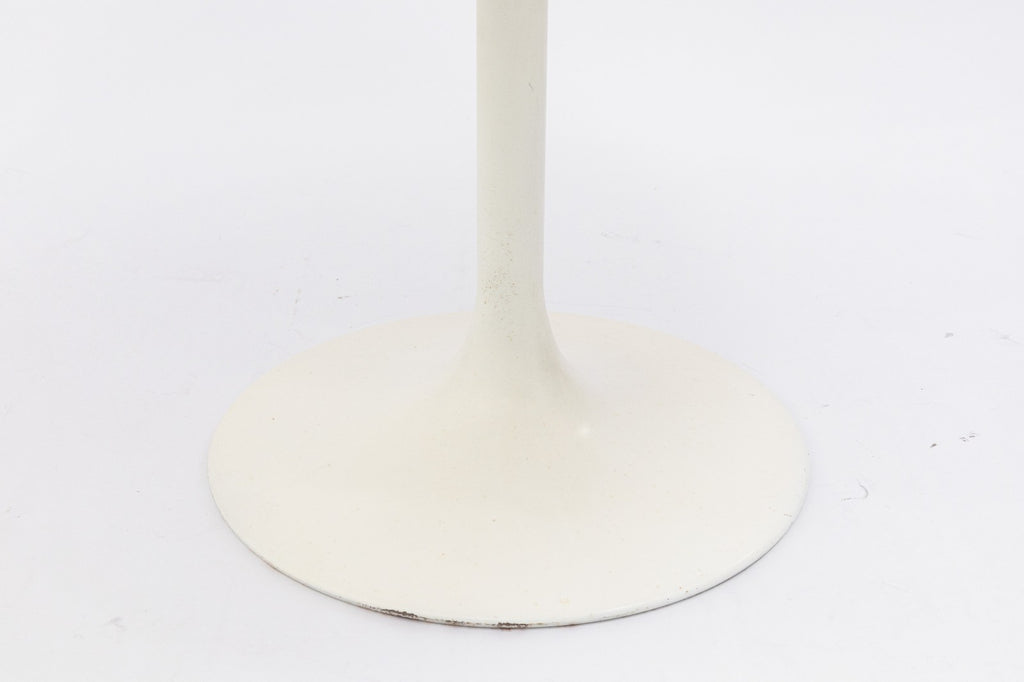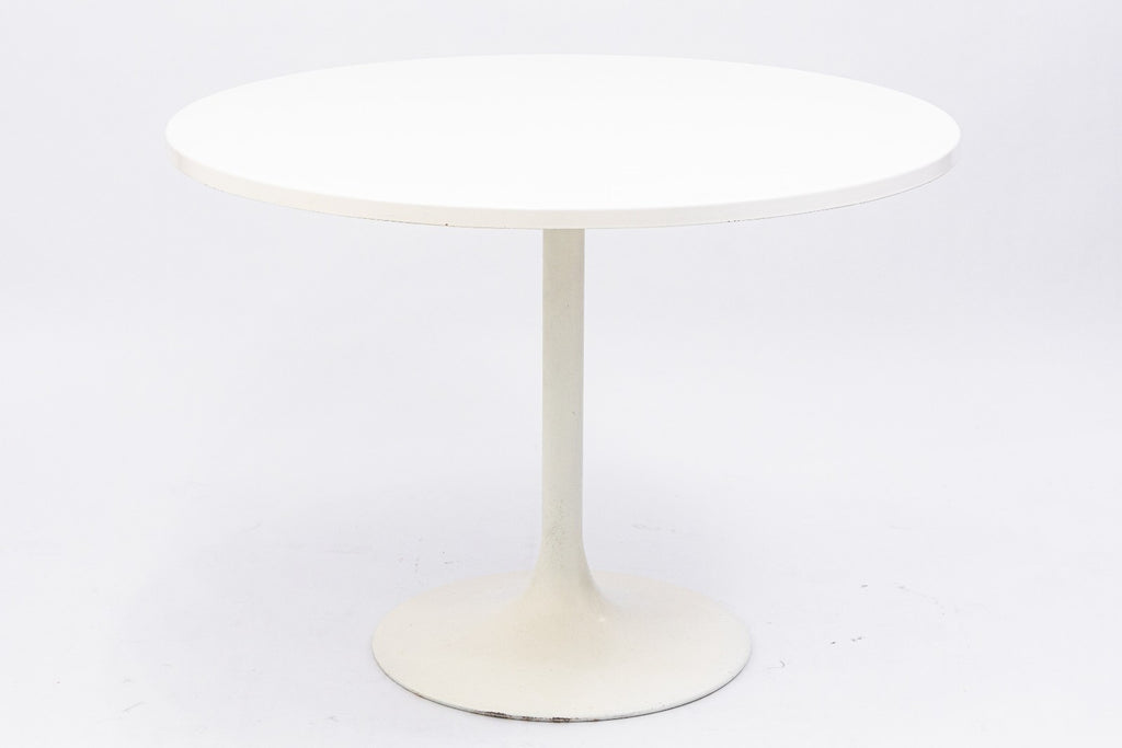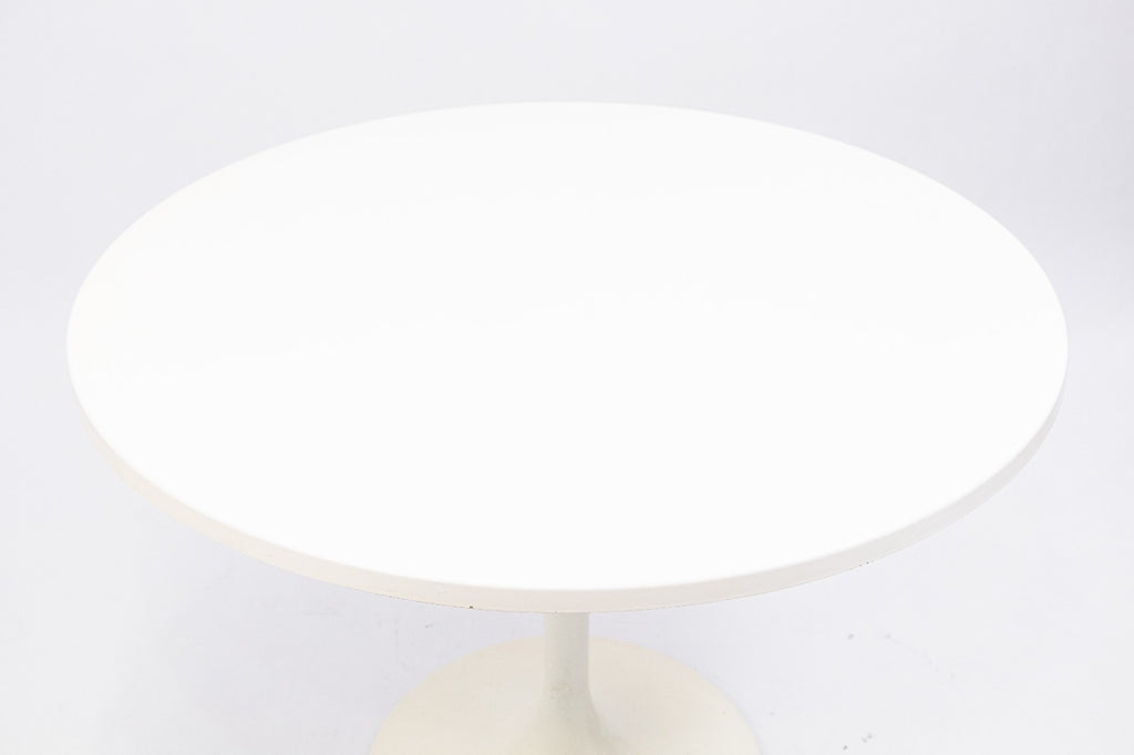 A vintage Borge Johansen tulip table. This is a classic mid century modern dinette table featuring the iconic tulip base design. The base is made of metal and finished with a white paint, while the table top is constructed with a fiberglass and laminate top. This table is in good vintage condition overall, but has some scratches through the base. This table even has the original tagging on the underside as pictured. This table measures 28.25 inches tall, has a 39 inch table top diameter, and a 20 inch base diameter.