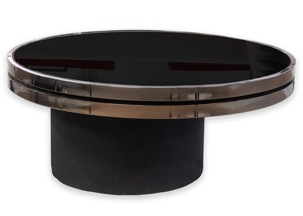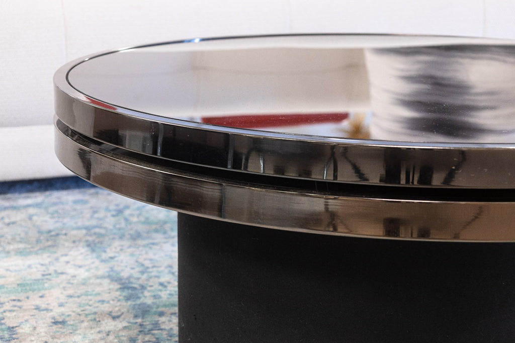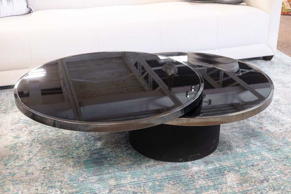 A vintage 1970s DIA black smoked glass coffee table. This super cool, super chic coffee table features a round table top design with an offset black base. The table top consists of two tiers, with the top tier rotating around for a highly adjustable look and experience. Each table is finished with a black mirror smoked glass with chrome trim. This coffee table is in good vintage condition. It measures 14.5 inches tall, has a diameter of 36 inches, and a maximum length of 54 inches when extended.