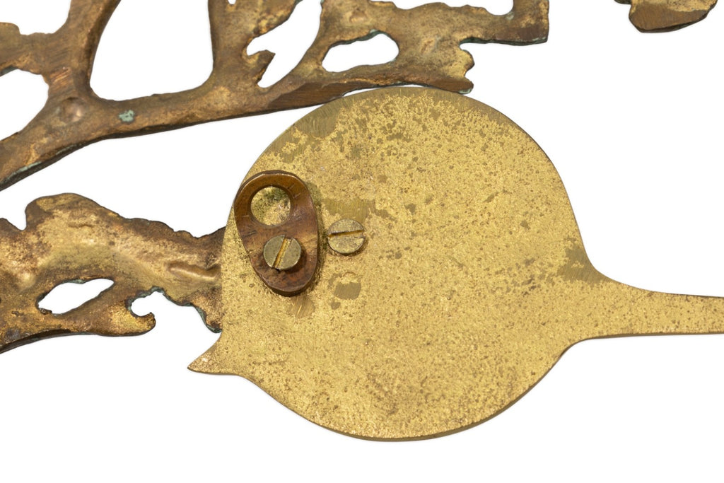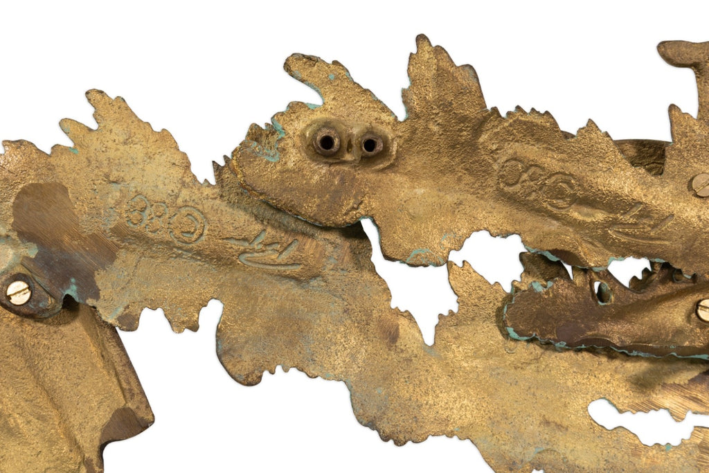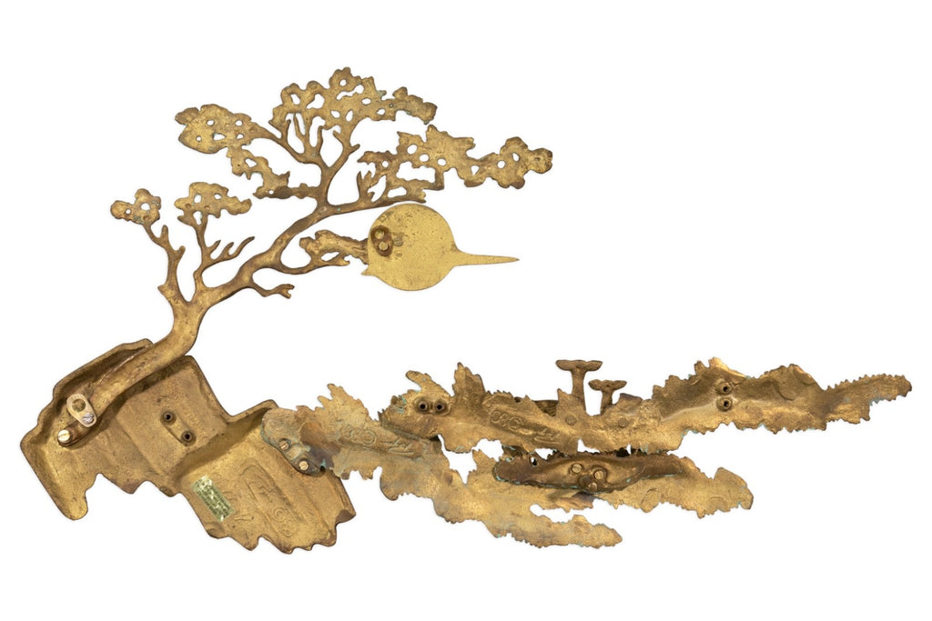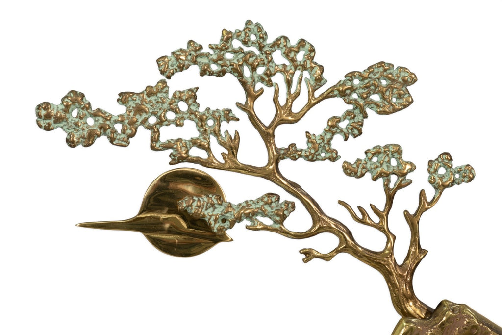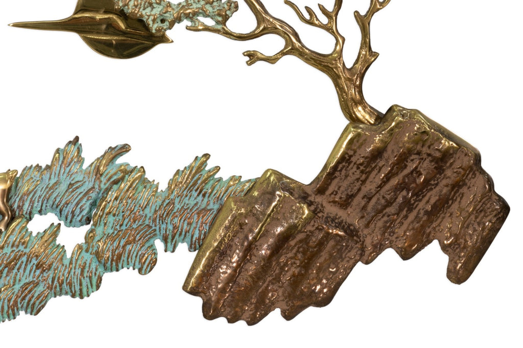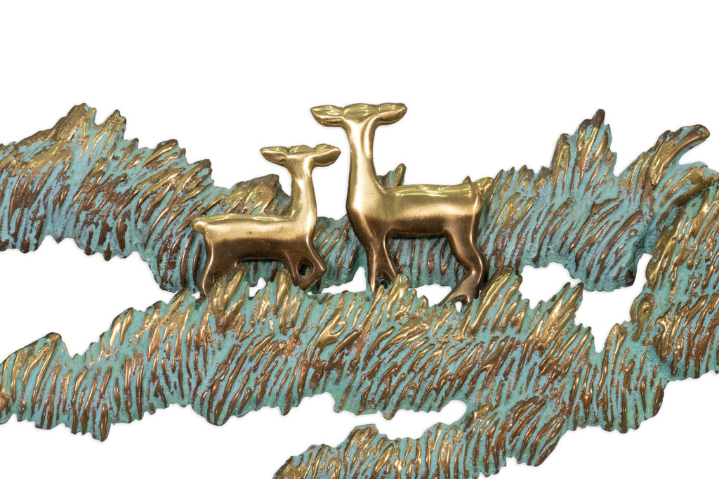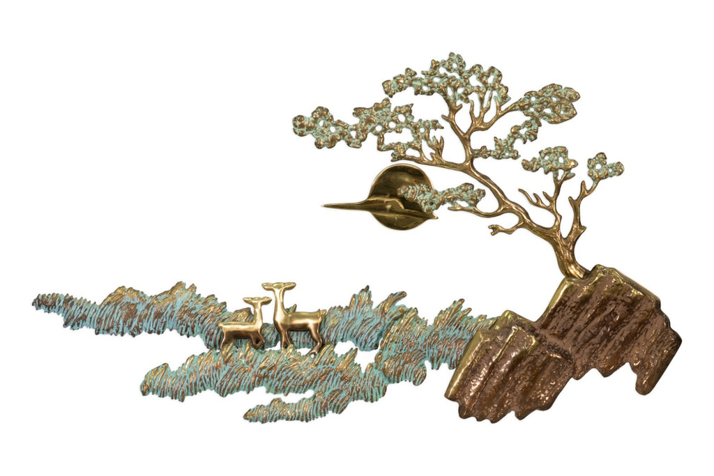 This vintage 1988 metal landscape sculpture by Bijan Jazai Shokatfard captures a poetic, stylized natural scene rendered in sculptural relief. Crafted in mixed metal tones, the composition features a windswept tree perched atop a rocky outcrop, balanced by an abstracted terrain below where two grazing deer introduce a quiet narrative element. The surface is enriched with a verdigris patina that contrasts beautifully against the warm brass and bronze hues, emphasizing texture, movement, and depth throughout the piece.