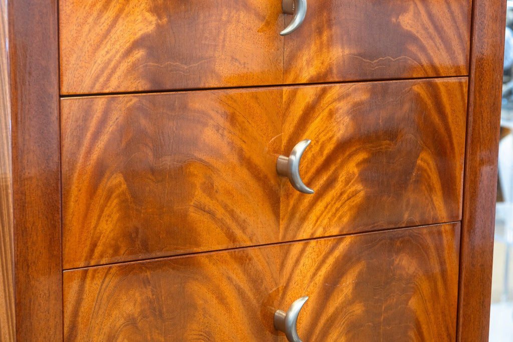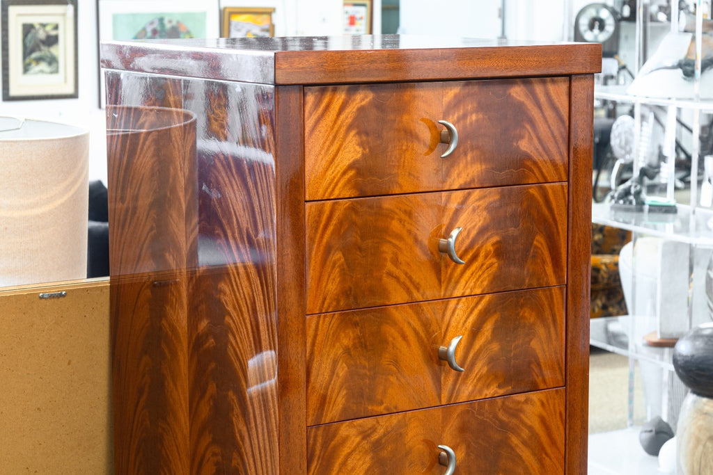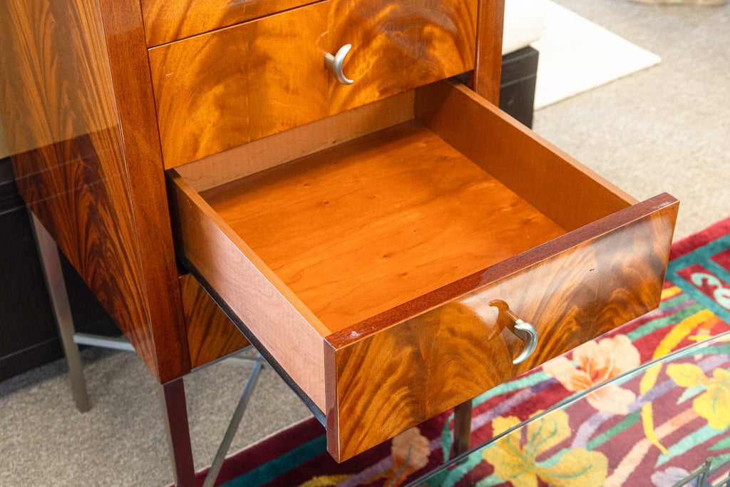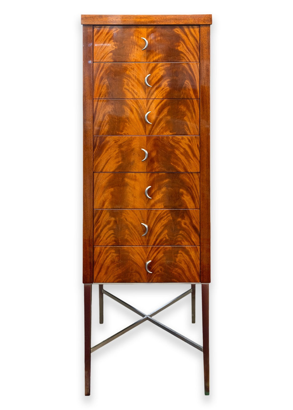 A vintage Greg Sheres Italian mahogany verite collection chest of drawers cabinet. This is a wonderful free standing cabinet featuring a jaw dropping Italian mahogany wood construction with a high gloss finish. The wood grain on this cabinet is truly the highlight with its overall simple, modern design. The face features a vertical row of 7 drawers, each with a unique metal pull handle matching the rest of the Verite collection. The base of the cabinet features four skinny metal legs with an x-shaped support connecting the legs. This cabinet is in very good overall condition. It measures 60.25 inches tall, and 20.75 x 20.75 inches wide.