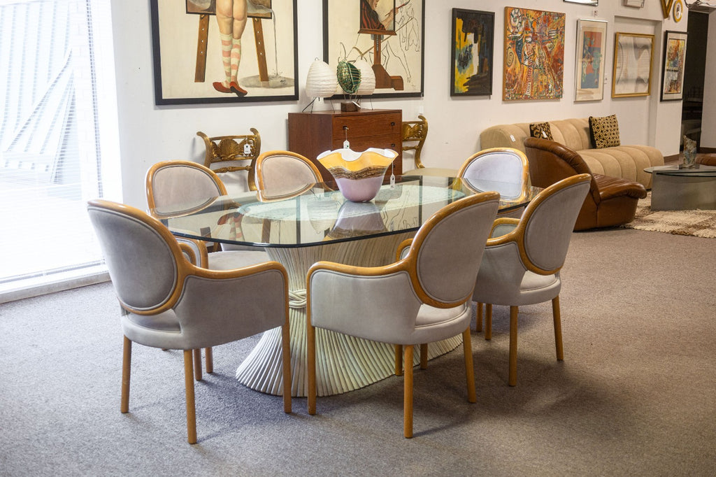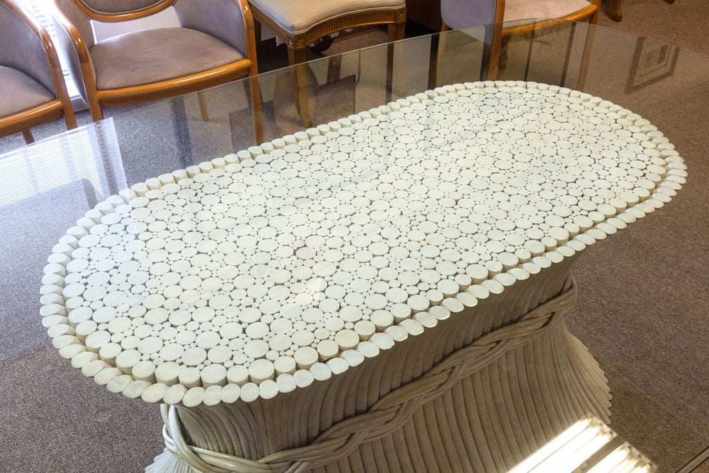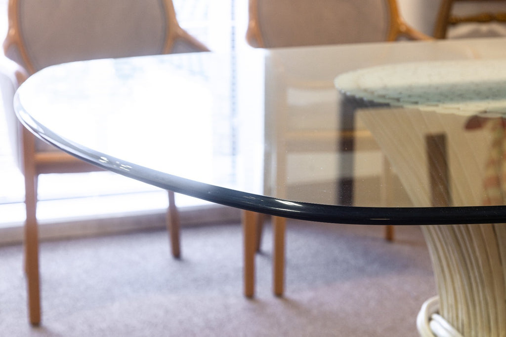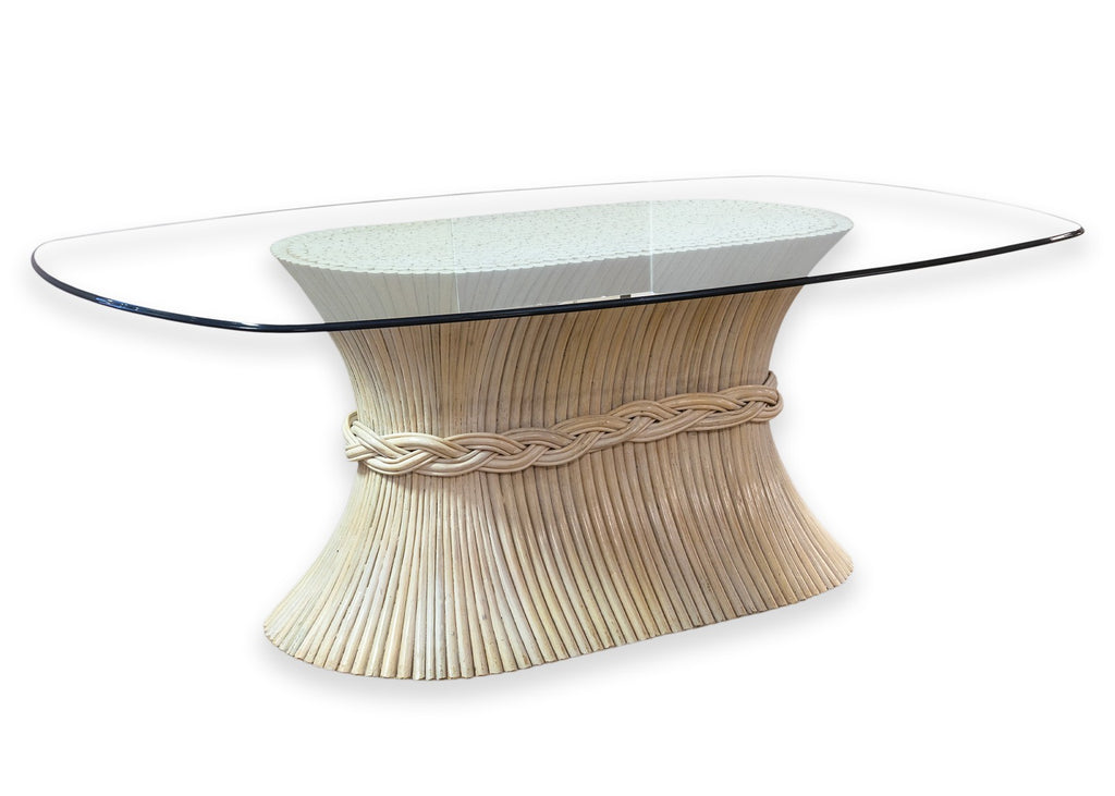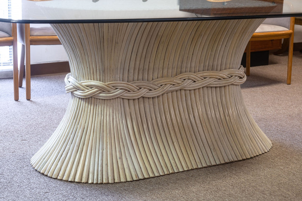 A vintage Dorothy McGuire Sheaf of Wheat dining table. This lovely mid century dining table features a glass and bamboo construction, a staple of McGuire designs. This table has a large rounded rectangular tabletop with beveled edges. The base is a large tapered pedestal of bamboo in an hourglass shape with an accenting braid wrapped around the center. This table is overall in good vintage condition. It measures 28.75 inches tall, 80 inches long, and 48 inches wide.