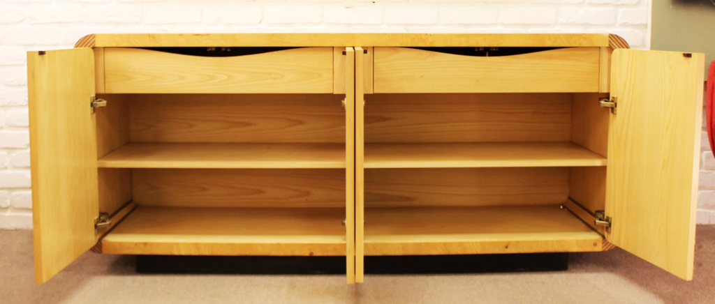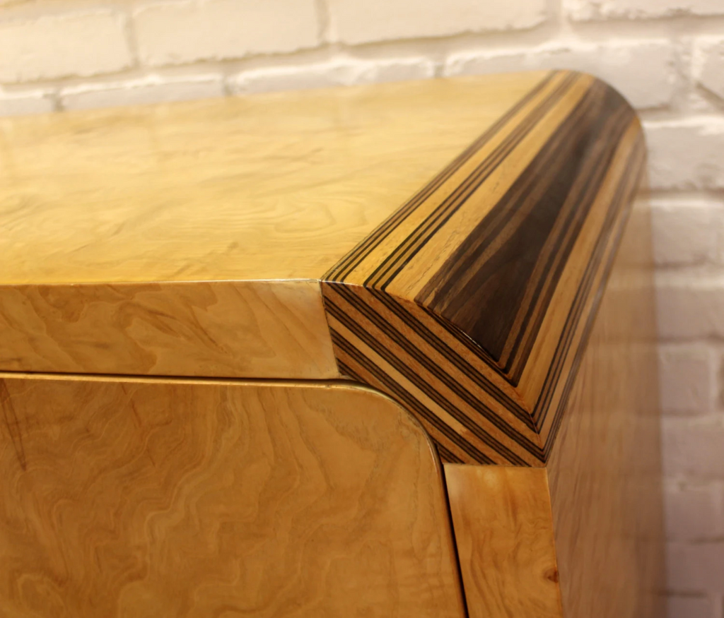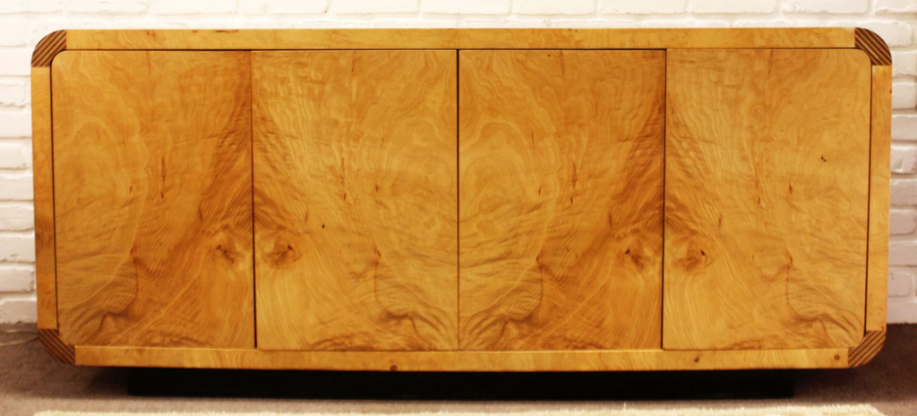 For your consideration is a wonderful, burl wood credenza, with gorgeously patterned, rounded edges, by Henredon. The sideboard has two shelves and two drawers. matching console table and stools are available in another listing. In excellent condition. The dimensions are 68" W x 19" D x 30" H.An impressive Henredon burl olive ash sideboard from the Scene Two collection. Superbly constructed from solid hardwoods with dovetail joints and sophisticated design features like rounded ebony corners.