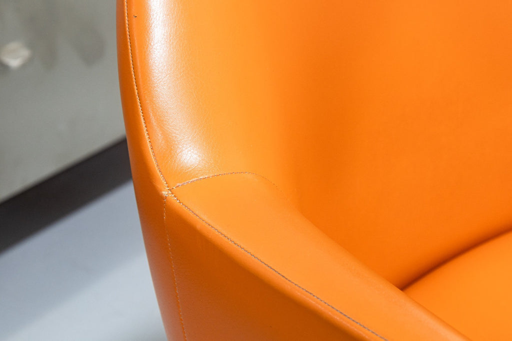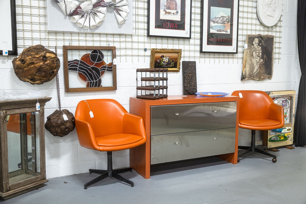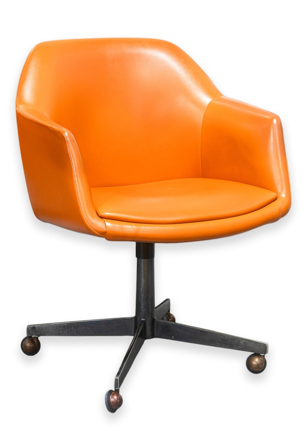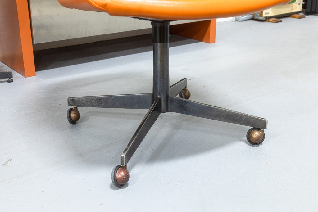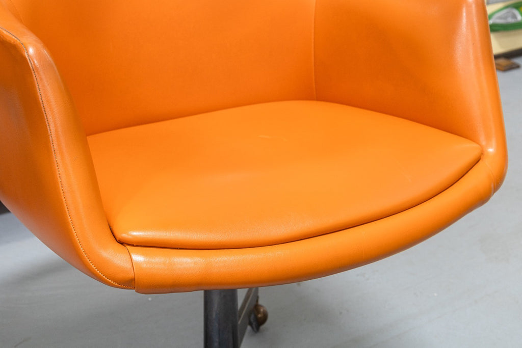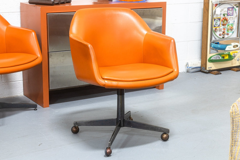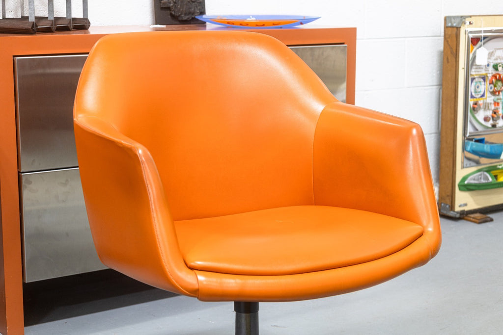 A vintage Steelcase 450 side chair with arms and casters. This classic mid-century modern accent chair has a classic modern style, finished with a wonderfully chic orange vinyl plastic upholstery. This chair has a one piece upper, and a lower metal frame with 4 legs and a swiveling base. The 450 series chair was notoriously a part of "Operation Skydrop", a famous marketing campaign in 1966. According to Steelcase, "To demonstrate the durability of the 450 Series chair a skydiver is strapped to the chair. At 1,000 feet the skydiver disengages from the chair, which hits the ground at approximately 100 mph. The base breaks off, but the shell remains undamaged." This particular chair is in good vintage condition, with just some wear to the upholstery and metal base. It measures 33.25 inches tall, 25 inches wide, and 25 inches deep. It has a seat height of 19 inches, a seat width of 19 inches, a seat depth of 18 inches, an arm height of 7 inches, and a back height of 15 inches.