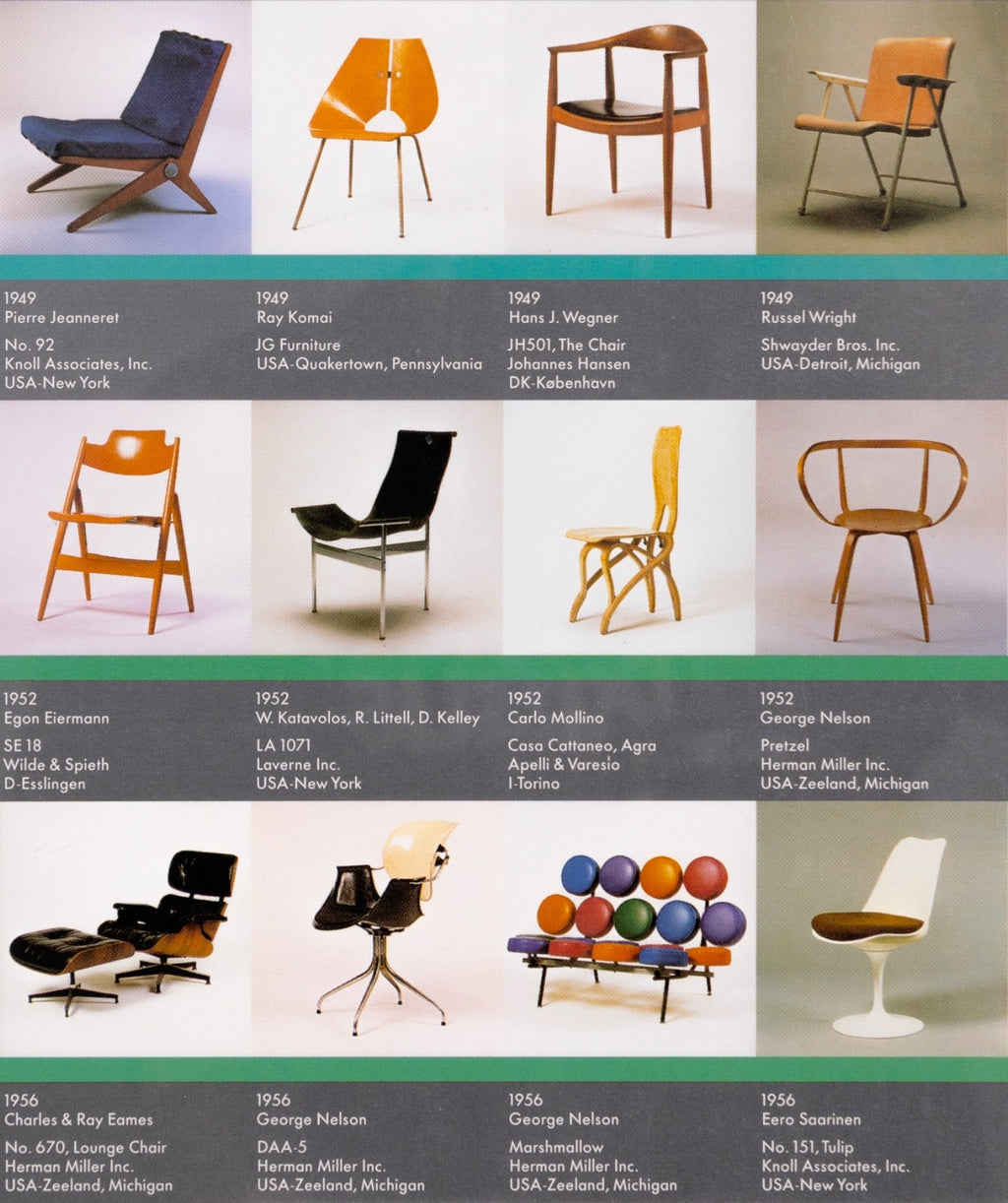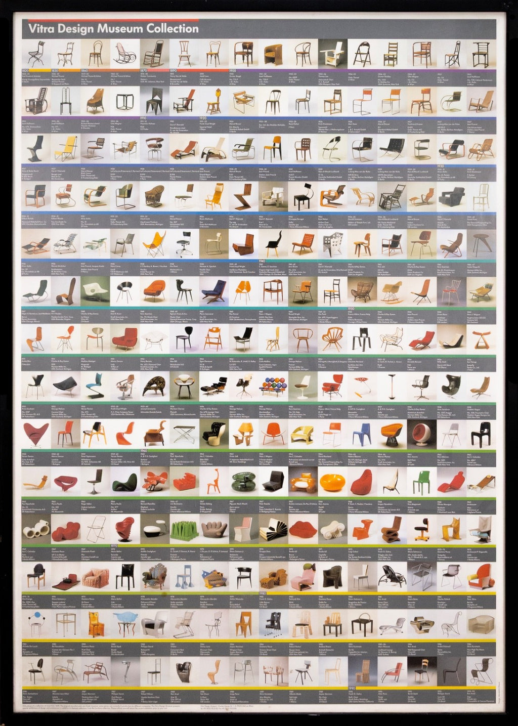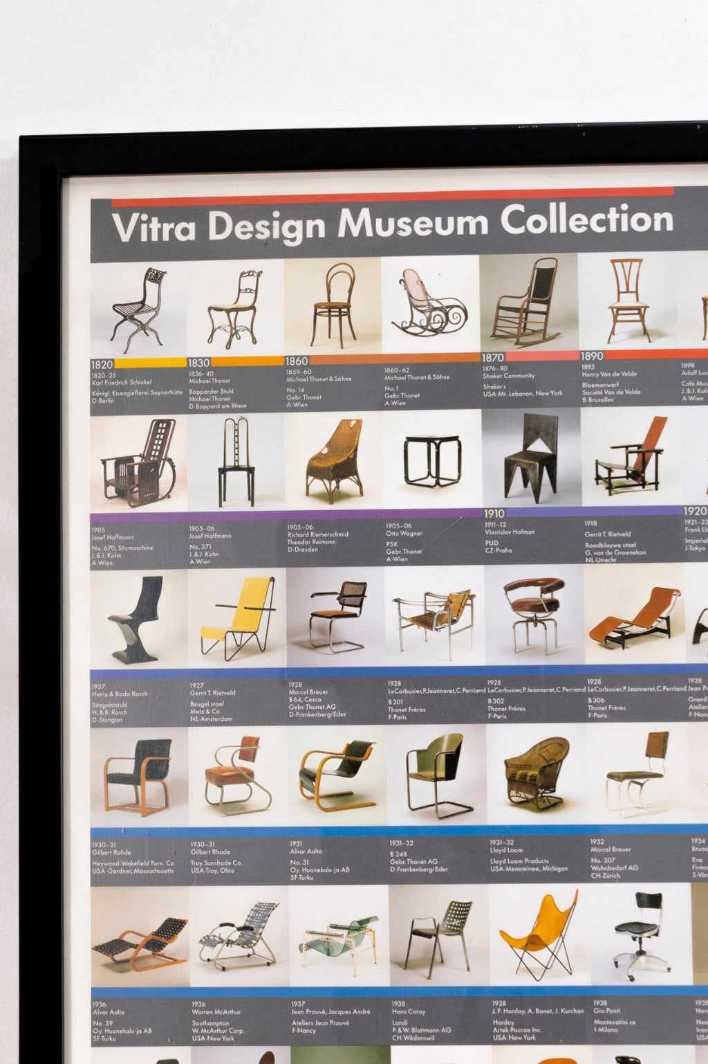 A captivating visual archive of modern design history, this vintage Vitra Design Museum Chair Collection poster showcases over a hundred iconic chairs spanning more than a century of innovation. Each miniature image is meticulously labeled with the chair’s name, designer, and year, offering a timeline of pioneering forms and materials from celebrated figures such as Charles & Ray Eames, Verner Panton, Marcel Breuer, and Eero Saarinen. Arranged in chronological and stylistic order, the poster serves as both an educational tool and a design statement. Ideal for collectors, interior designers, and enthusiasts of modernist furniture, this framed piece is a celebration of form, function, and artistic vision. The poster is in good condition. It measures 48 inches in height, 34.5 inches in width, and 1 inch in depth.