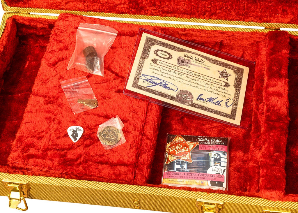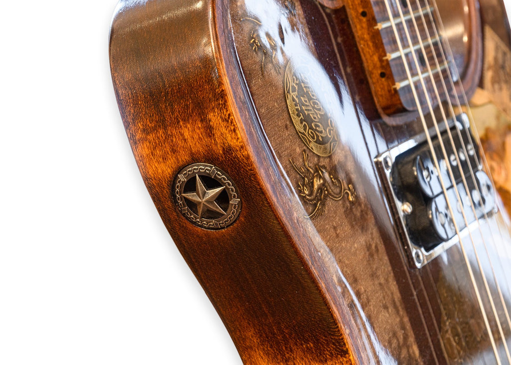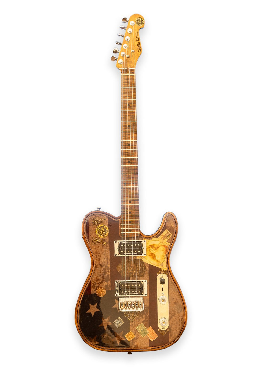 A unique T-style electric guitar handcrafted by the Walla Walla Guitar Company, renowned for their custom, artistically designed instruments. This example features a richly decorated body with layered imagery including vintage stamps, stars, and portrait motifs under a high-gloss finish, creating a one-of-a-kind visual presentation. Outfitted with dual humbucking pickups, modern bridge hardware, and a maple neck with rosewood fretboard, the guitar combines distinctive aesthetics with professional-level playability. A striking blend of craftsmanship, design, and performance from one of Washington's celebrated boutique builders. From a private collection. In very good condition. Full condition reports are available upon request.