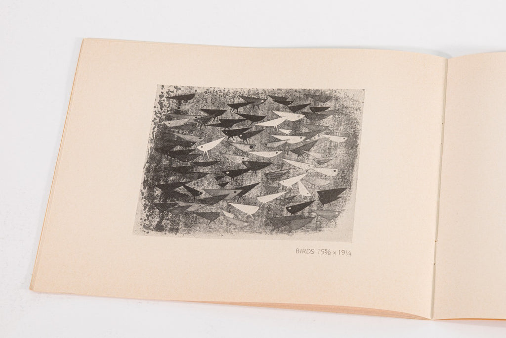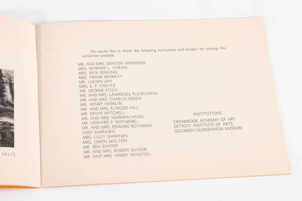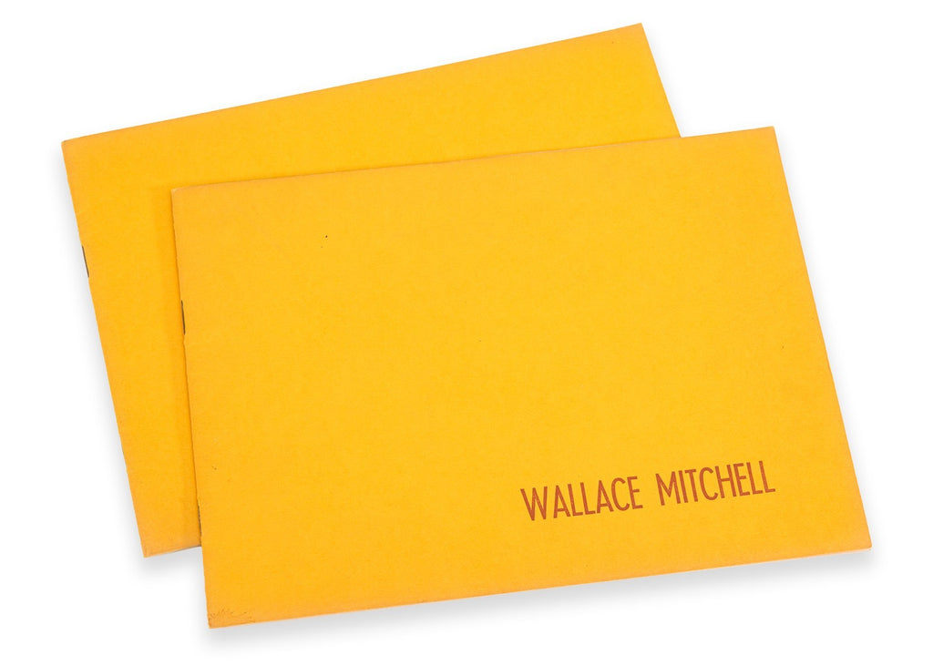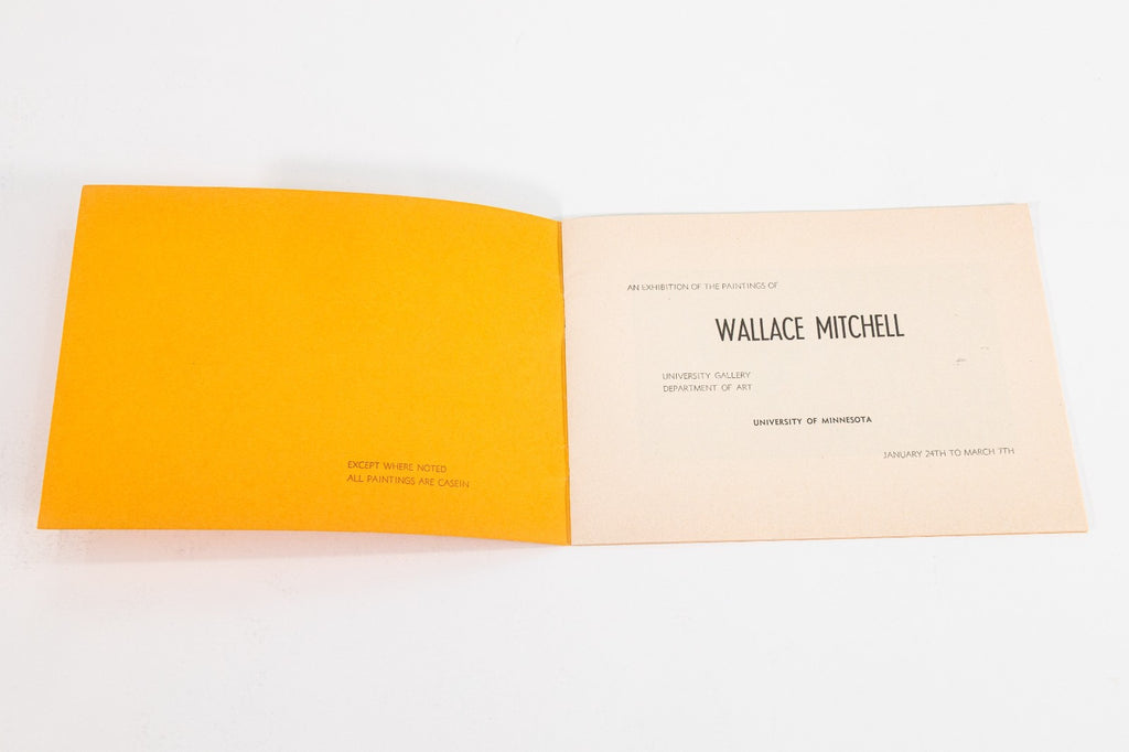A set of two original exhibition booklets documents a 1964 retrospective of American artist Wallace Mitchell, held at the University of Minnesota. The catalog features reproductions of Mitchell’s abstract casein paintings, including geometric compositions and patterned works such as Birds, X and O, and Processional. Mitchell was a prominent figure in American modernist painting and longtime educator at Cranbrook Academy of Art. The booklet acknowledges key institutional lenders such as the Detroit Institute of Arts, Solomon R. Guggenheim Museum, and Cranbrook Academy, as well as notable supporters including Eero and Lilly Saarinen. A piece of mid-century exhibition ephemera, this pair of booklets is ideal for collectors of American abstraction, Midwest modernism, or institutional art archives. From a private collection. Dimensions: 6”h x 8”w x .25”d. In very good vintage condition consistent with age.