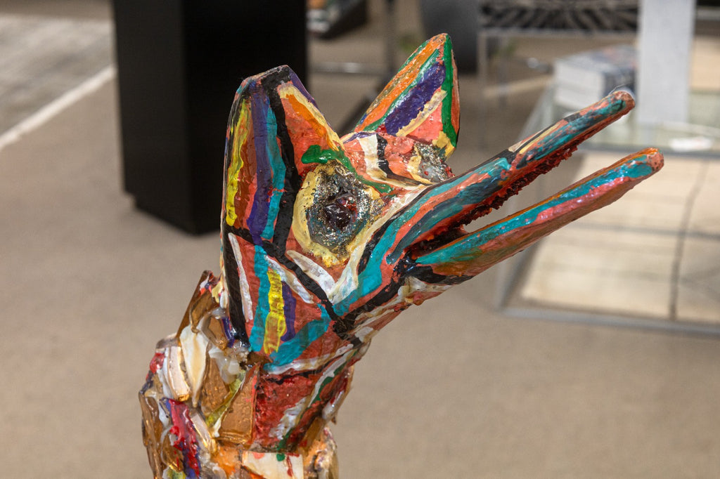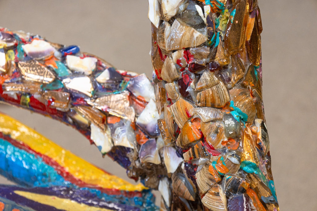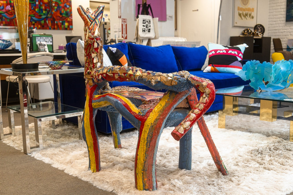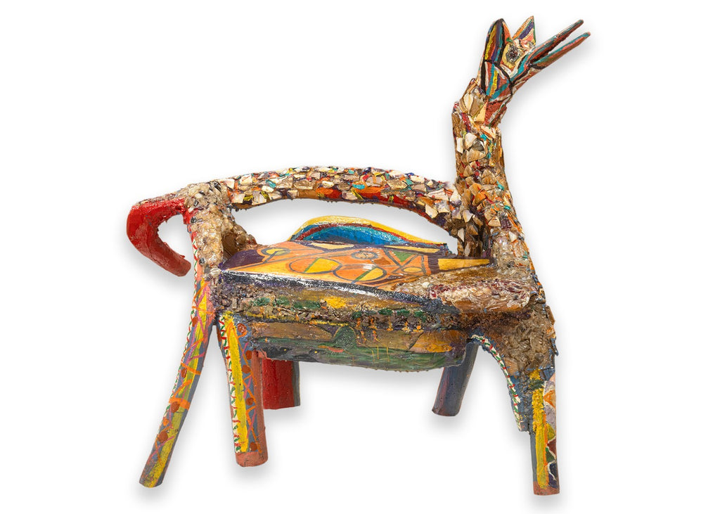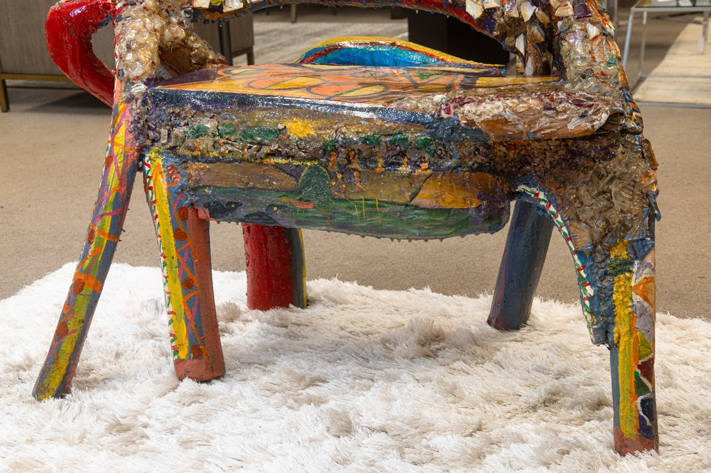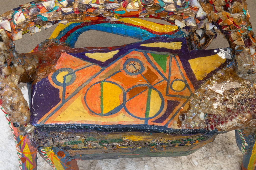 A vibrant and imaginative folk-art sculpture by Detroit artist Willie Leroy Elliot Jr., titled "Wolf Bench". Created circa 1990, this unique functional artwork combines seating form with expressive sculptural detail, rendered in wood, paint, and colorful mosaic inlays. The piece embodies Elliot's distinctive style, blending raw, hand-built construction with bold, kaleidoscopic surfaces that celebrate vernacular creativity and urban folk traditions. Both whimsical and powerful, the wolf form is transformed into a hybrid object - part sculpture, part functional bench - making it a striking example of Detroit's grassroots art culture. From a private collection. Dimensions: 42"h x 40"w x 21"d. In very good vintage condition. Full condition reports are available upon request.