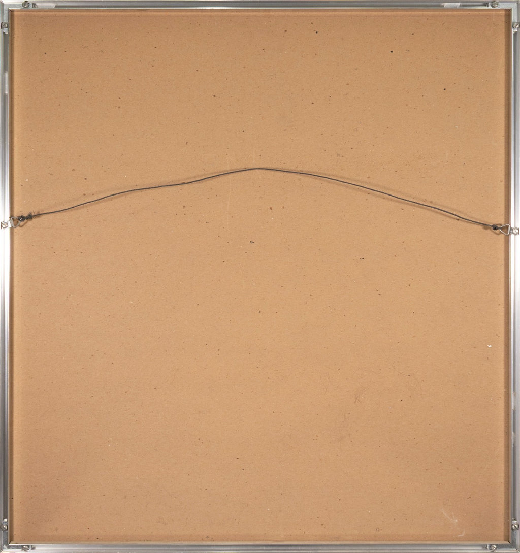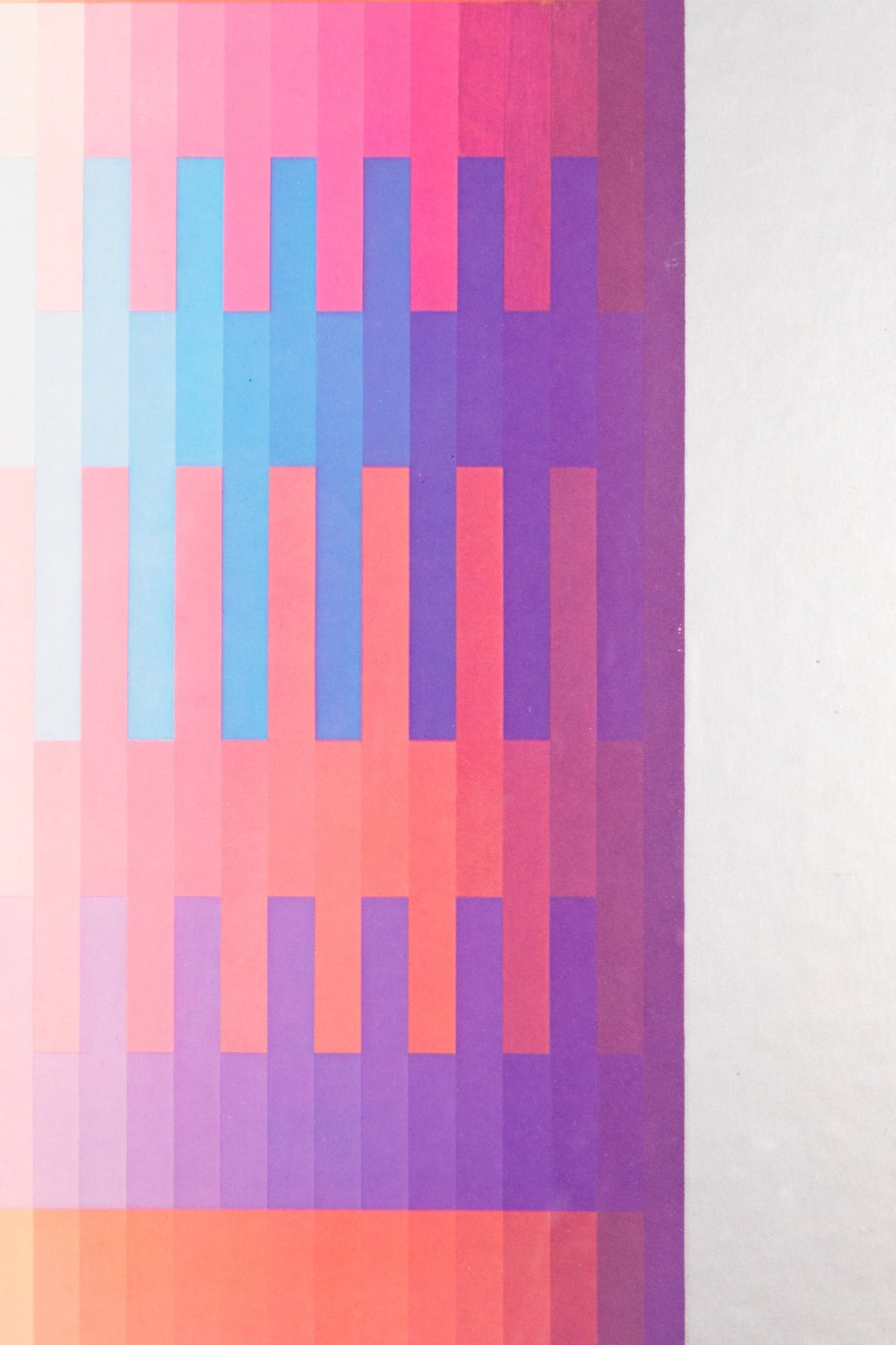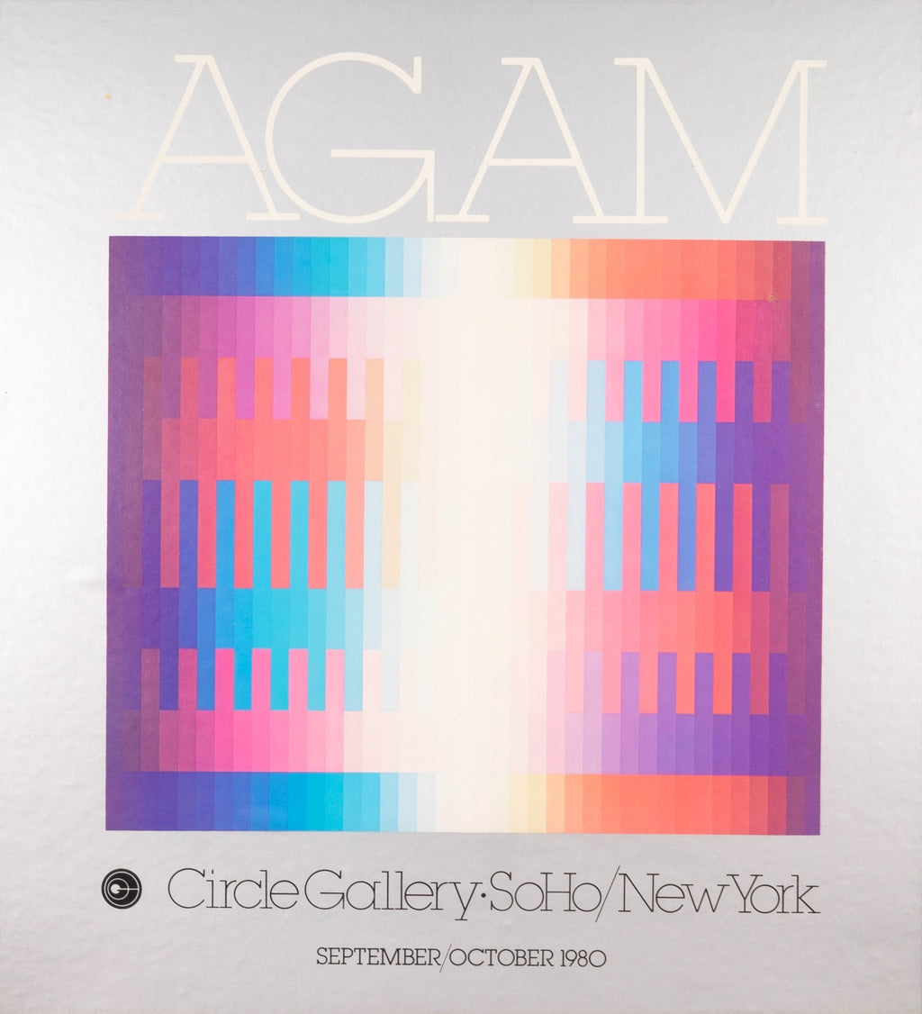 This vibrant exhibition poster features the dynamic geometric work of Yaacov Agam, a pioneer of kinetic and optical art. Created for Agam's solo show at Circle Gallery in SoHo, New York, during September and October 1980, the poster presents a radiant field of vertical bars in shifting hues of pink, red, blue, and violet that blend toward a luminous center. With the artist's name boldly displayed in white at the top, the design captures Agam's signature exploration of visual perception and color transformation. A striking collectible piece, the poster reflects Agam's international acclaim and the vibrant energy of the 1980s SoHo art scene. From a private collection. Dimensions: 28.5"h x 26.5"w x 1"d (framed). In very good condition. Full condition reports available upon request.